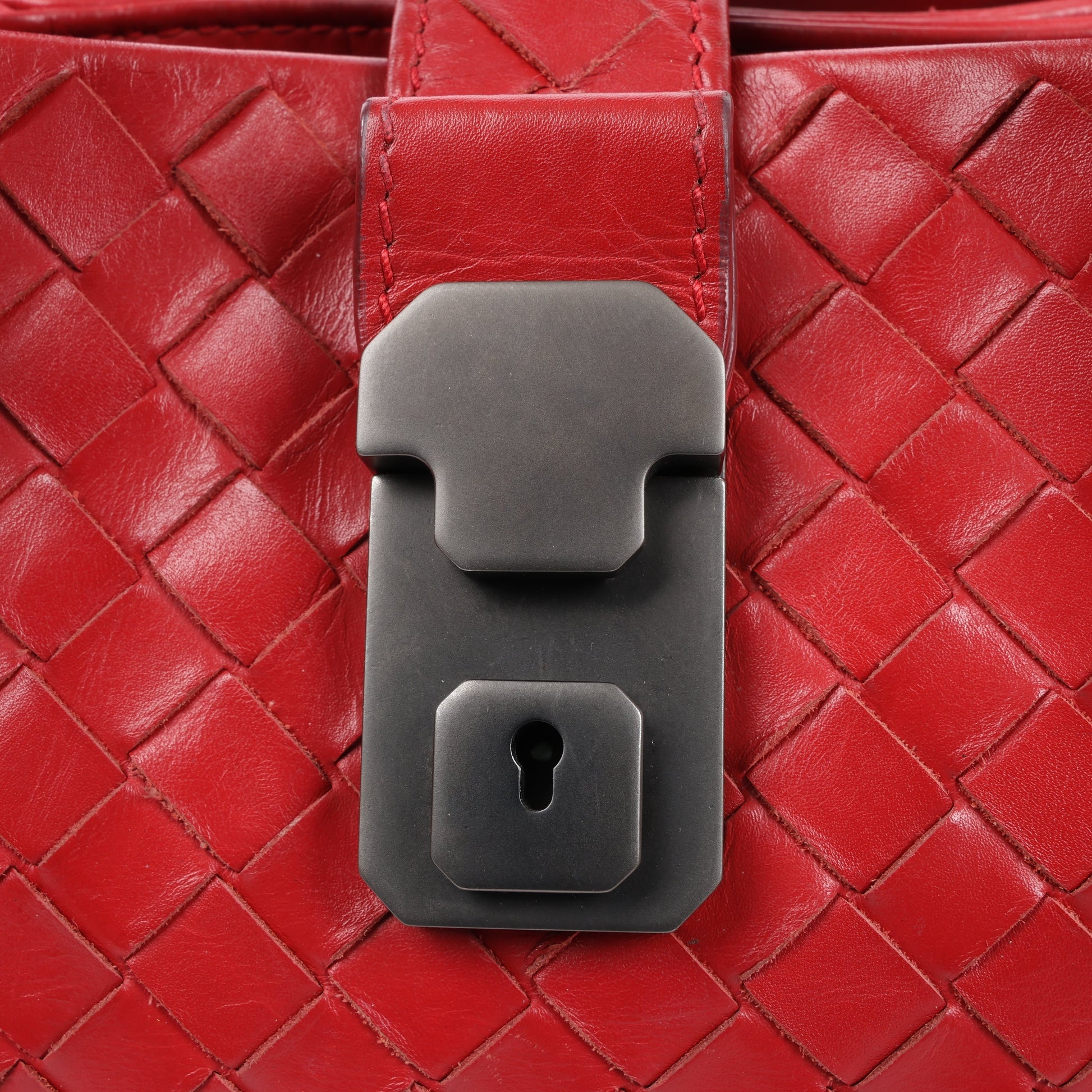 Die Bottega Veneta Intrecciato Roma Handtasche aus leuchtend rotem Leder präsentiert die ikonische Flechtkunst der Marke. Mit zwei Griffen, einem eleganten Schnallenverschluss und einem abnehmbaren Riemen ist sie ein zeitloses und zugleich markantes Statement italienischen Luxus.