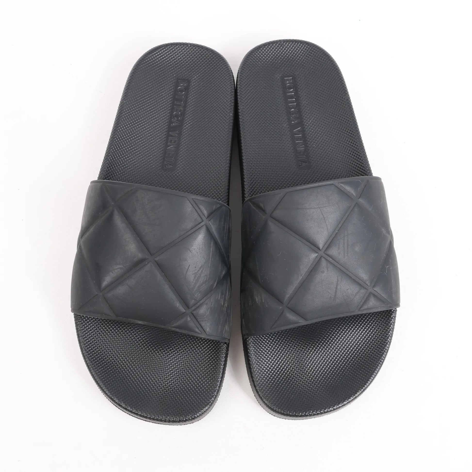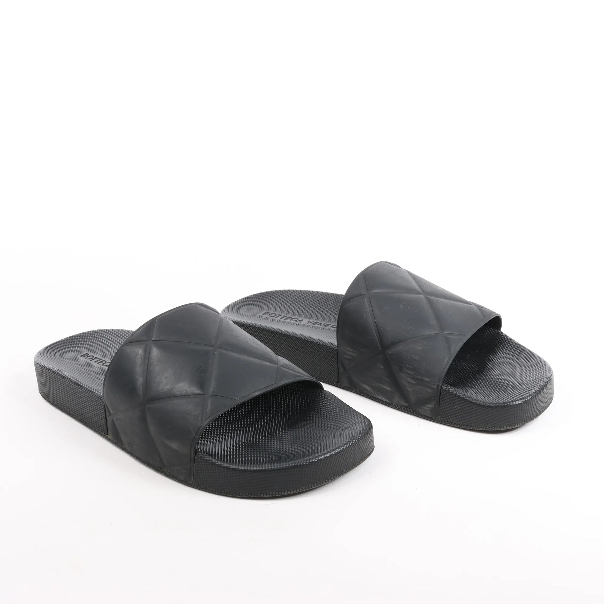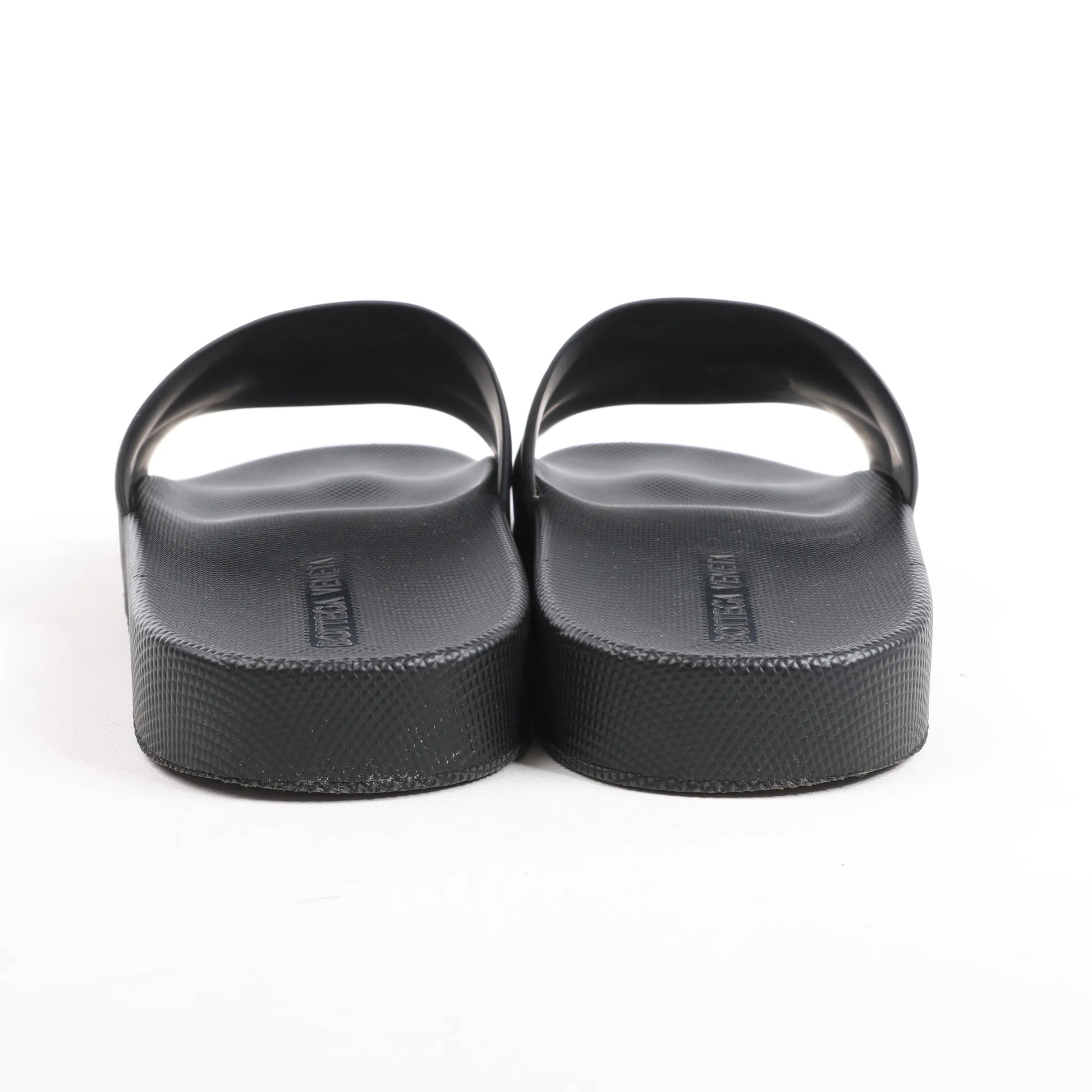 Die flachen Bottega Veneta Intrecciato Rubber BV Slides in Schwarz, Größe 40 EU, bieten eine moderne Interpretation des charakteristischen Webmusters der Marke. Hergestellt aus strapazierfähigem Gummi mit geprägten Intrecciato-Details, bieten diese Slides eleganten, minimalistischen Komfort.