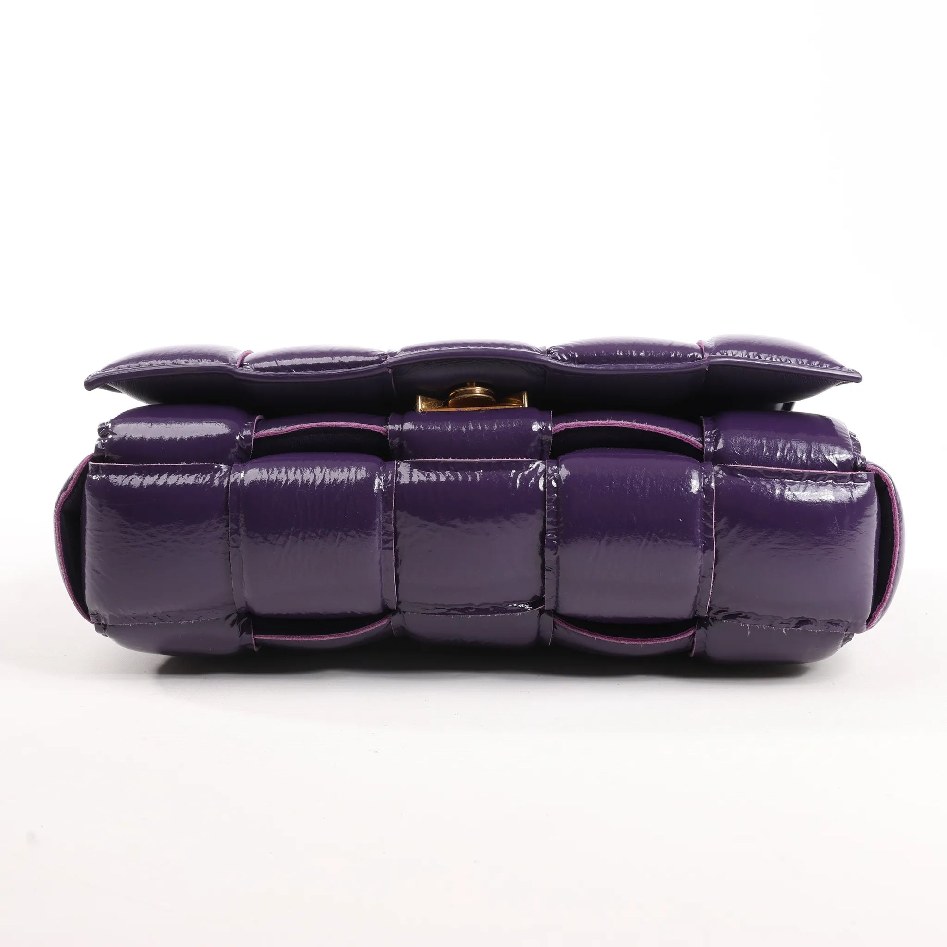 Mit der Bottega Veneta Padded Cassette Schultertasche aus edlem, violettem Lackleder ziehen Sie alle Blicke auf sich. Sie besticht durch das ikonische Maxi Intrecciato-Flechtmuster und die charakteristische goldfarbene Dreiecksschnalle. Ein kühnes und zugleich elegantes Statement-Piece.