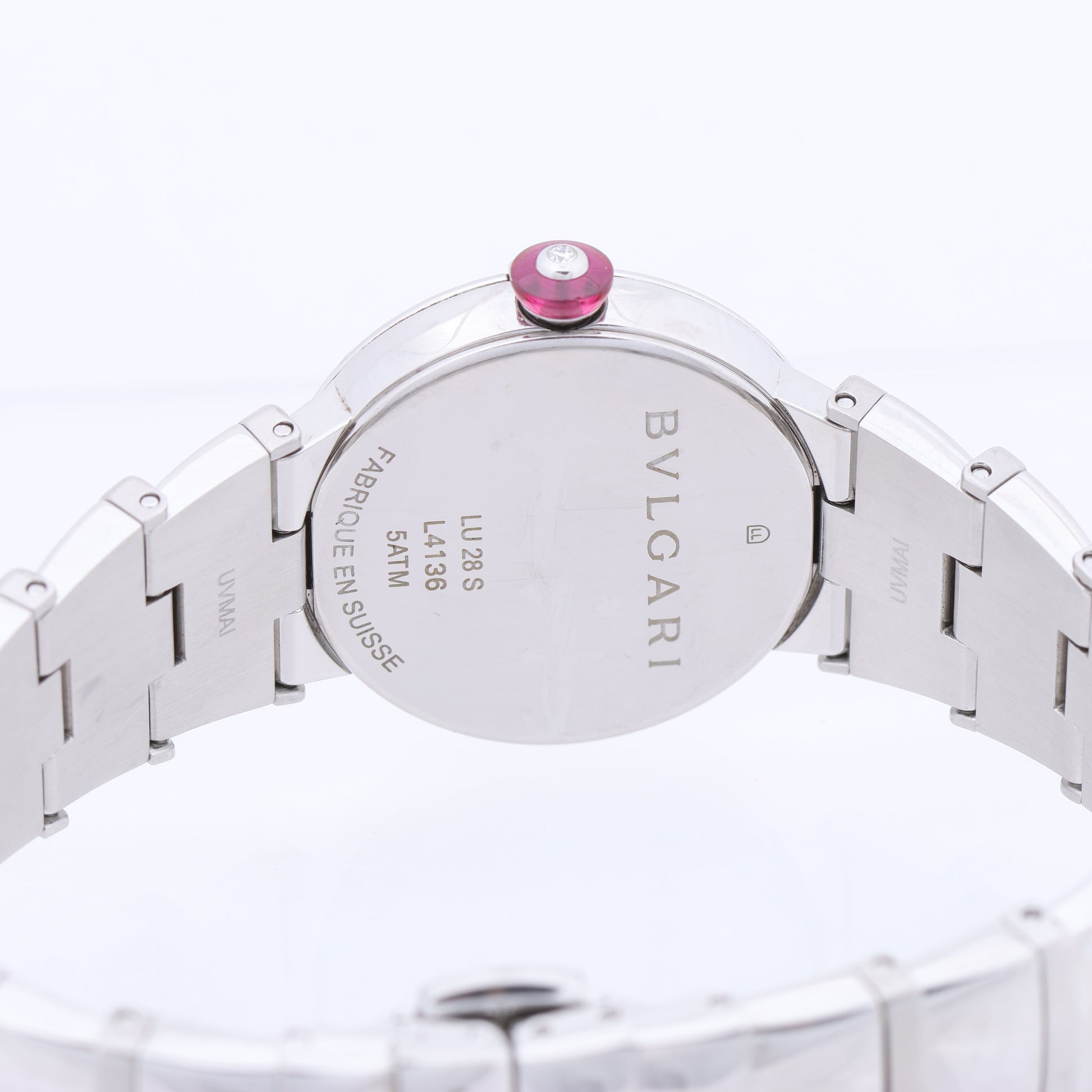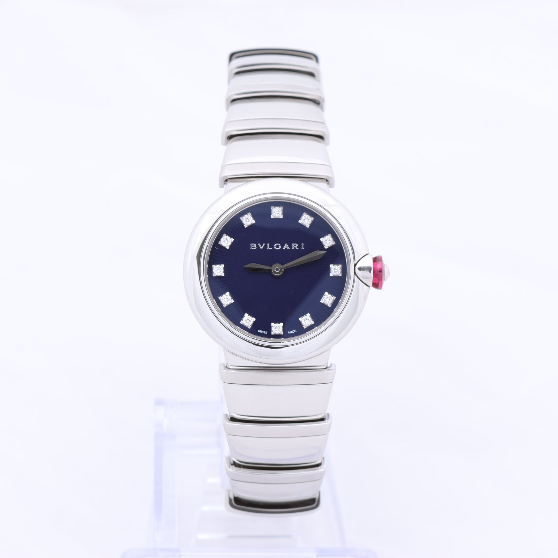 Die Bvlgari Lucea LU28S L4136 SS QZ Blue-Face Uhr strahlt mit ihrem tiefblauen Zifferblatt mit Diamant-Stundenmarkierungen Eleganz aus. Gefertigt aus Edelstahl mit einer markanten rosa Cabochon-Krone, vereint diese Uhr Luxus und Raffinesse.