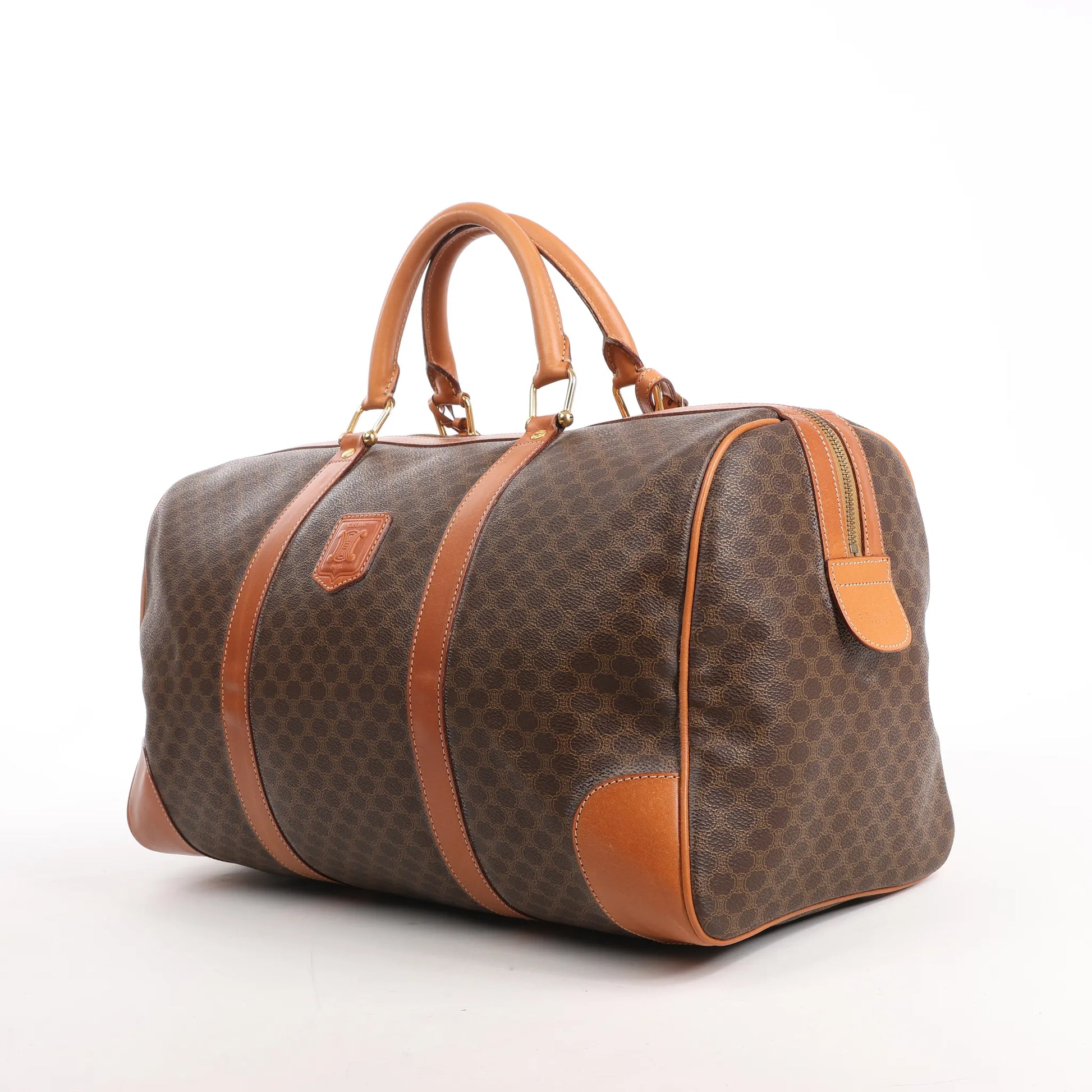 Reisen Sie stilvoll und zeitlos mit der Celine Macadam Boston Reisetasche aus charakteristischem braunem PVC mit Akzenten aus hellbraunem Leder. Ihr geräumiges Inneres und die strukturierte Form vereinen Eleganz und Funktionalität – perfekt für Wochenendtrips oder Kurzurlaube.