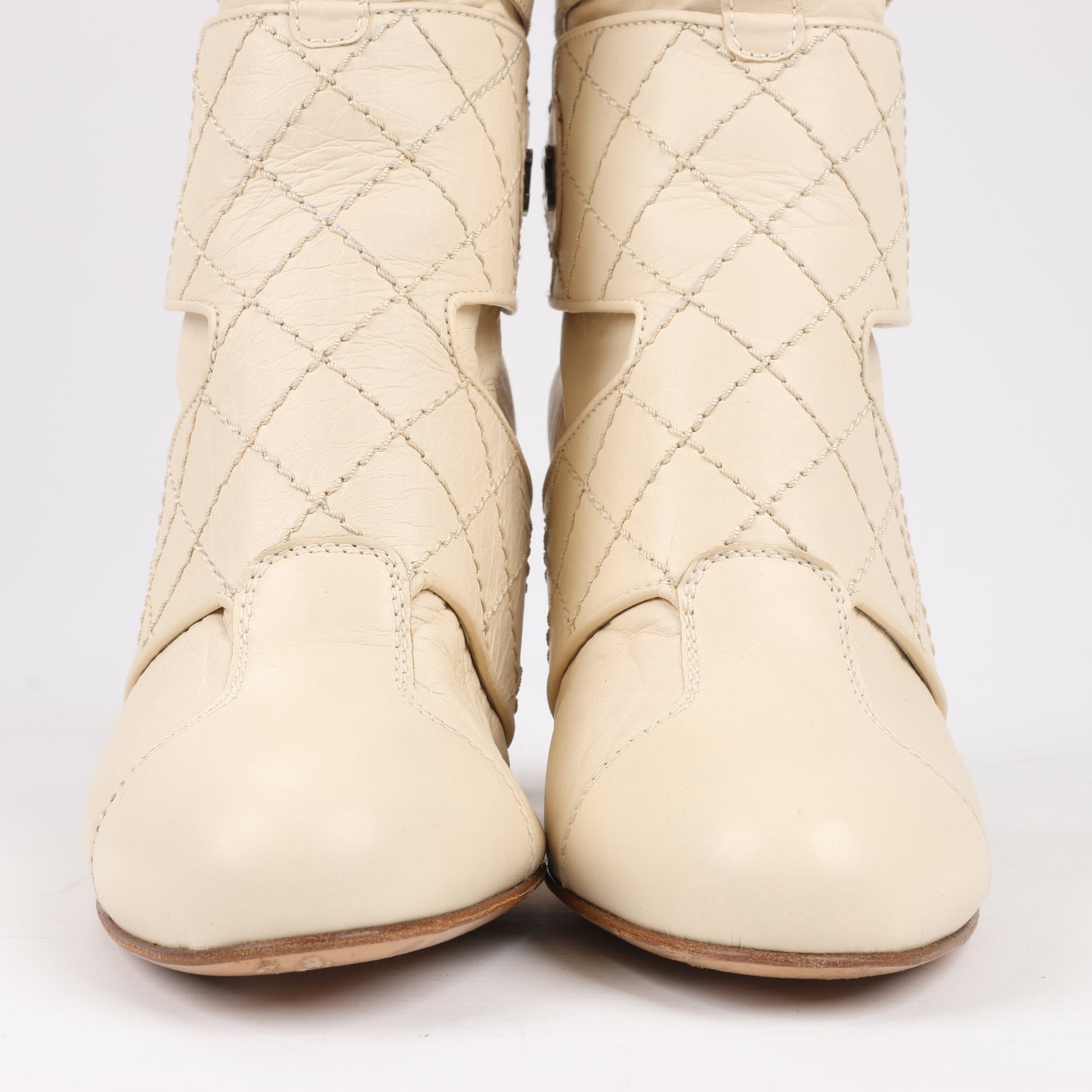 Veredeln Sie Ihren Stil mit diesen seltenen Chanel Coco Mark Matelassé Lederstiefeln in Elfenbein. Mit dem ikonischen Steppmuster, dem silberfarbenen CC-Logo und dem schicken, spitz zulaufenden Absatz strahlen sie zeitlose Eleganz aus. Ein Must-have! Größe 38,5 EU.