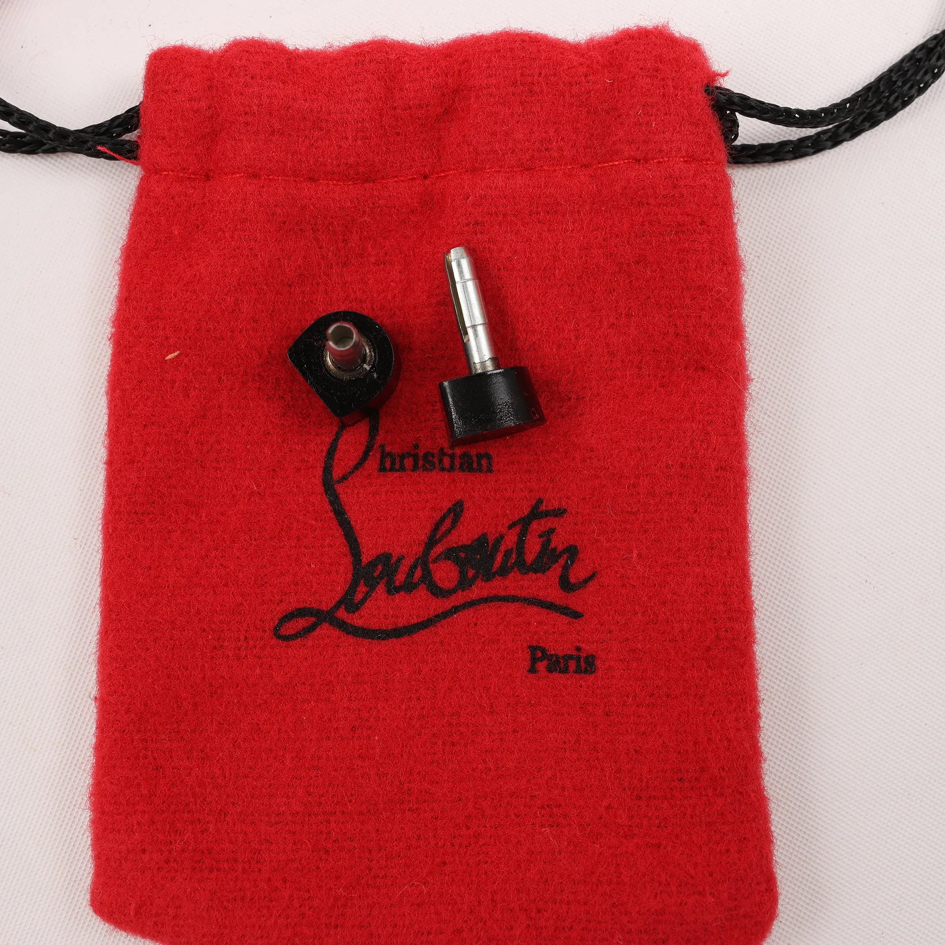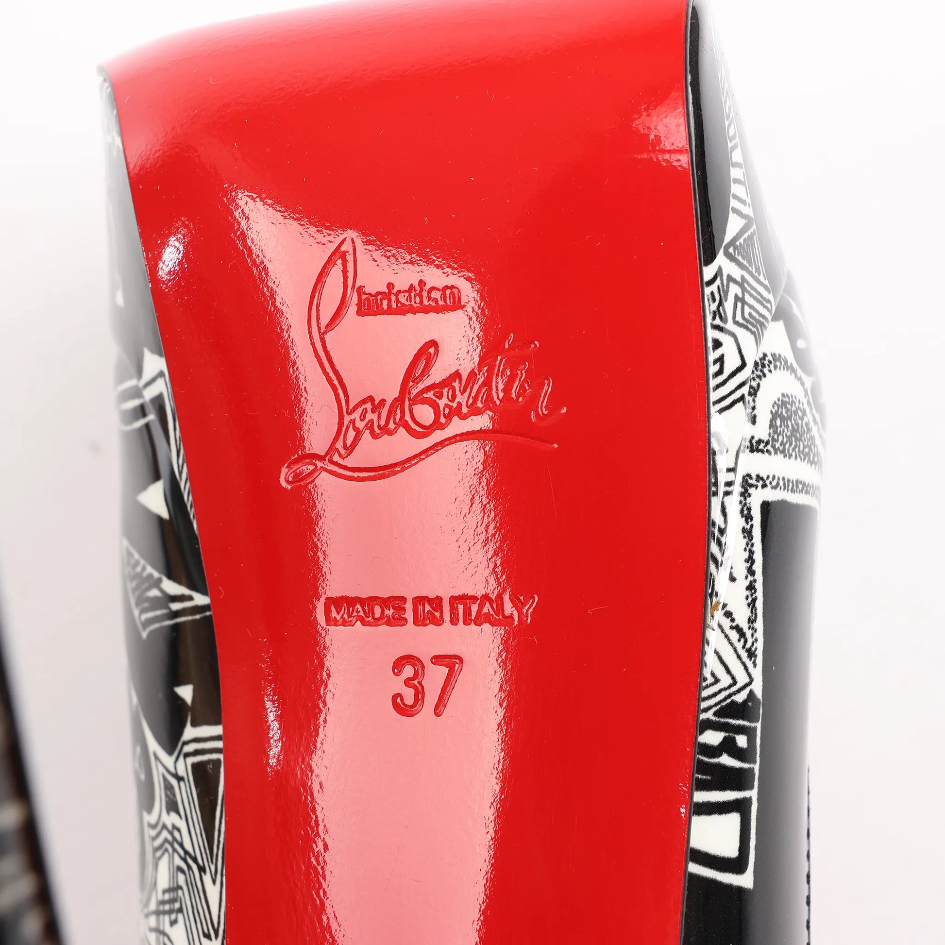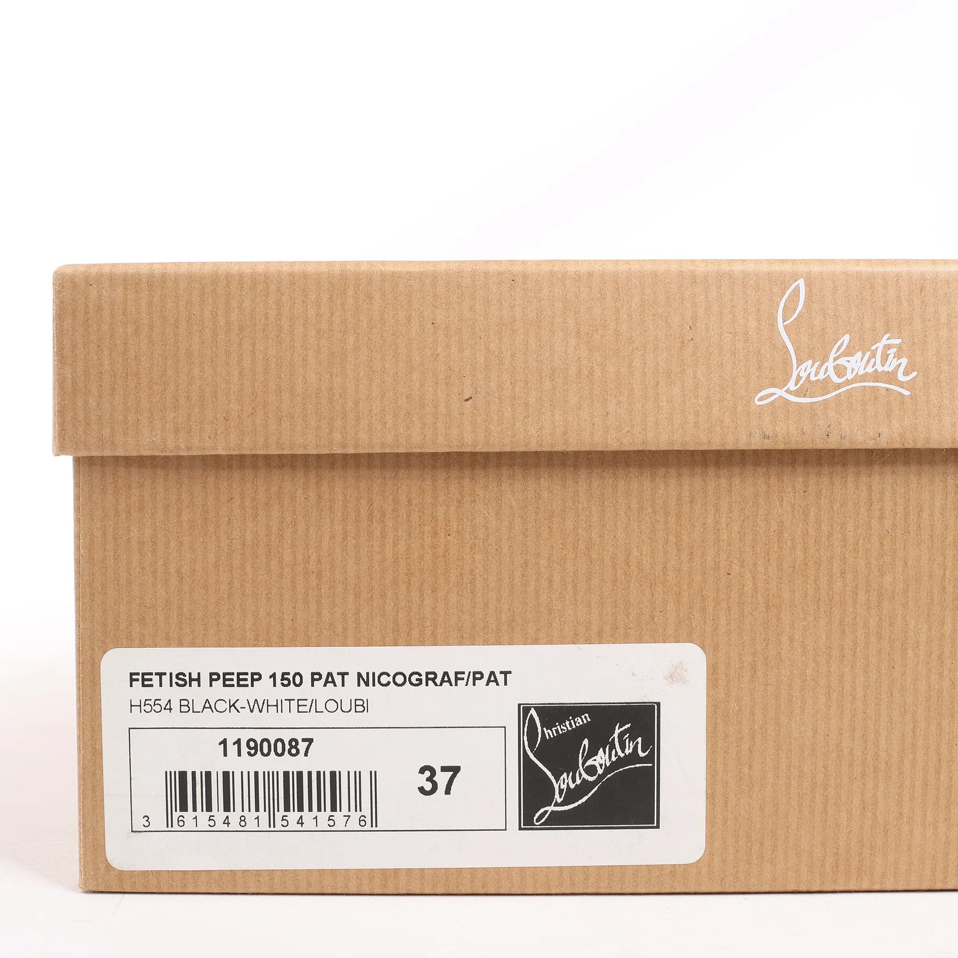 Die Christian Louboutin FETISH PEEP 150 Heels aus schwarzem Nicographic-Lackleder sorgen für einen eindrucksvollen Stil mit dramatischen Stiletto-Absätzen. Dieser offene Pumps in Größe 37 EU besticht durch einen auffälligen Grafikdruck und die charakteristische rote Sohle – ein echter Hingucker bei jedem Schritt.