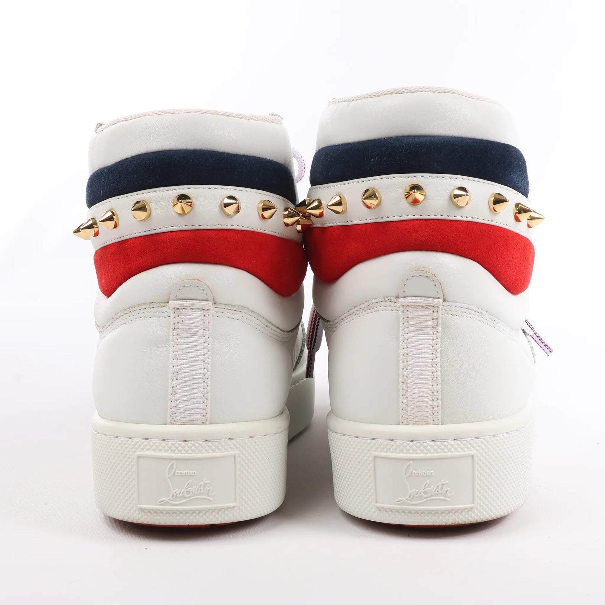 Die auffälligen und stylischen Christian Louboutin Spike Studs High-Top-Sneaker aus weißem Leder (Größe 42,5 EU) vereinen Luxus mit Street-Flair. Mit den charakteristischen Spikes an der Spitze, dreifarbigen Wildlederakzenten und goldenen Nieten setzen diese Sneaker ein markantes Statement.