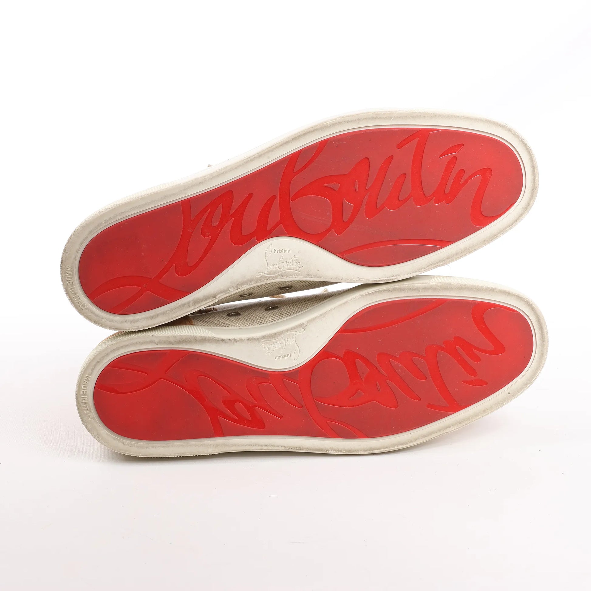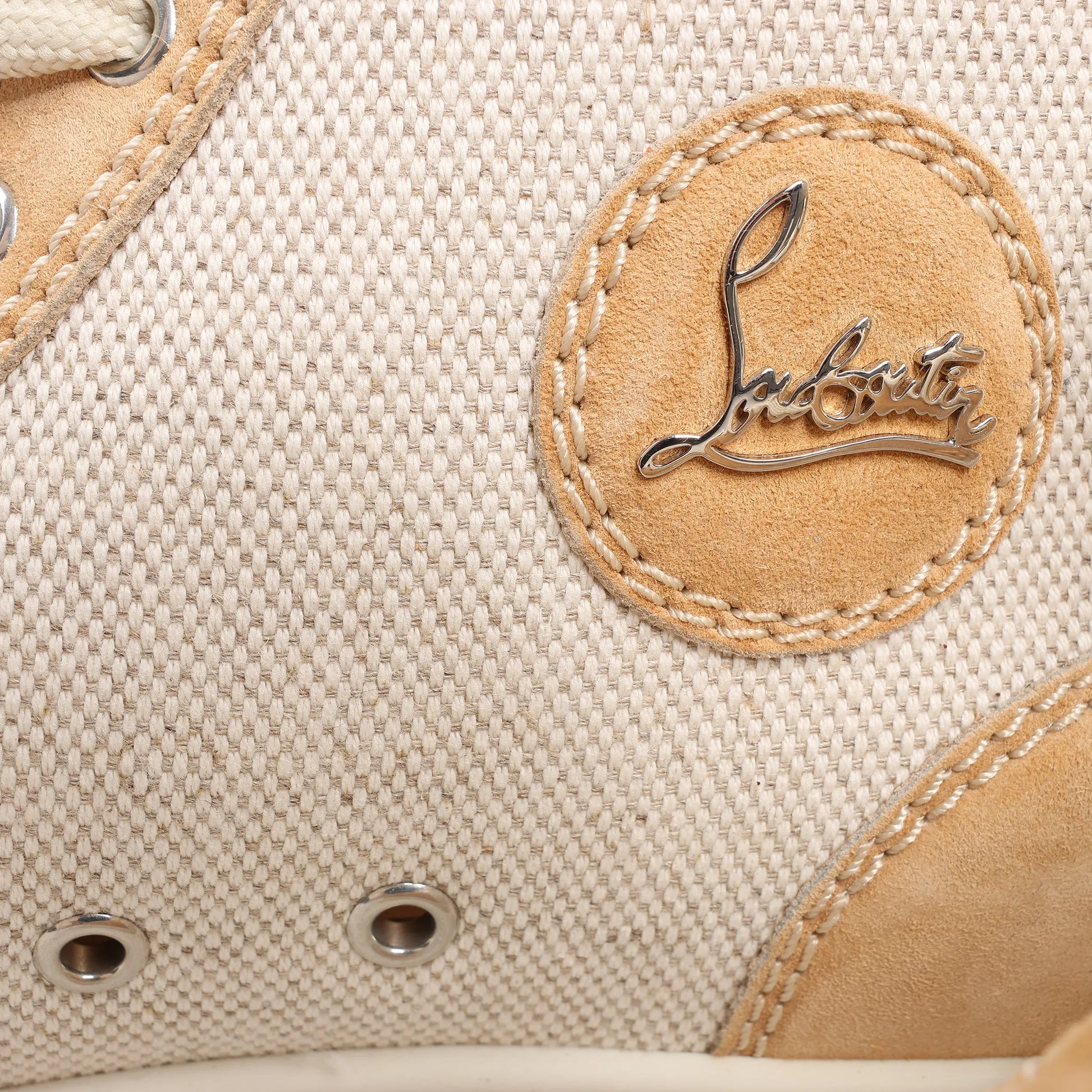Entdecken Sie den raffinierten Casual-Style mit diesen High-Top-Sneakers von Christian Louboutin in Beige, Größe 43 EU. Aus weichem Wildleder und Canvas gefertigt, vereinen sie sportliche Eleganz mit luxuriösem Komfort – ideal für den Alltag mit Designer-Touch.