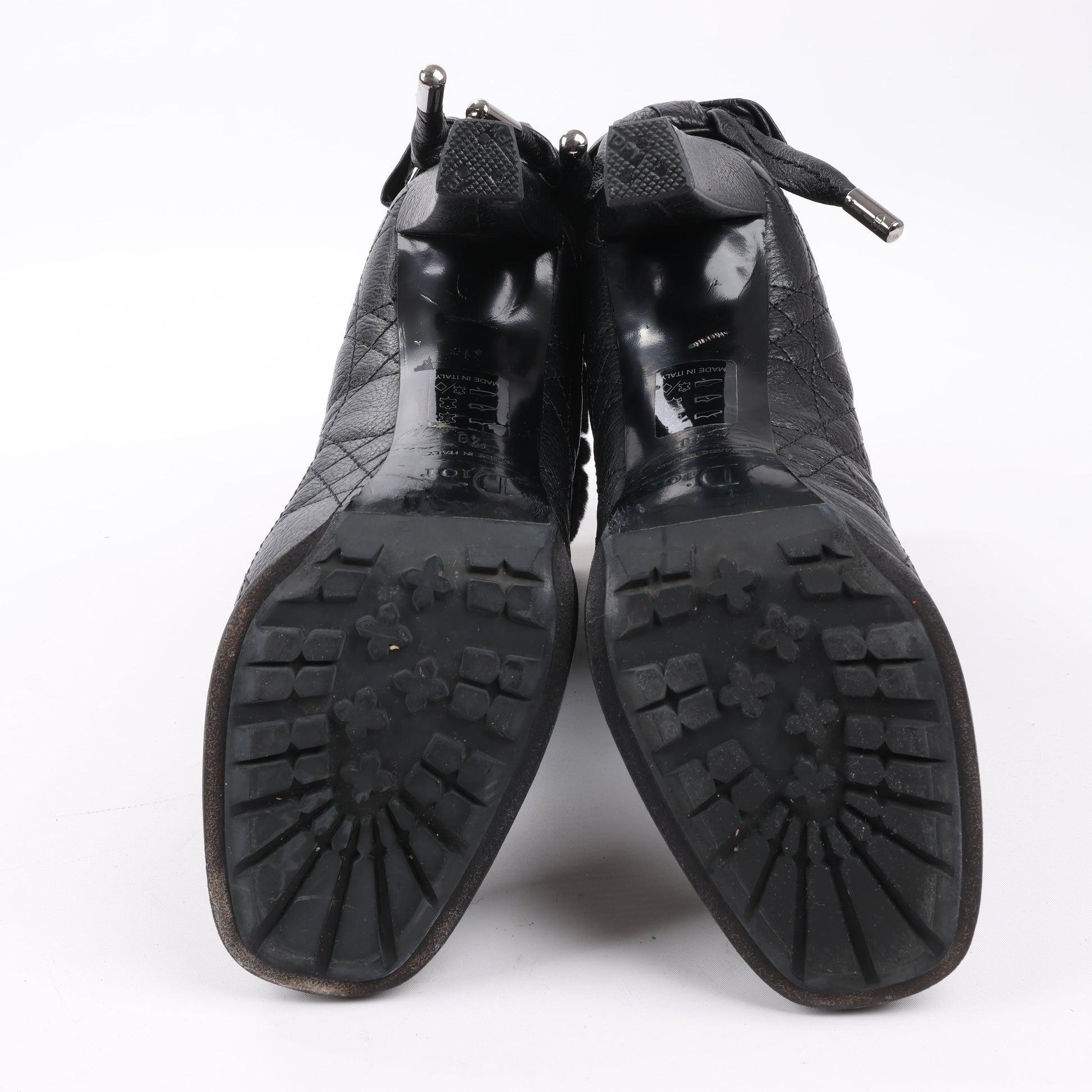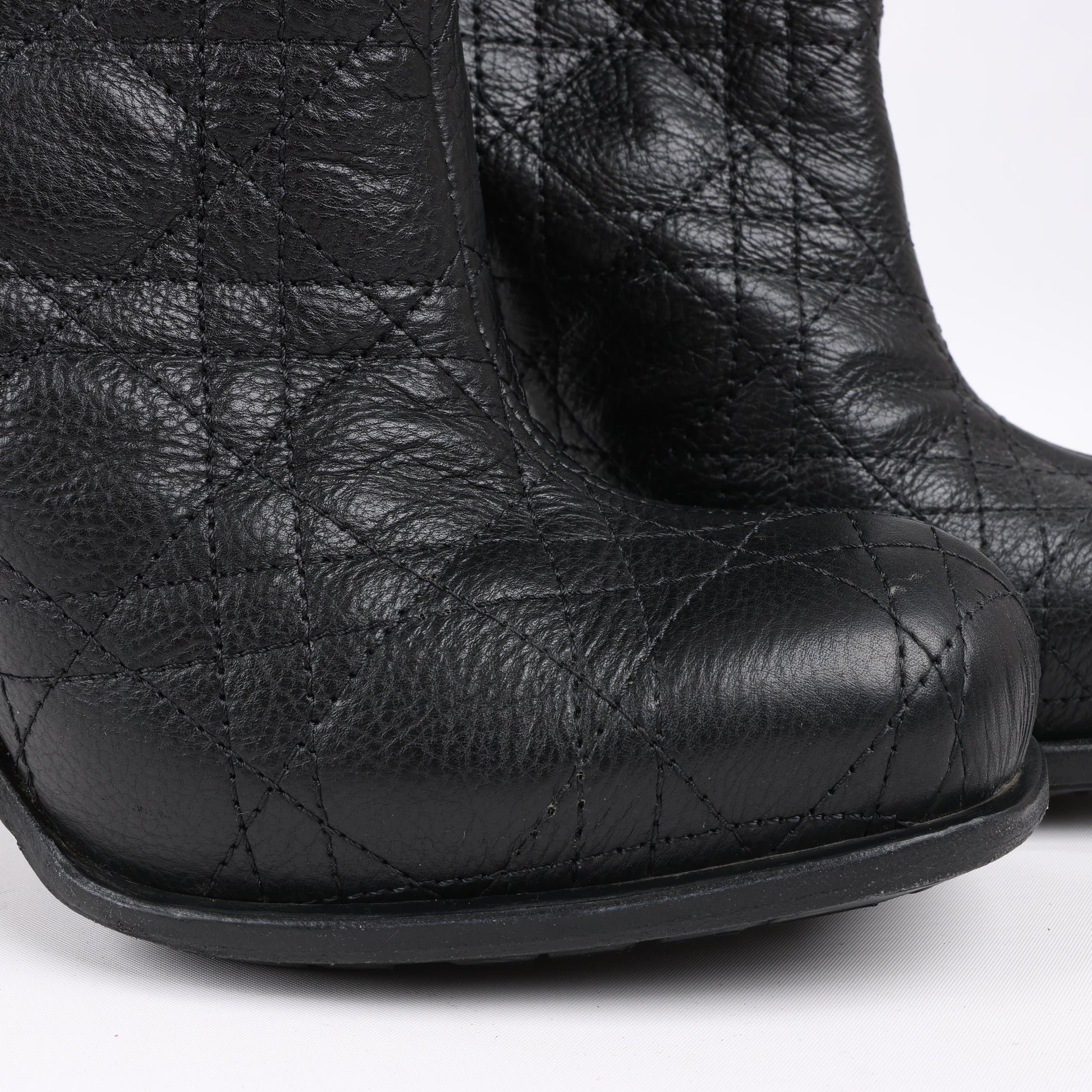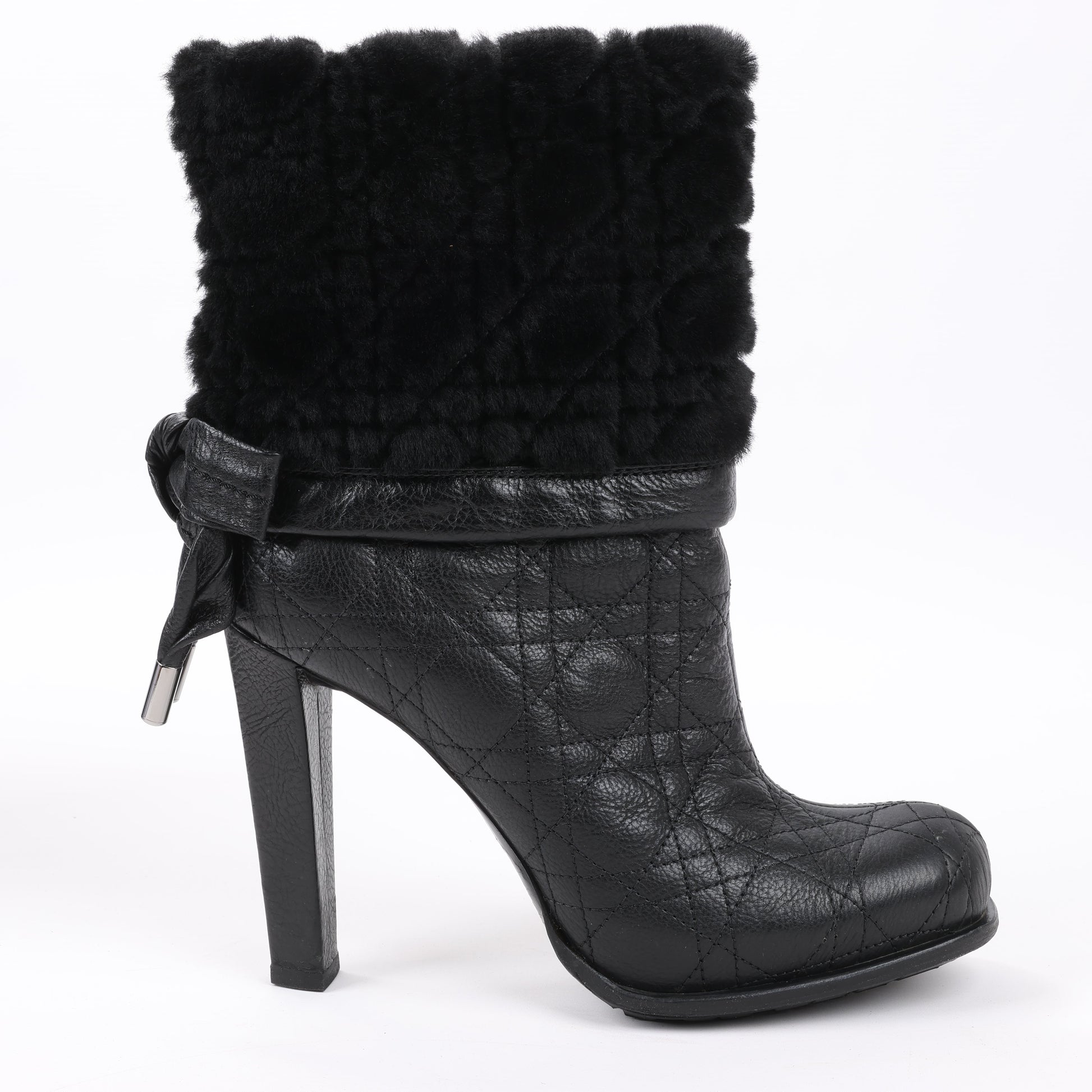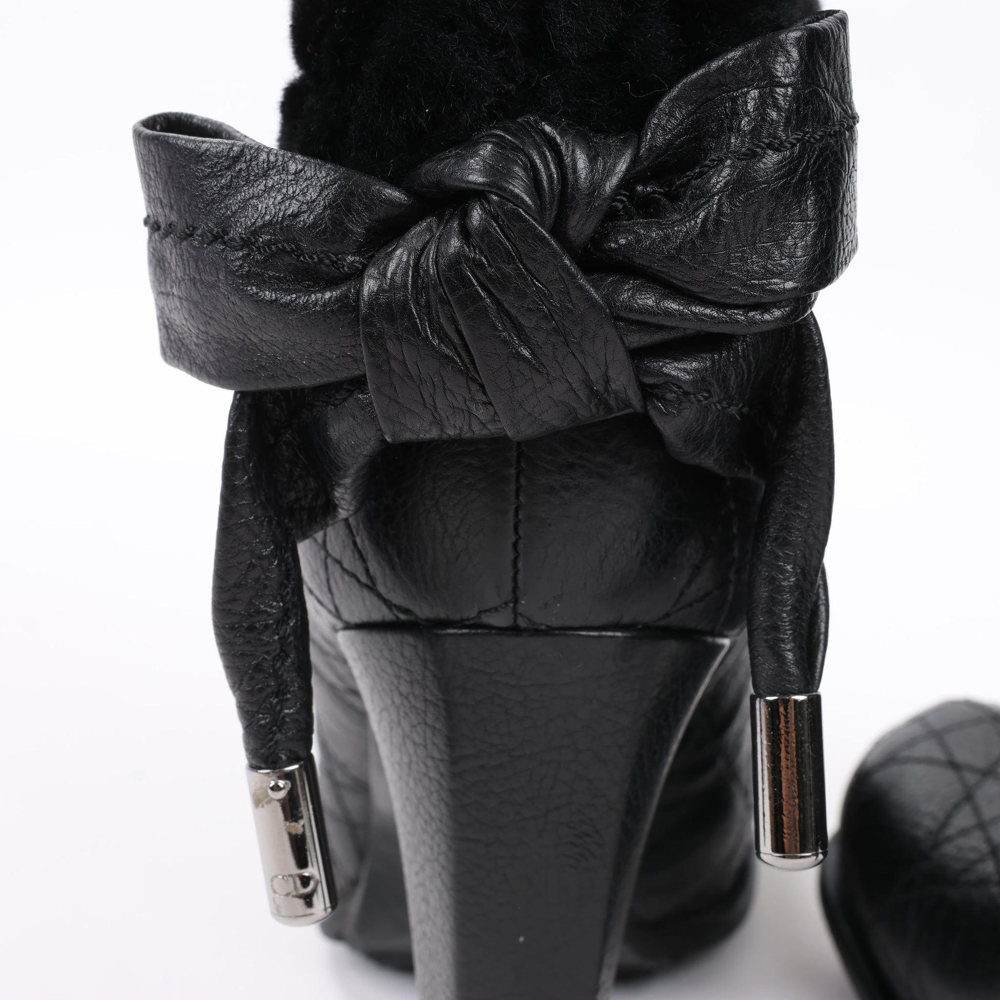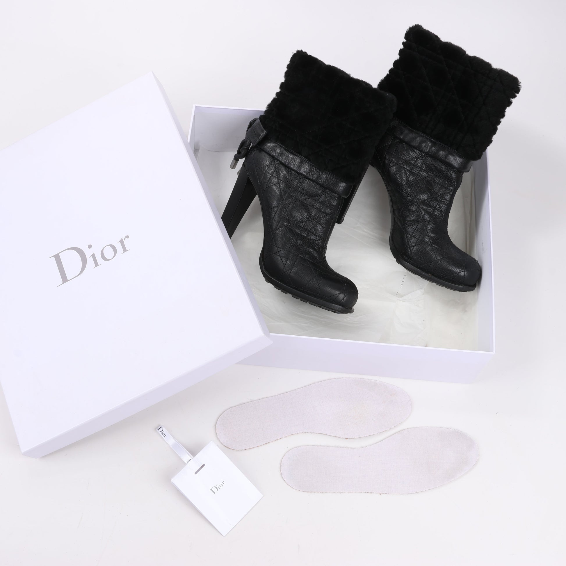 Die schwarzen Dior Cannage Ice Fur Cuffed Boots aus Leder (Größe 40 EU) bestechen durch ihr luxuriöses, gestepptes Leder mit dem ikonischen Cannage-Muster. Die flauschigen Fellbündchen sorgen für Wärme und Eleganz, während der hohe Absatz und das Plateau-Design für einen schicken, wintertauglichen Look sorgen.