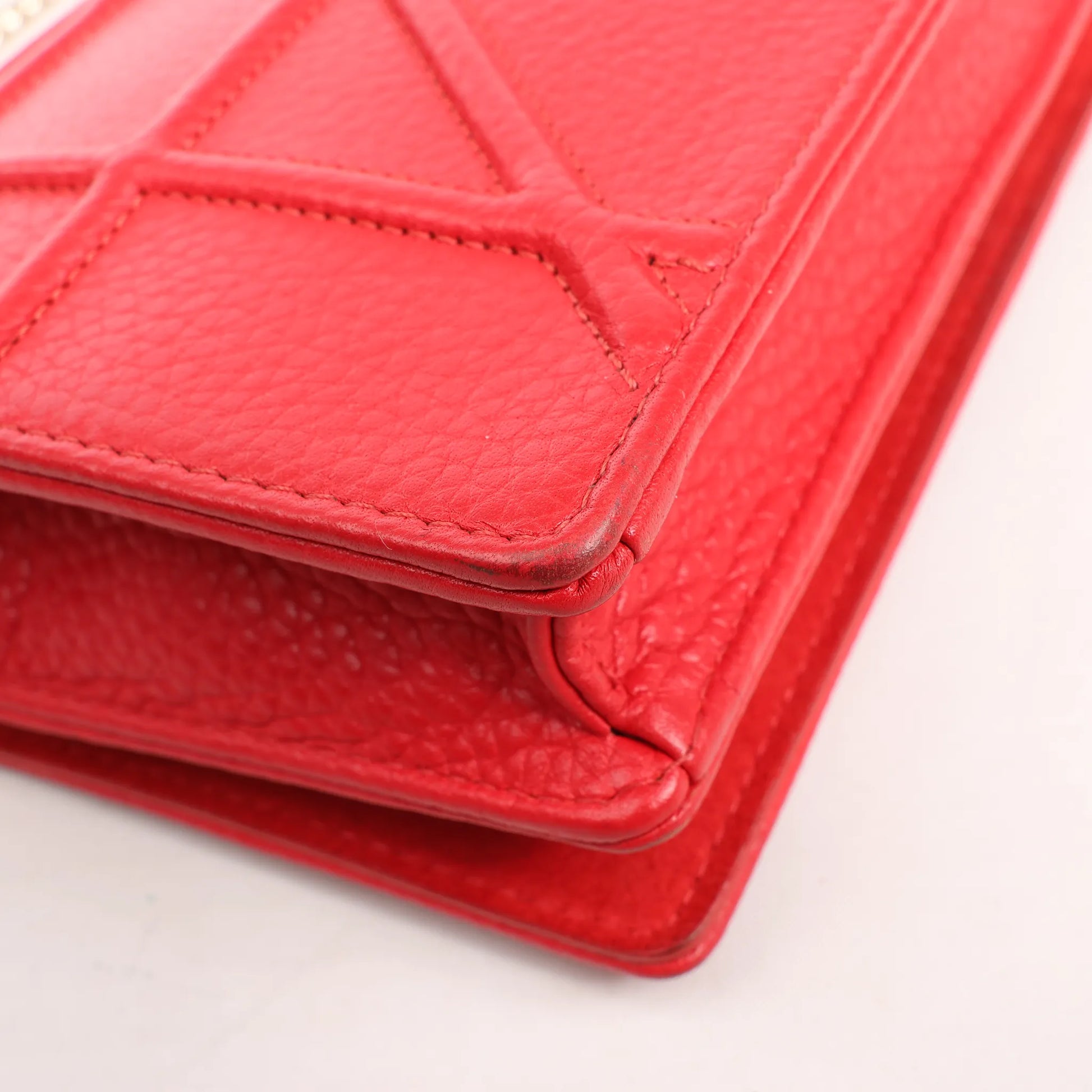 Die Dior Diorama Chain Shoulder Bag in Rot besticht durch ihr kühnes und modernes Design. Gefertigt aus geschmeidigem, genarbtem Leder mit geometrischen Cannage-Steppungen, ist sie ein markantes Statement-Piece für moderne Eleganz. Mit ihrem goldfarbenen Kettenriemen und dem wappenförmigen Verschluss ist sie ein echter Hingucker.