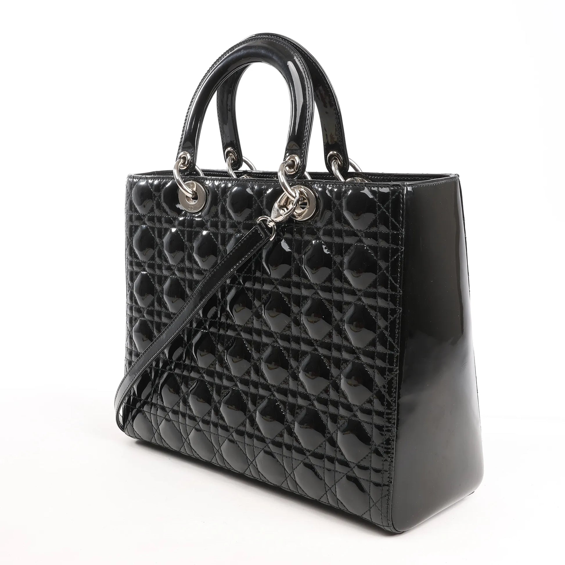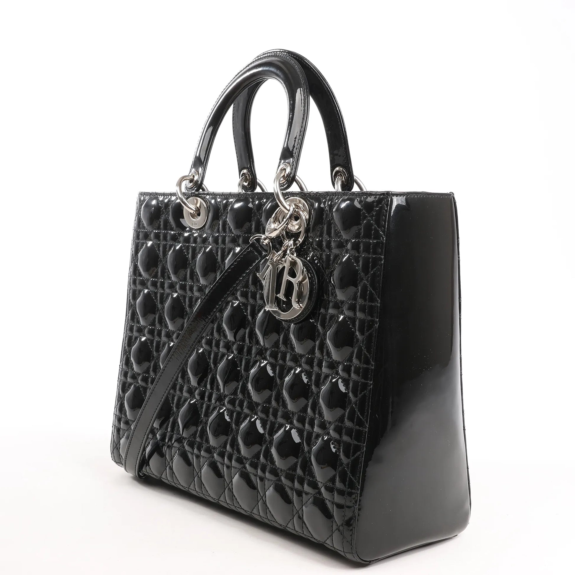 The Dior Lady Dior Large 2Way handbag in black patent leather features the iconic Cannage stitching, silver-tone hardware, and signature Dior charms—luxuriously bold and eternally elegant.