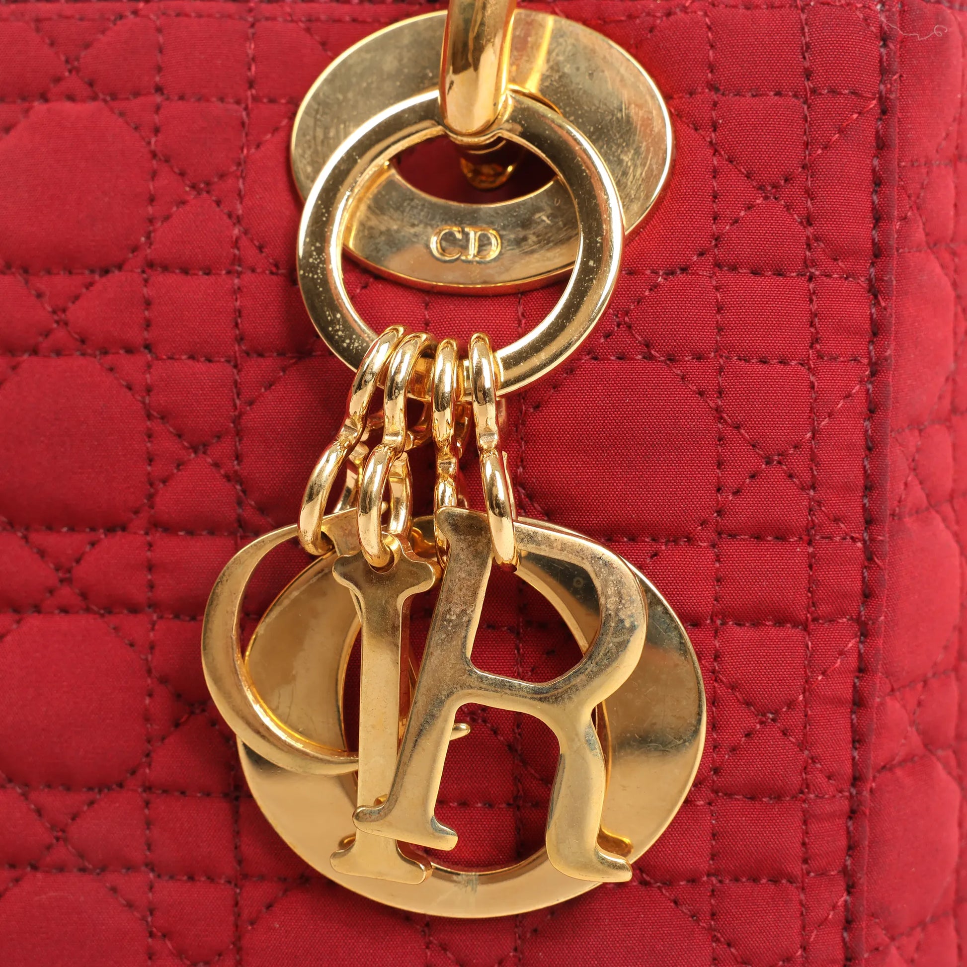 Setzen Sie ein klares Statement mit der Dior Lady Dior Mini Handtasche aus rotem, gestepptem Cannage-Nylon. Mit goldfarbenen Beschlägen und den charakteristischen Anhängern vereint diese kompakte Ikone Eleganz und moderne Vielseitigkeit.