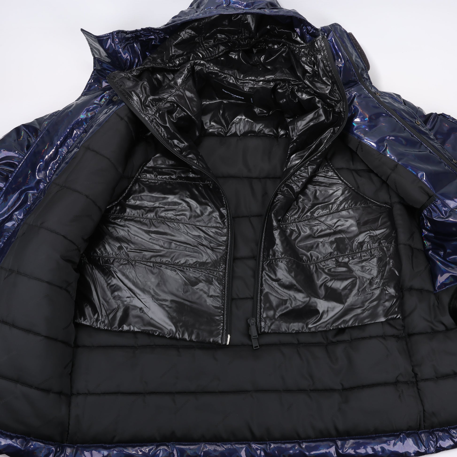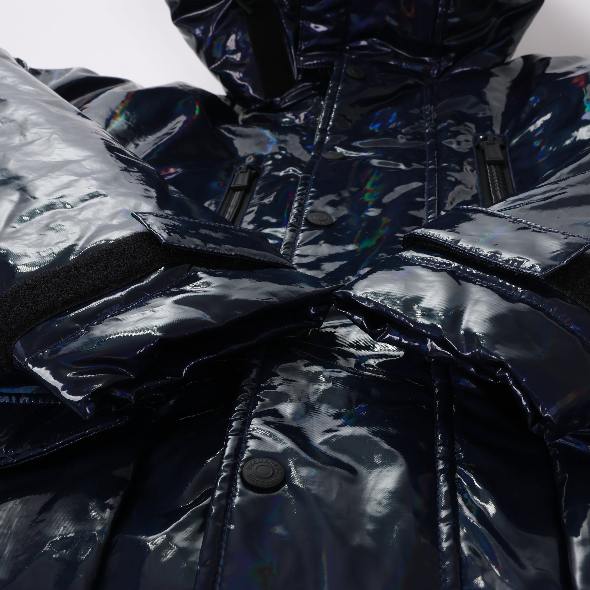 Diese auffällige Pufferjacke von DSQUARED2 in glänzendem Marineblau setzt ein starkes Statement. Mit ihrem hochglänzenden Finish, der übergroßen Passform und funktionalen Features wie mehreren Taschen und einer verstellbaren Kapuze ist sie ein Must-have für den Winter-Streetstyle.