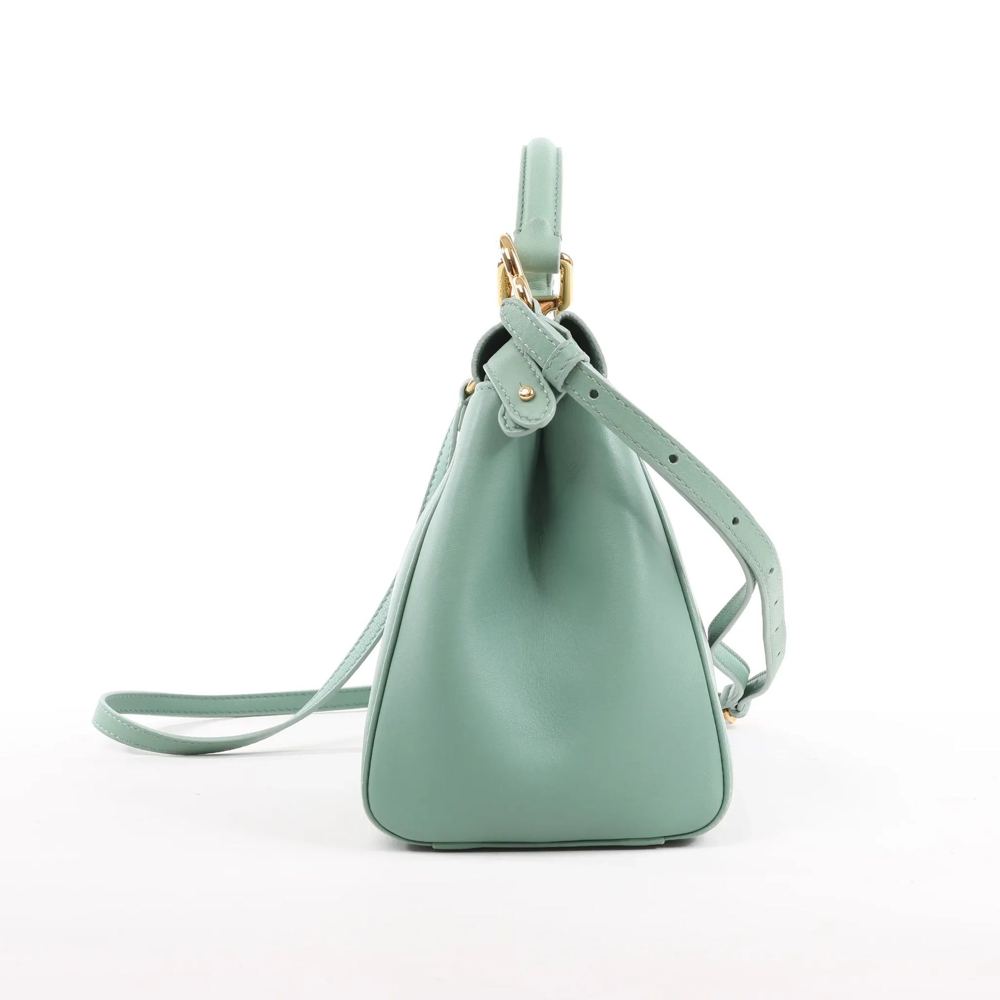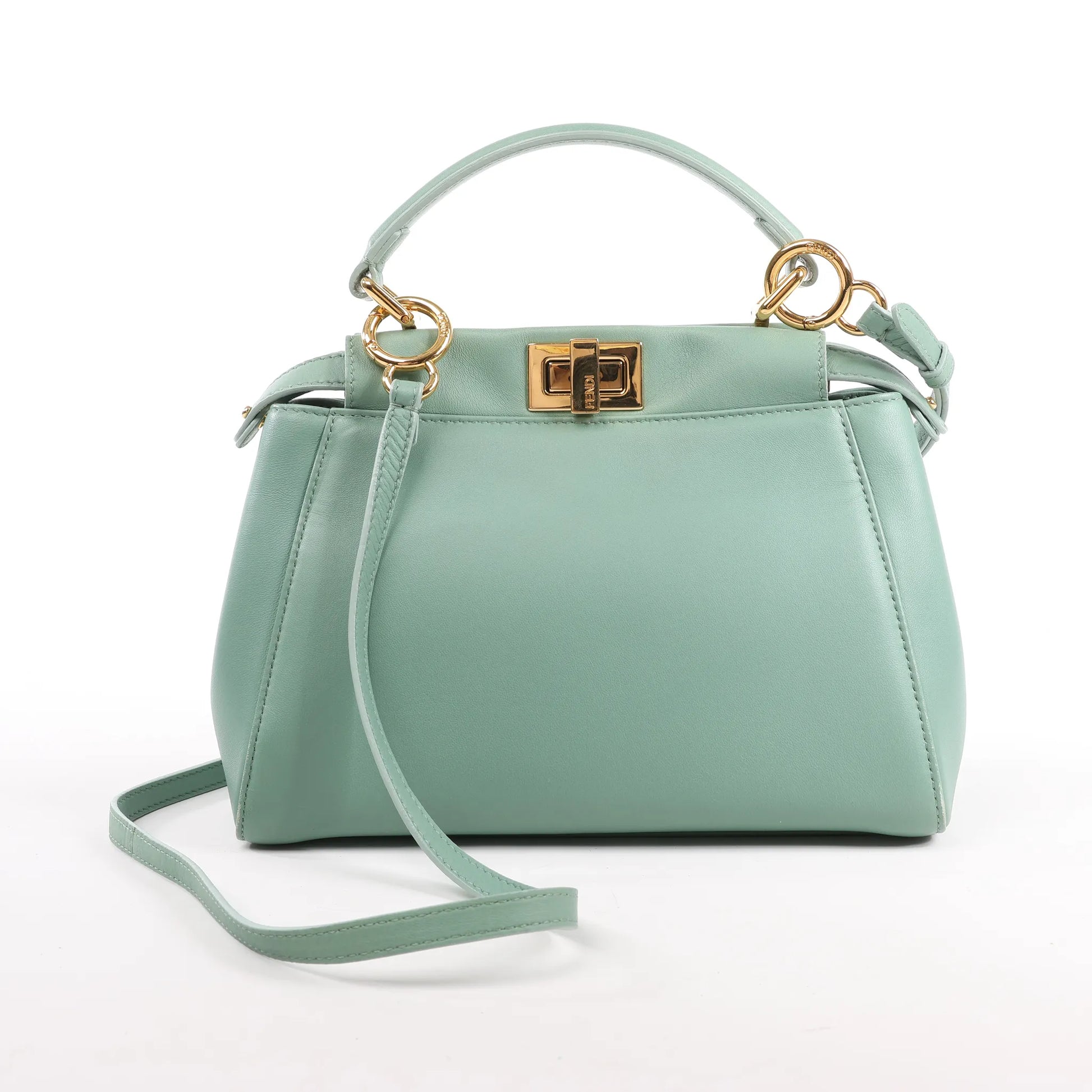 Die Fendi Peekaboo Mini 2Way Handtasche aus weichem grünem Leder ist ein zeitloses Statement-Piece mit modernem Flair. Dank der luxuriösen Kalbslederkonstruktion, dem charakteristischen Drehverschluss und den goldfarbenen Beschlägen lässt sie sich mühelos in der Hand oder als Crossbody tragen.