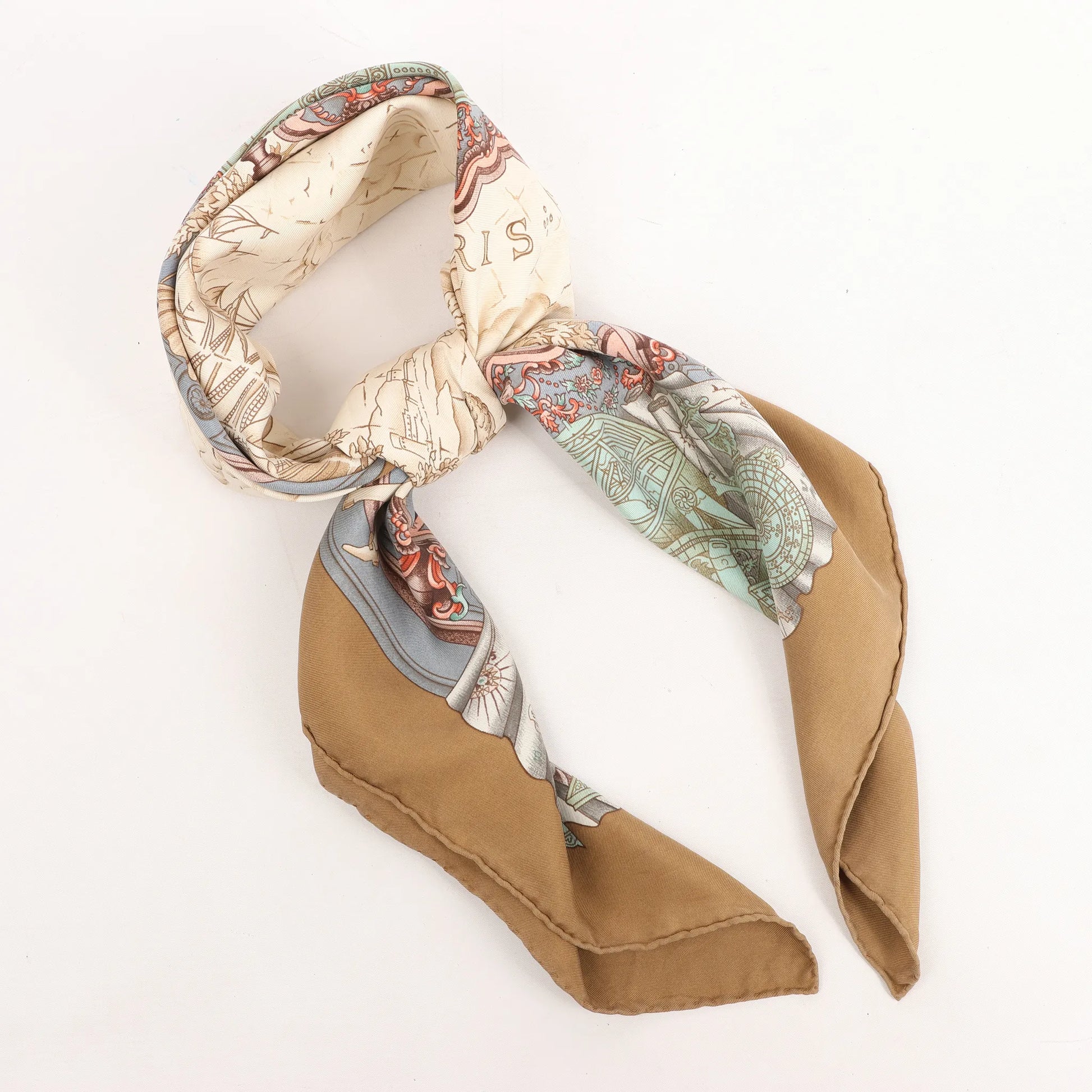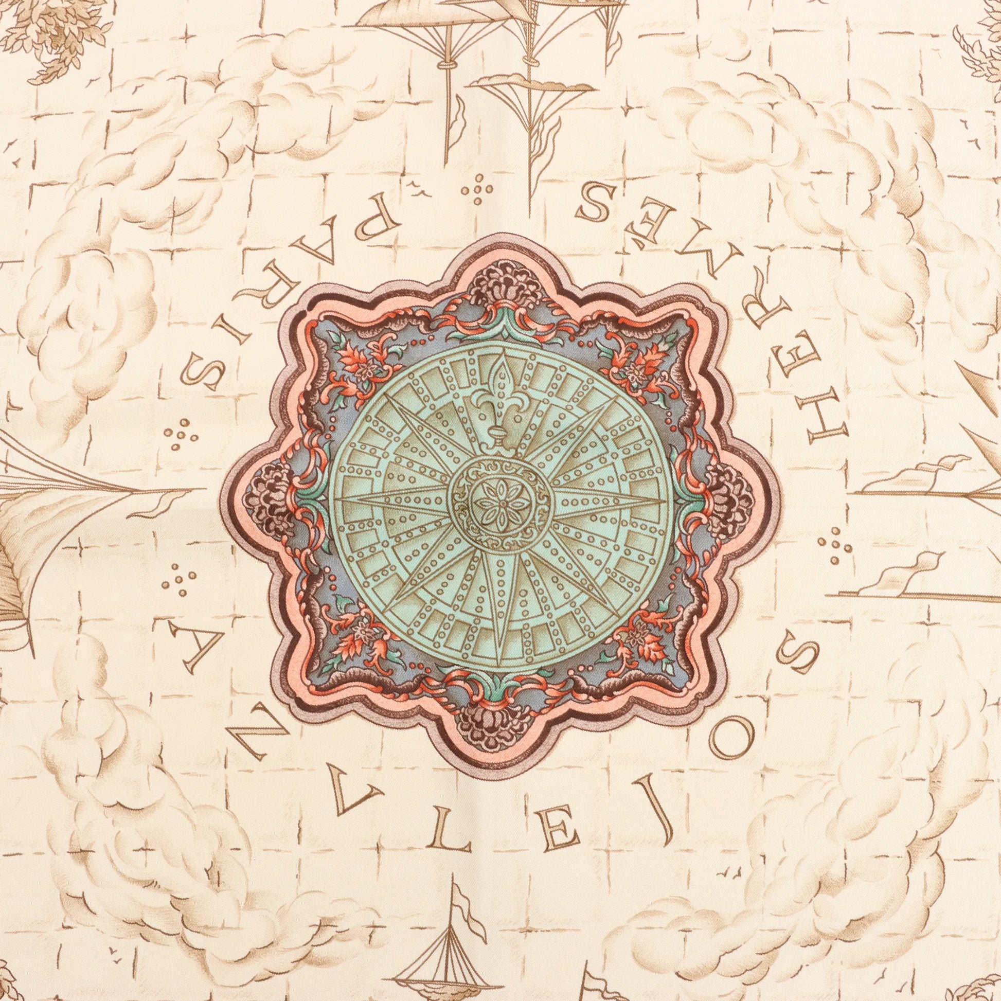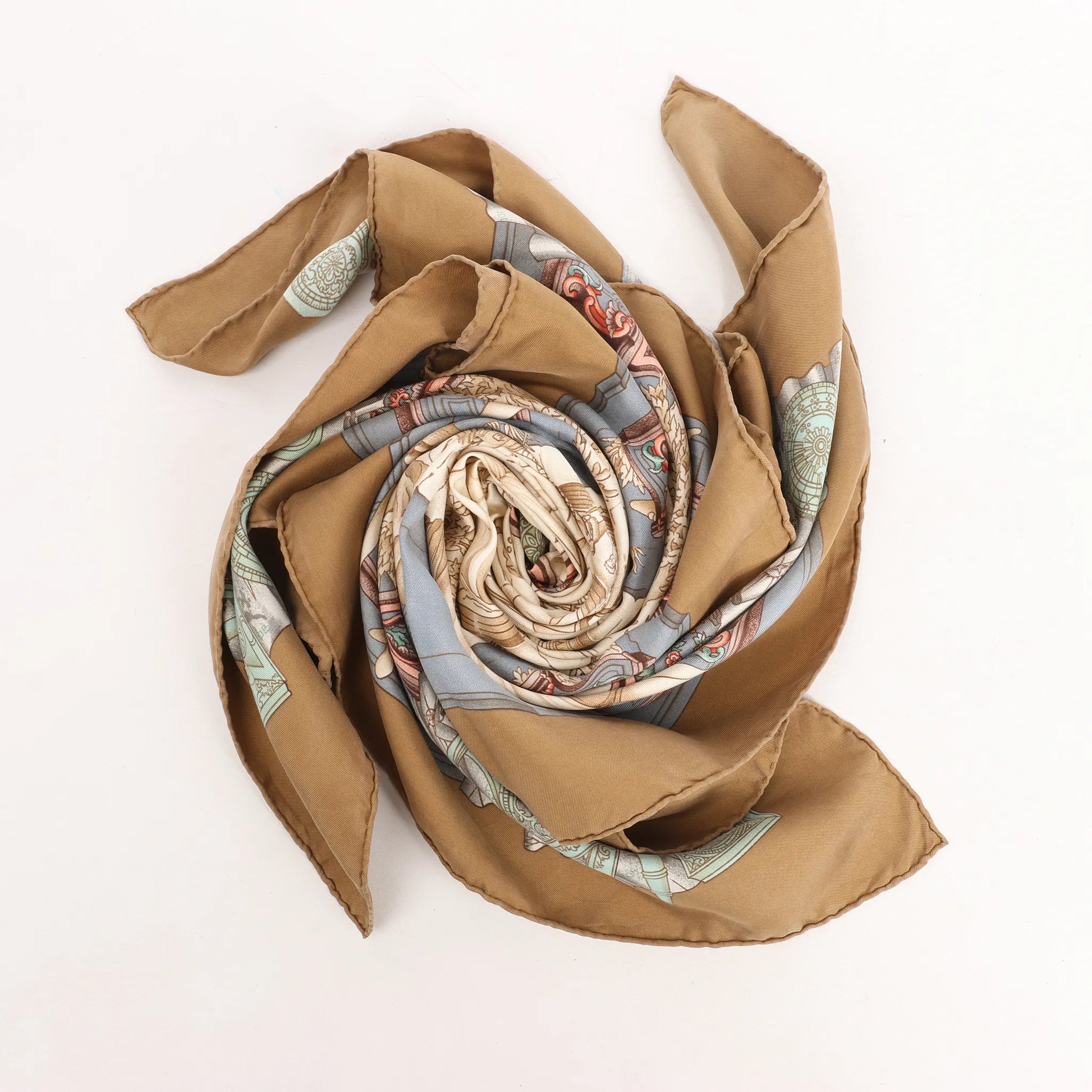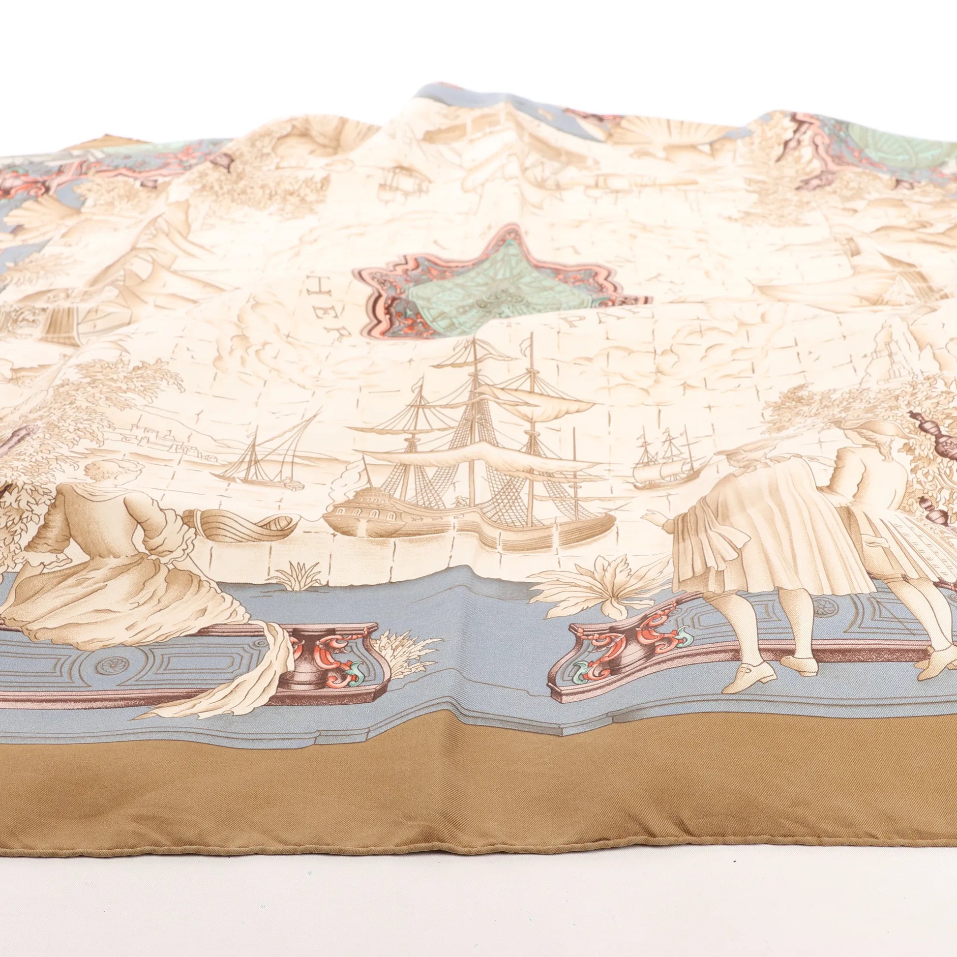 Der braune Seidenschal „Azulejos“ von Hermès Carré 90 besticht durch sein detailreiches, historisch inspiriertes Design mit Kartenmotiven, Schiffen und barocken Details. Gefertigt aus feinem Seidentwill, ist er mit seinem zeitlosen Charme ein Sammlerstück, das jeden begeistert.