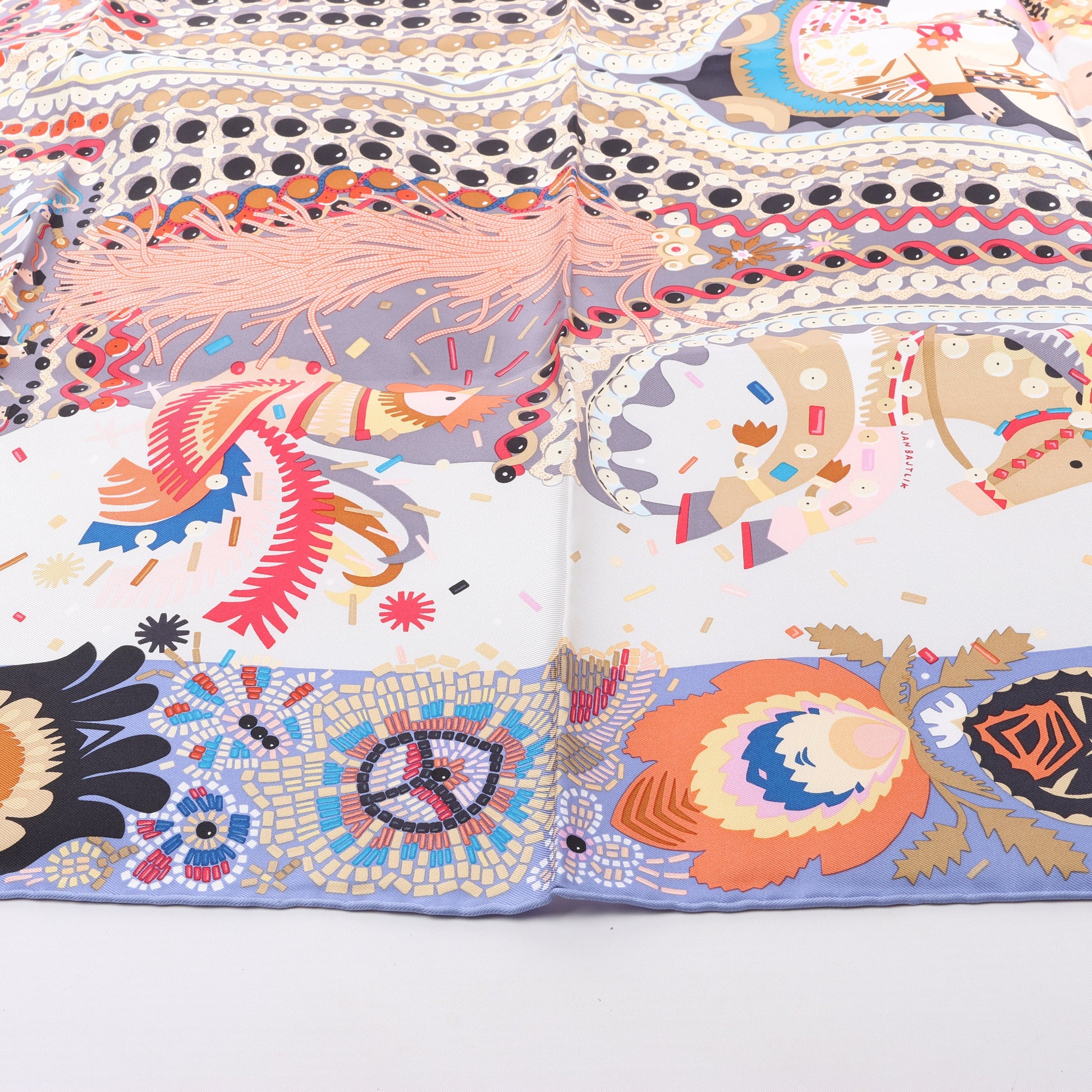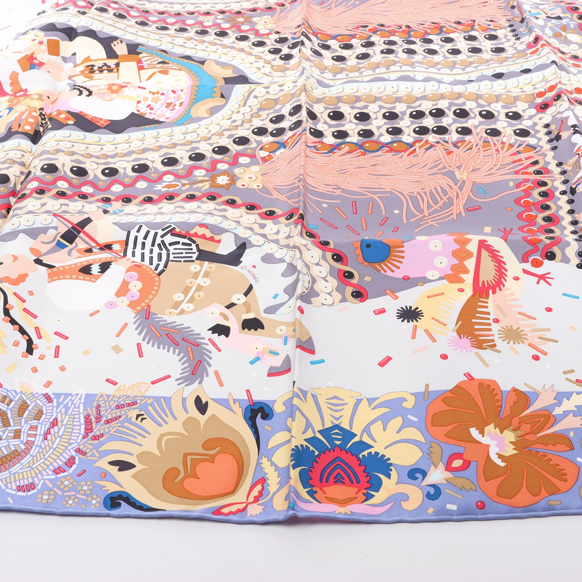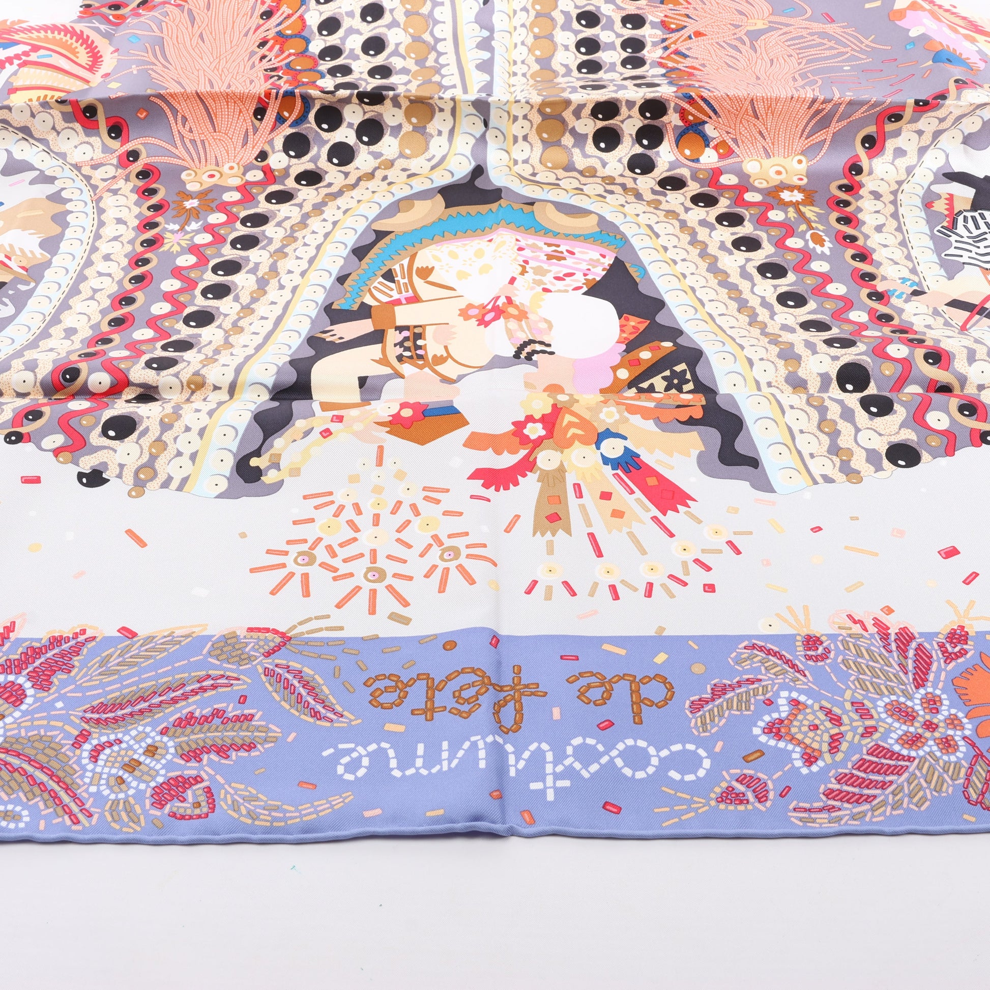 Hermès Carré 90 „Costume de Fête“-Schal aus 100 % Seide mit lebendigem Folklore-Design, aufwendigen Stickereien, festlichen Motiven und satten Lilatönen. Ein fröhliches Sammlerstück, das kulturelle Eleganz mit Hermès-Flair zelebriert.