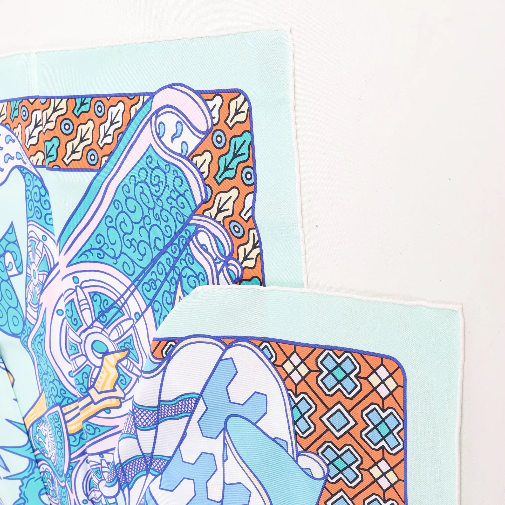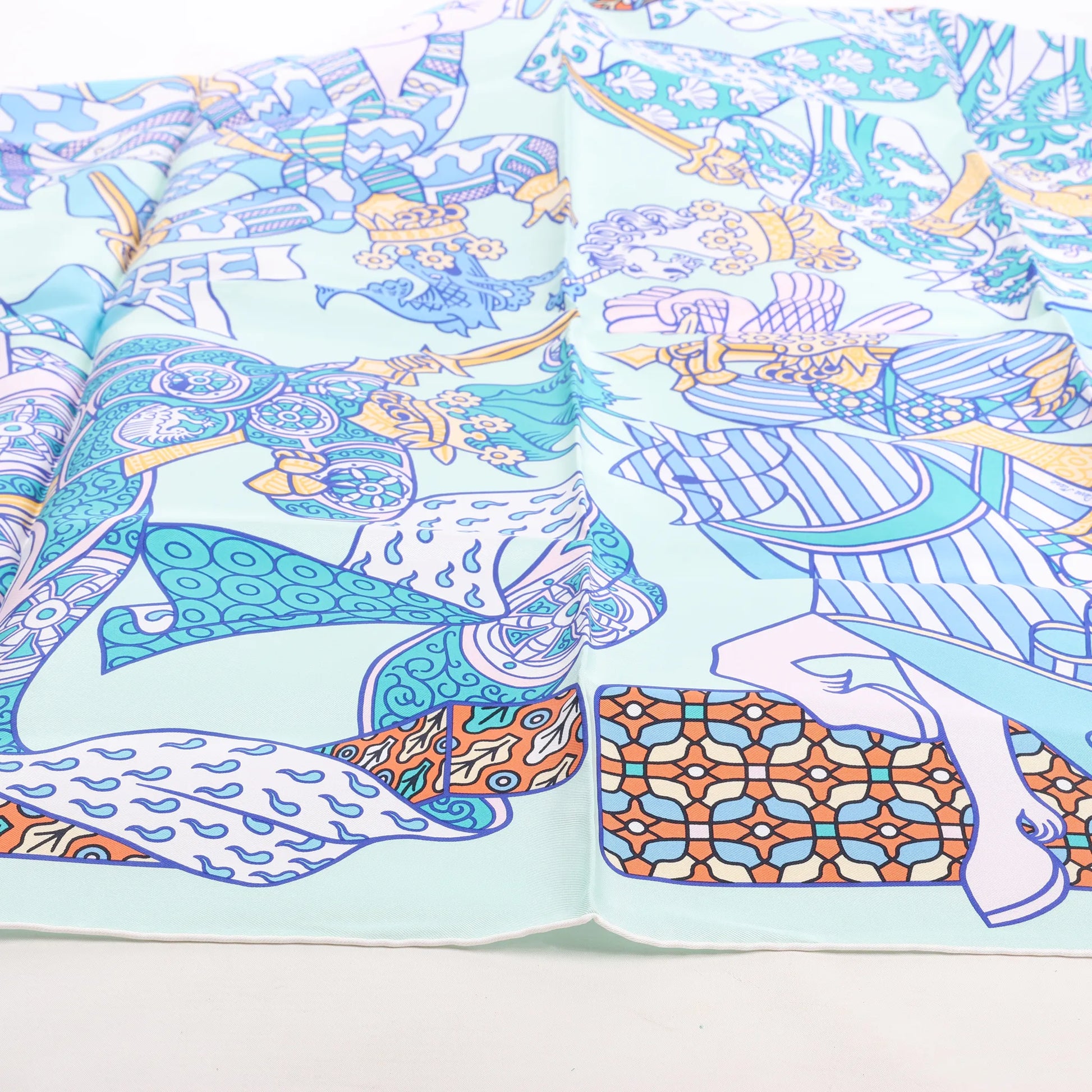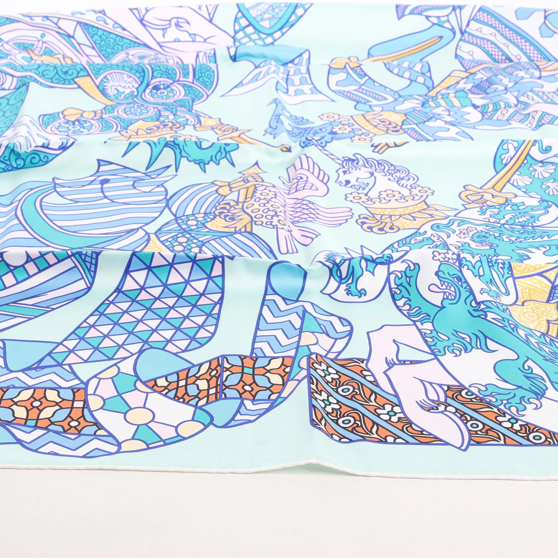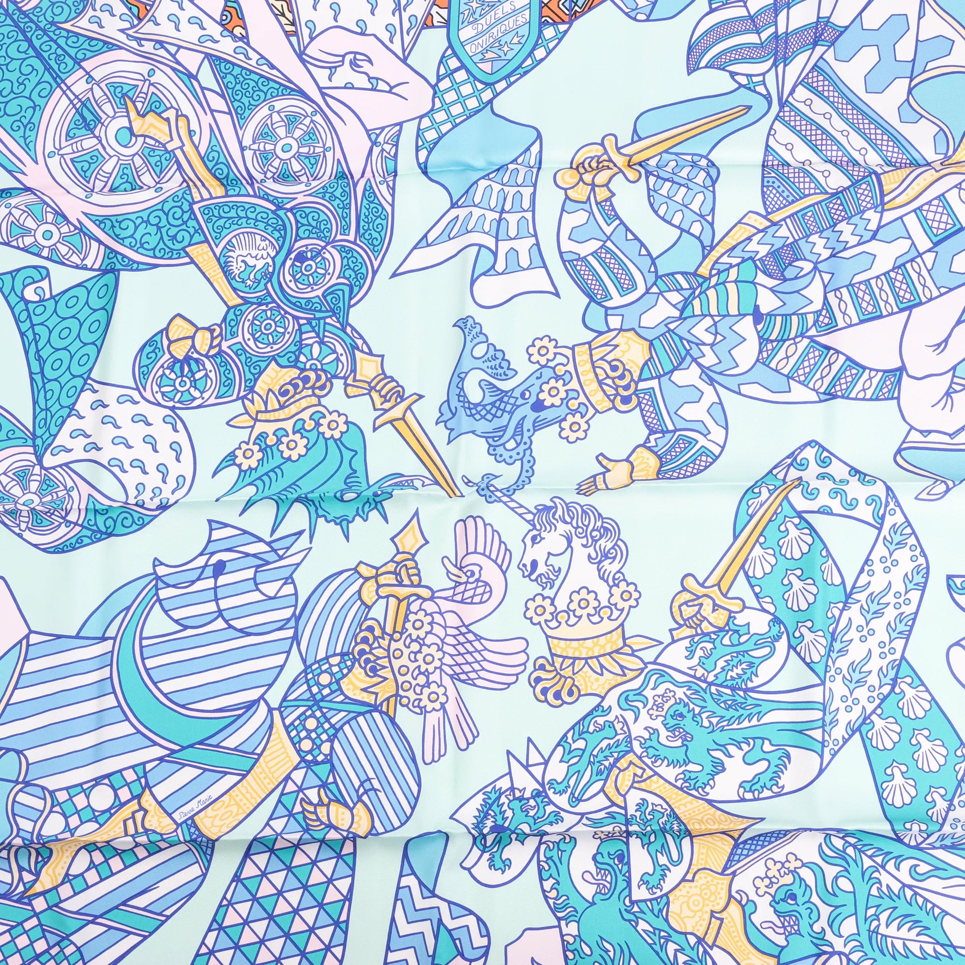 Der blaue Hermès Carré 90 „Duels Oniriques“ erweckt Fantasie zum Leben. Dieser aus 100 % Seide gefertigte, leuchtende Schal zeigt gepanzerte Ritter in traumhaften Kämpfen, verziert mit aufwendigen Details und geometrischen Akzenten – eine atemberaubende Verbindung von Mythologie und Luxus.