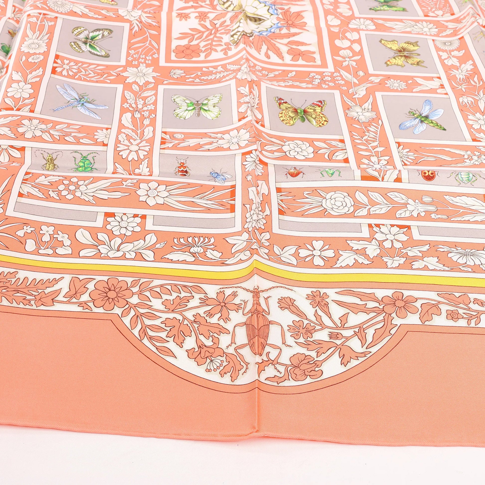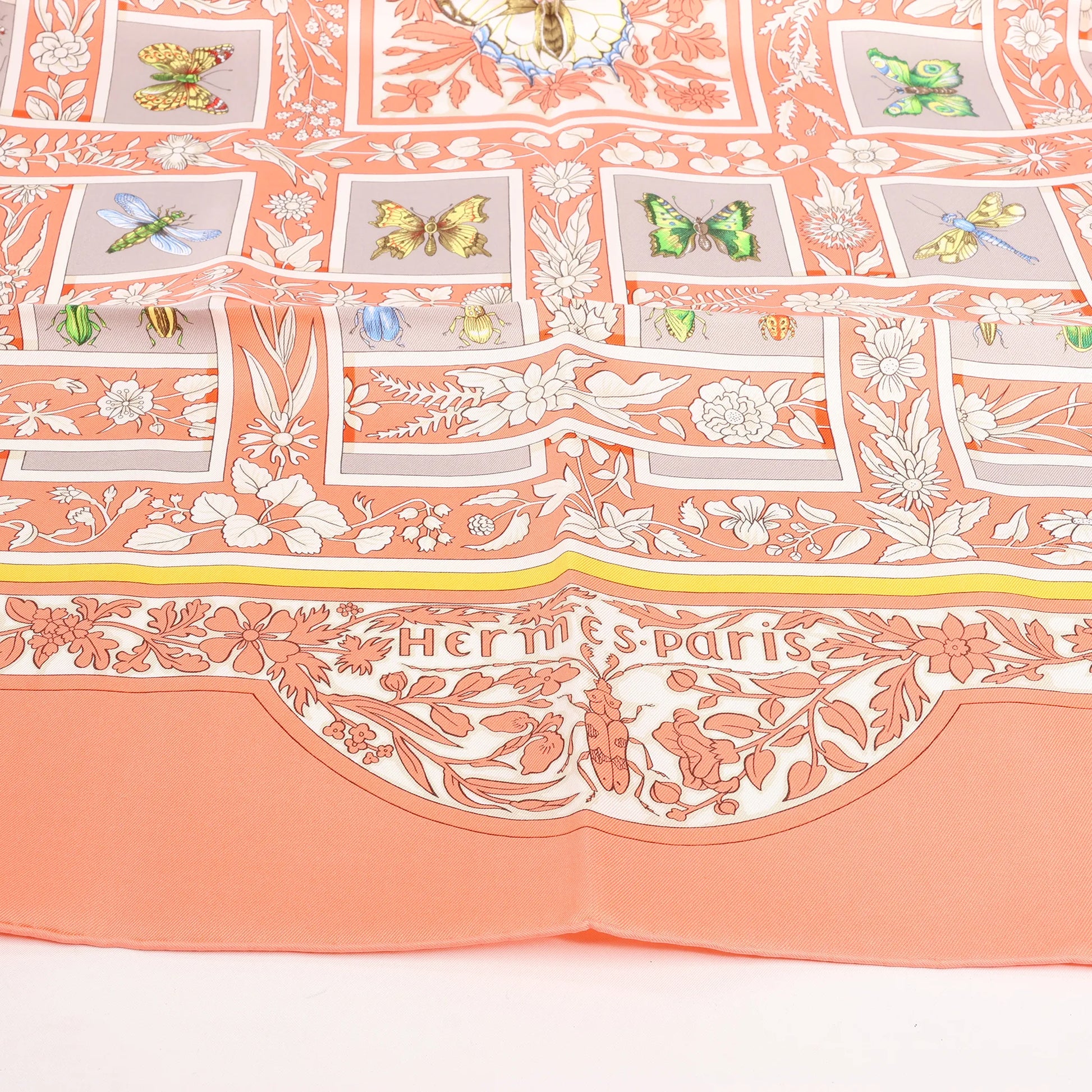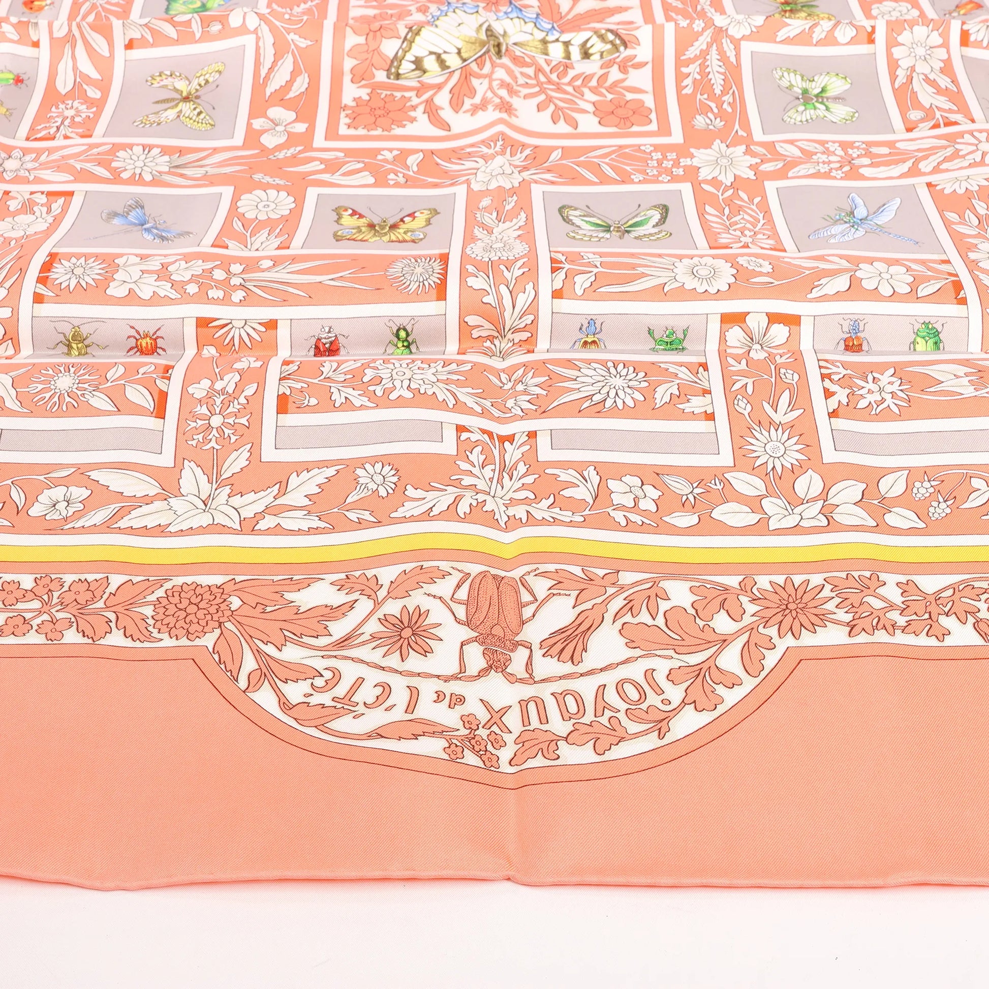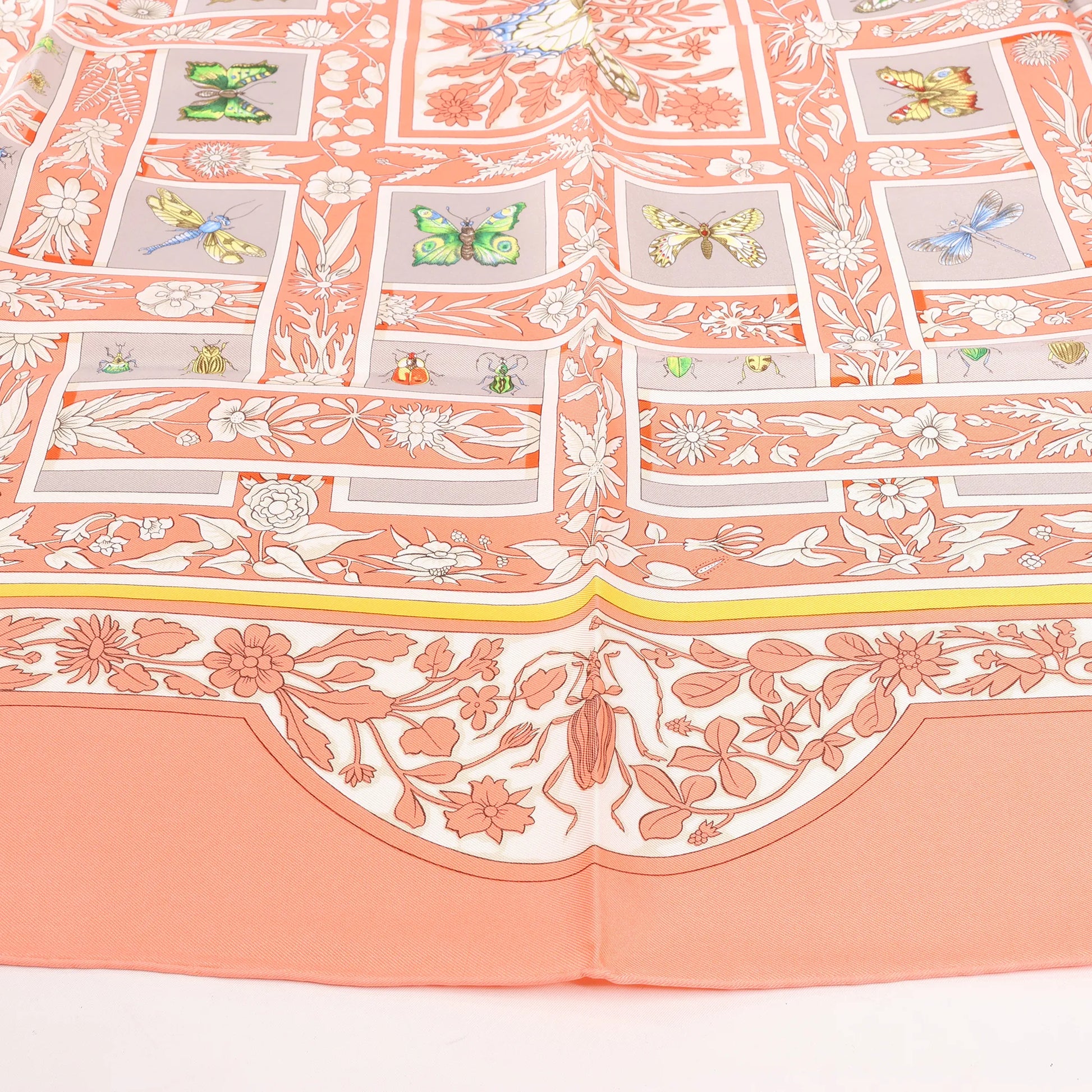 Verleihen Sie Ihrem Look einen Hauch von Eleganz mit dem Hermès Carré 90 Seidentuch „Joyaux de l'Été“ in Rosa. Dieses in Frankreich gefertigte Accessoire aus luxuriöser Seide besticht durch aufwendige Schmetterlings- und Blumenmotive und ist perfekt für einen zeitlosen, femininen Stil.