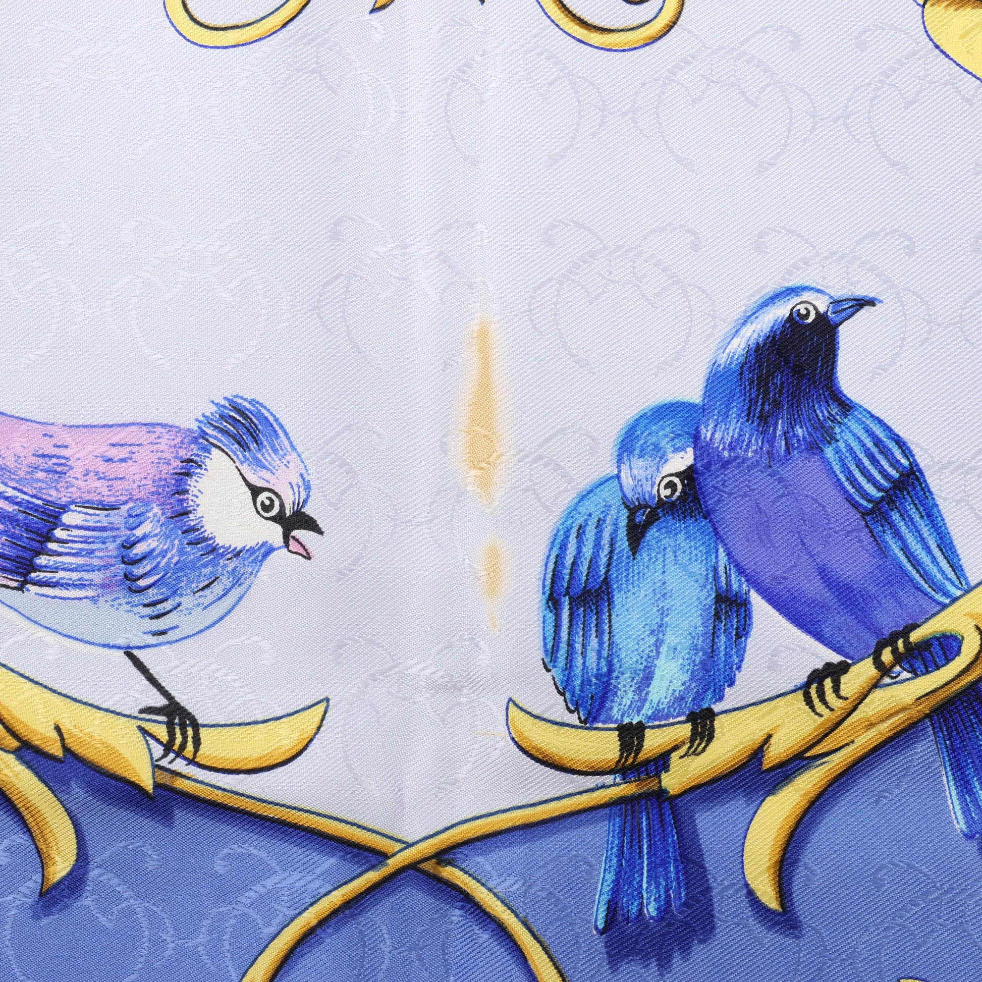 Zart und verträumt präsentiert sich der Hermès Carré 90 „La Clé des Champs“ aus blauer Seide mit einem verspielten Design aus fliegenden Vögeln, umrahmt von goldenen Ranken. Dieser luxuriöse Schal verkörpert in jedem Detail den Geist von Freiheit und Eleganz.