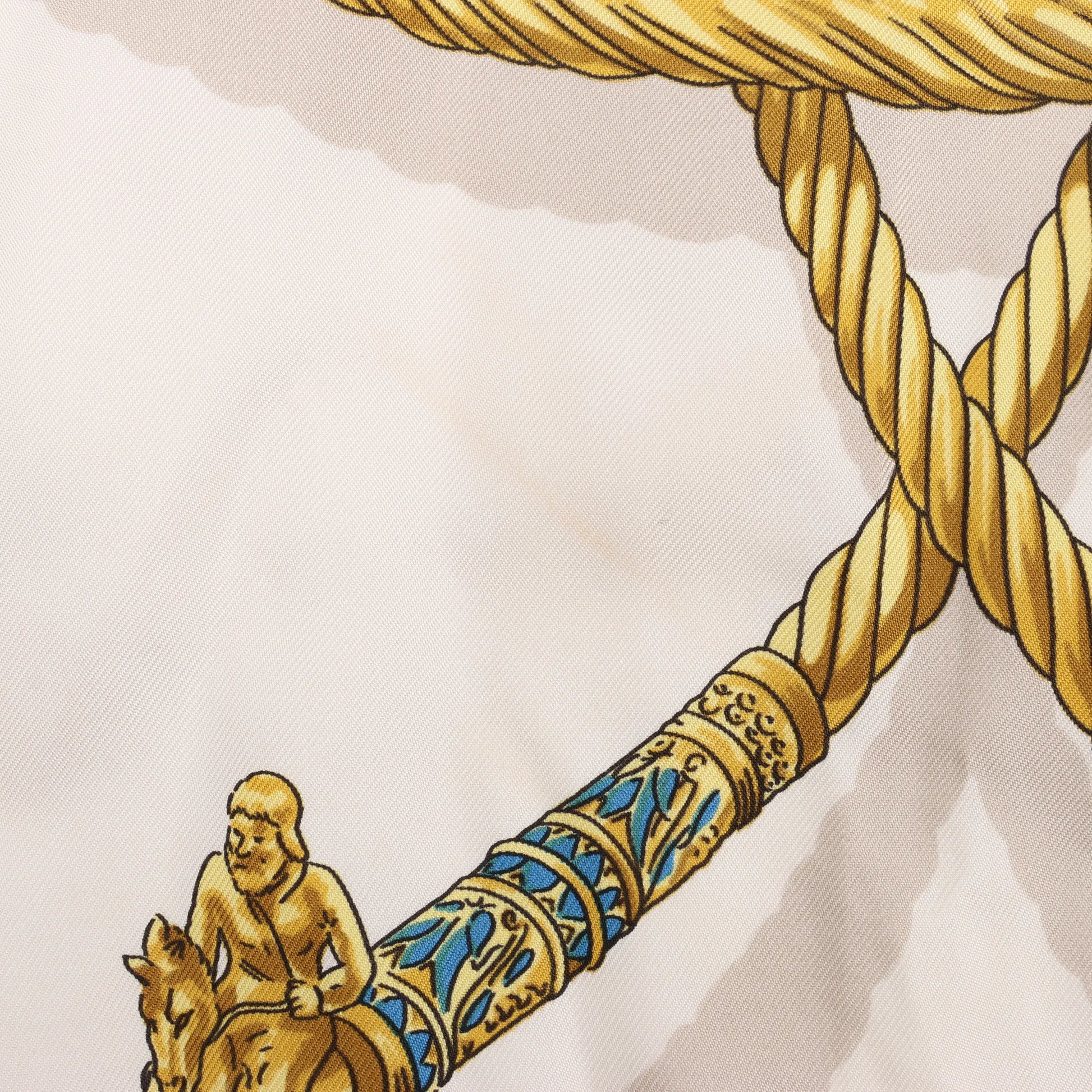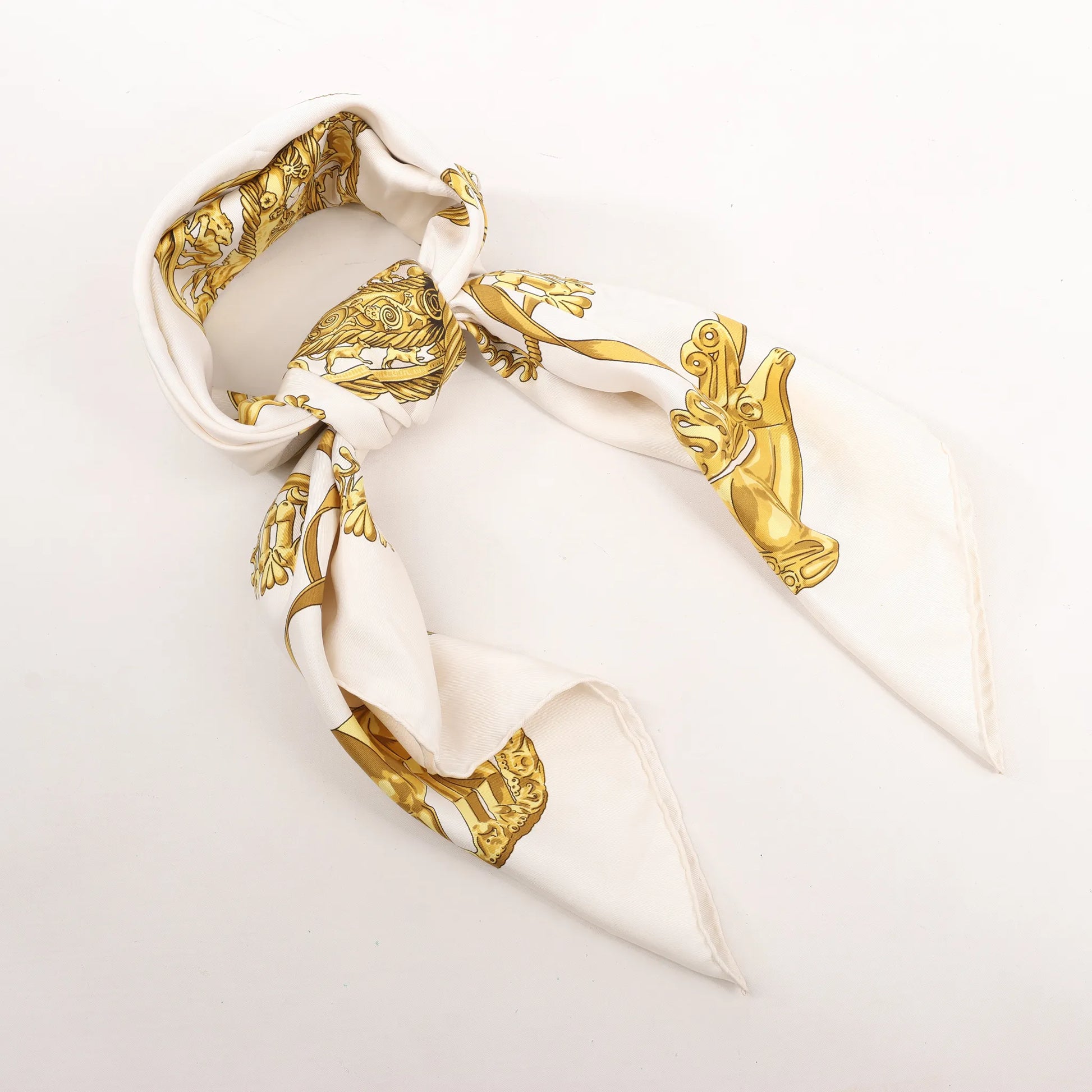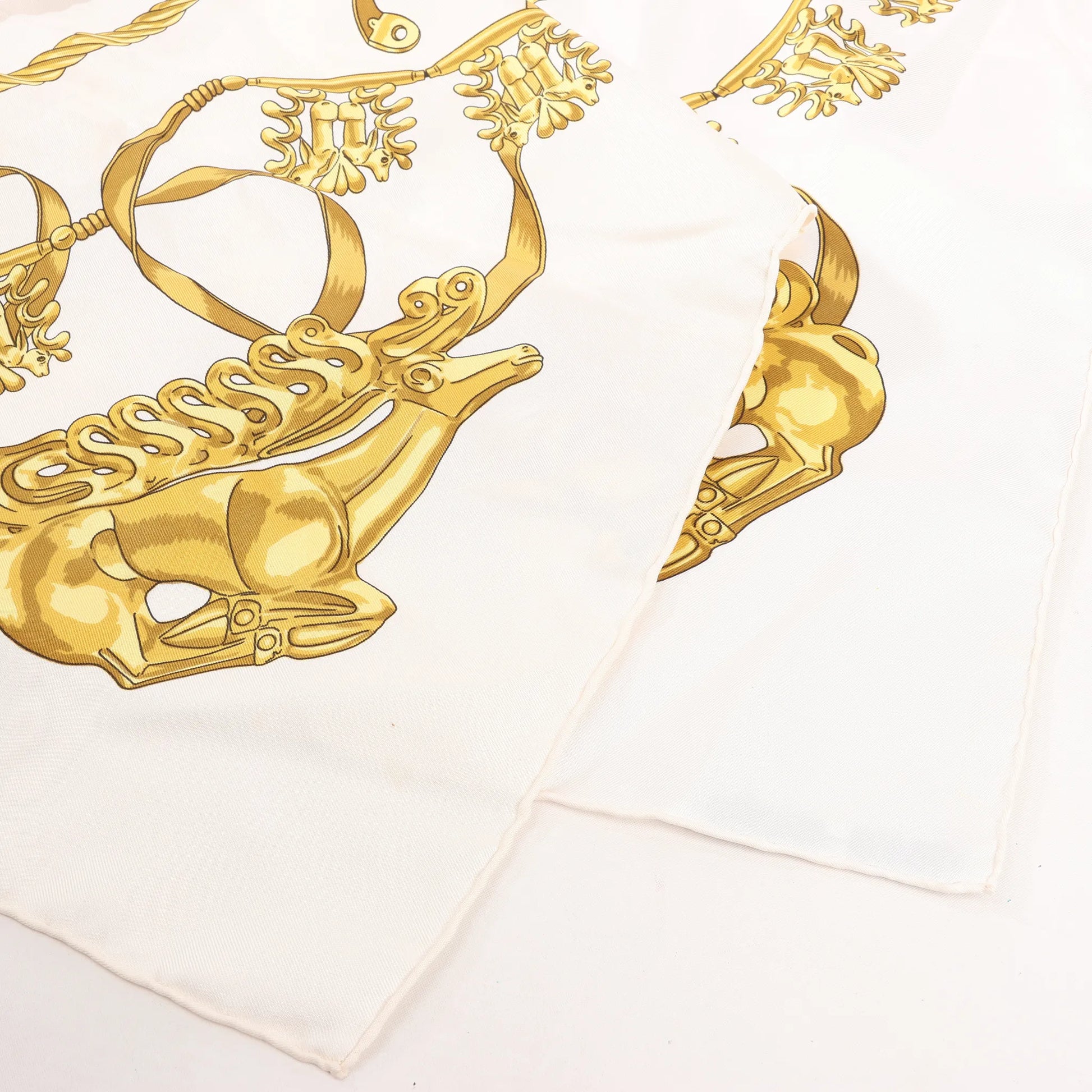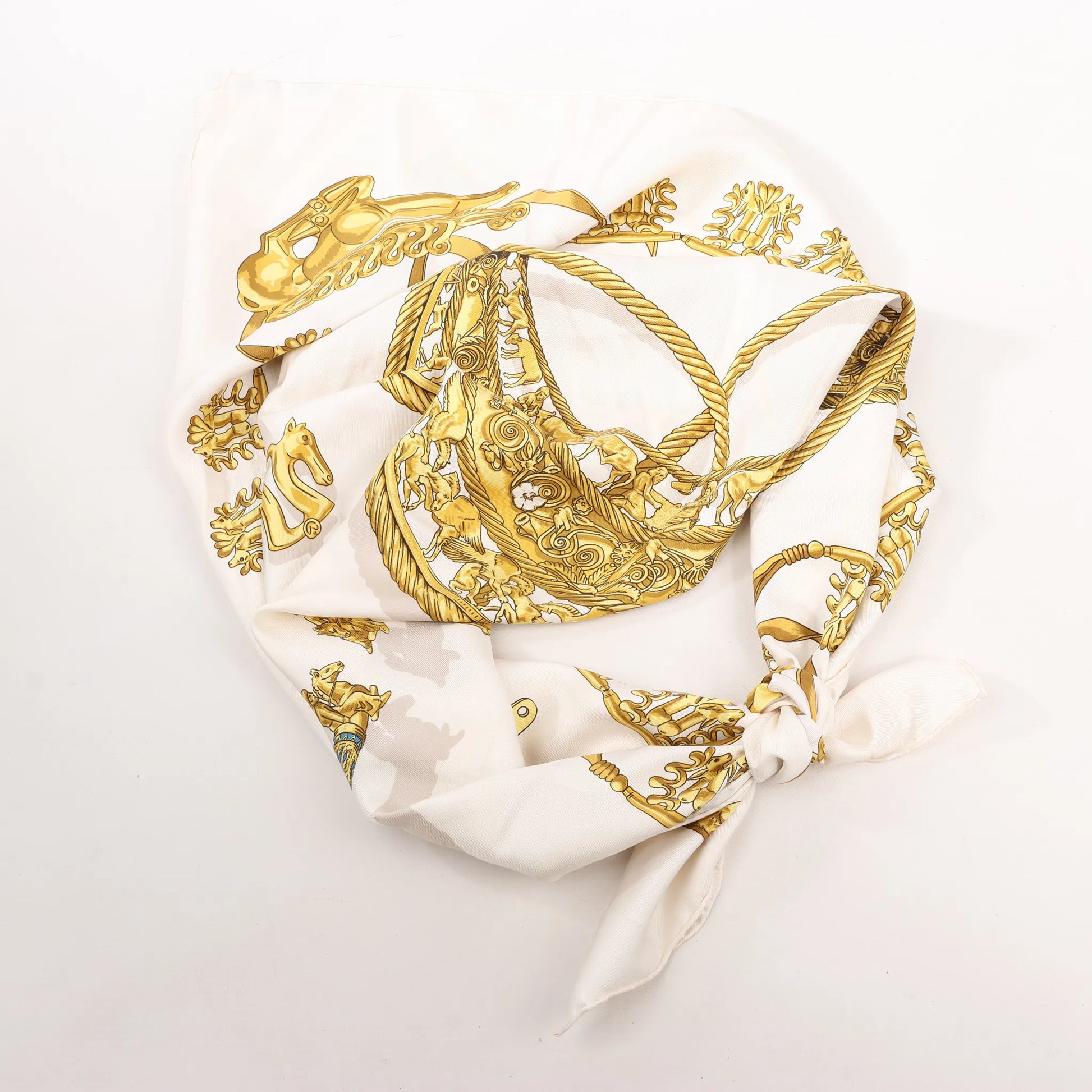 Hermès Carré 90 „LES CAVALIERS D'OR“ Seidentaschentuch in Weiß