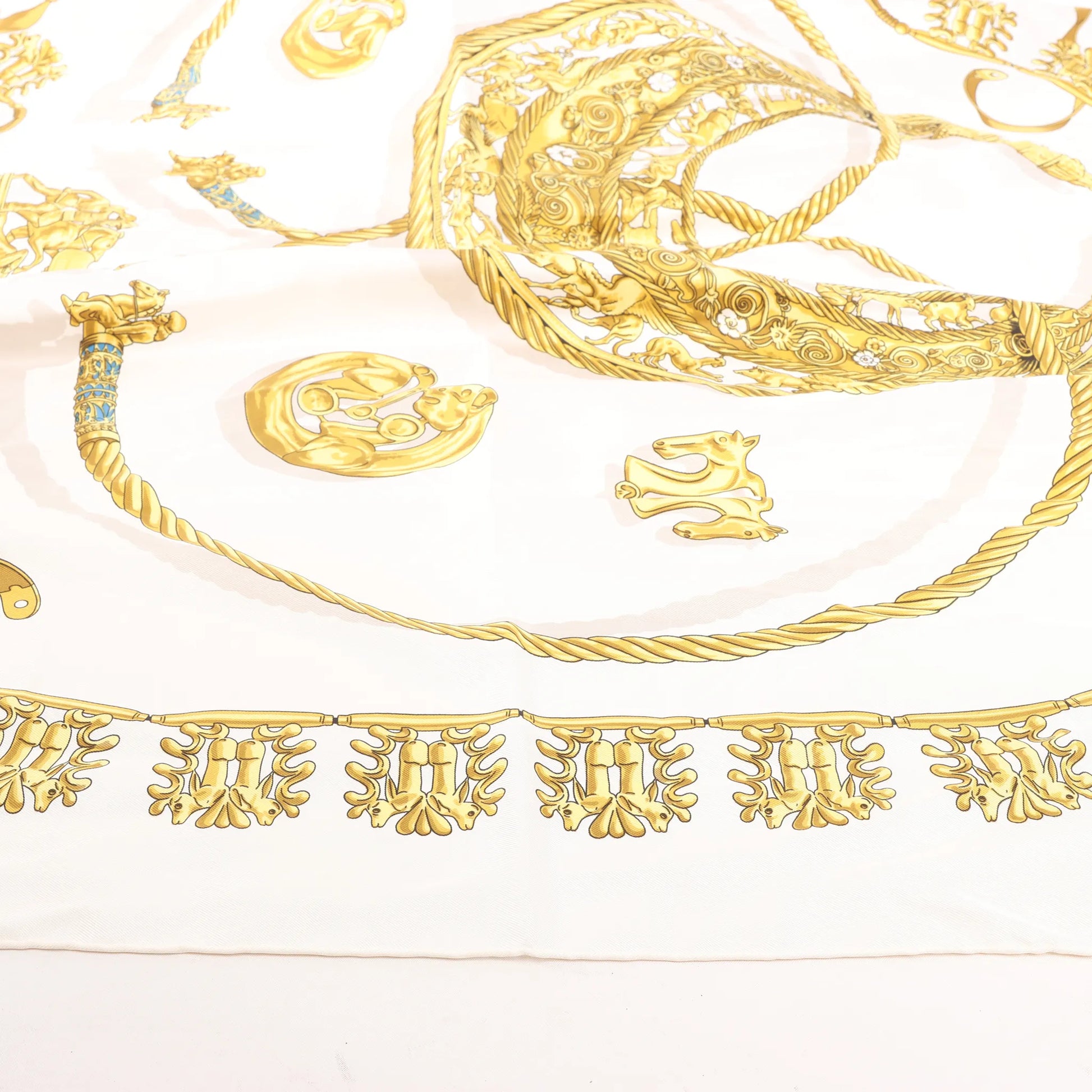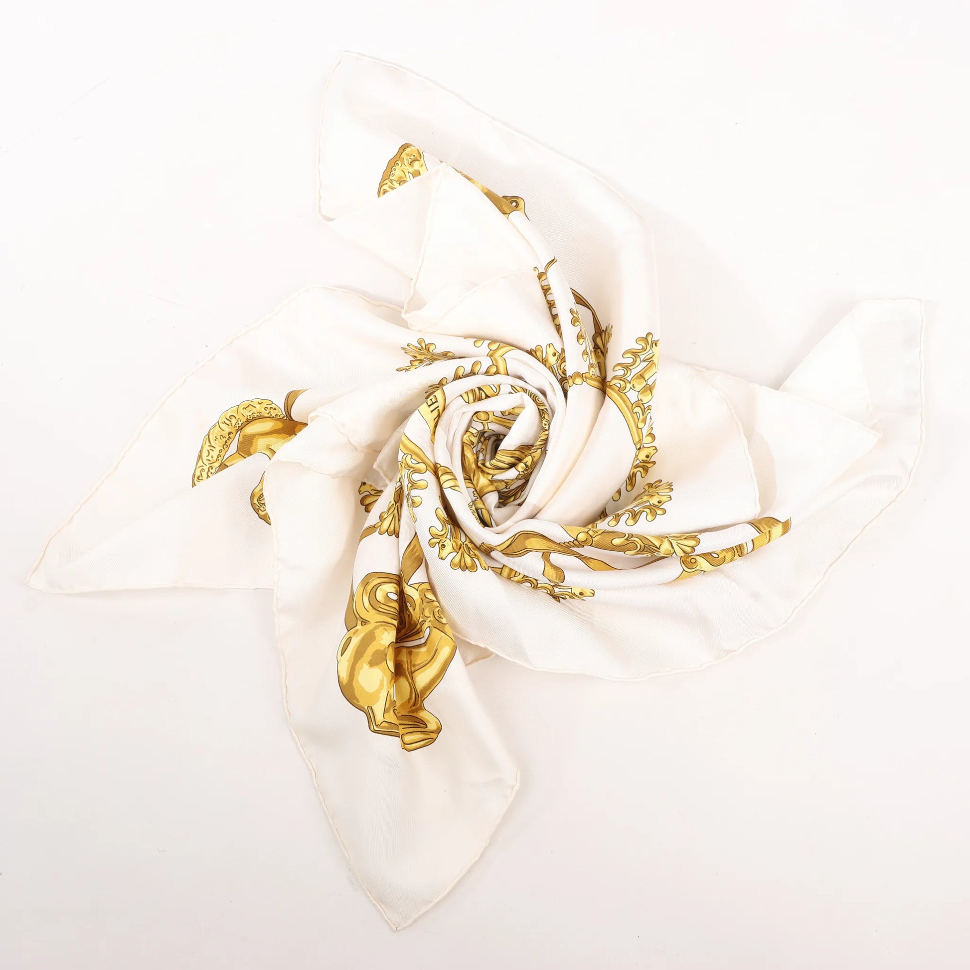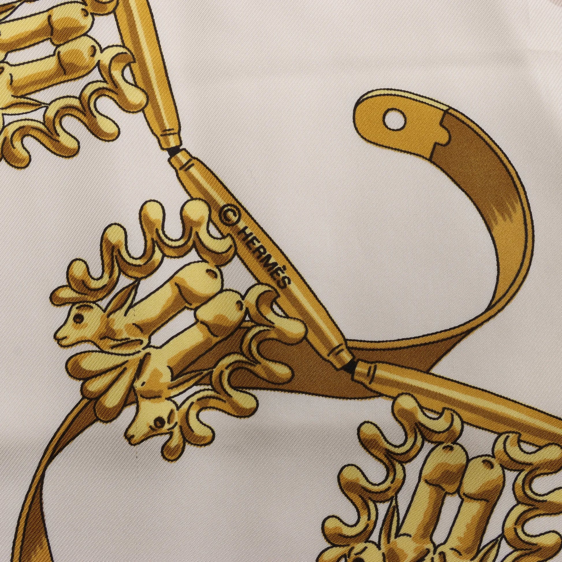 Hermès Carré 90 „LES CAVALIERS D'OR“ Seidentaschentuch in Weiß
