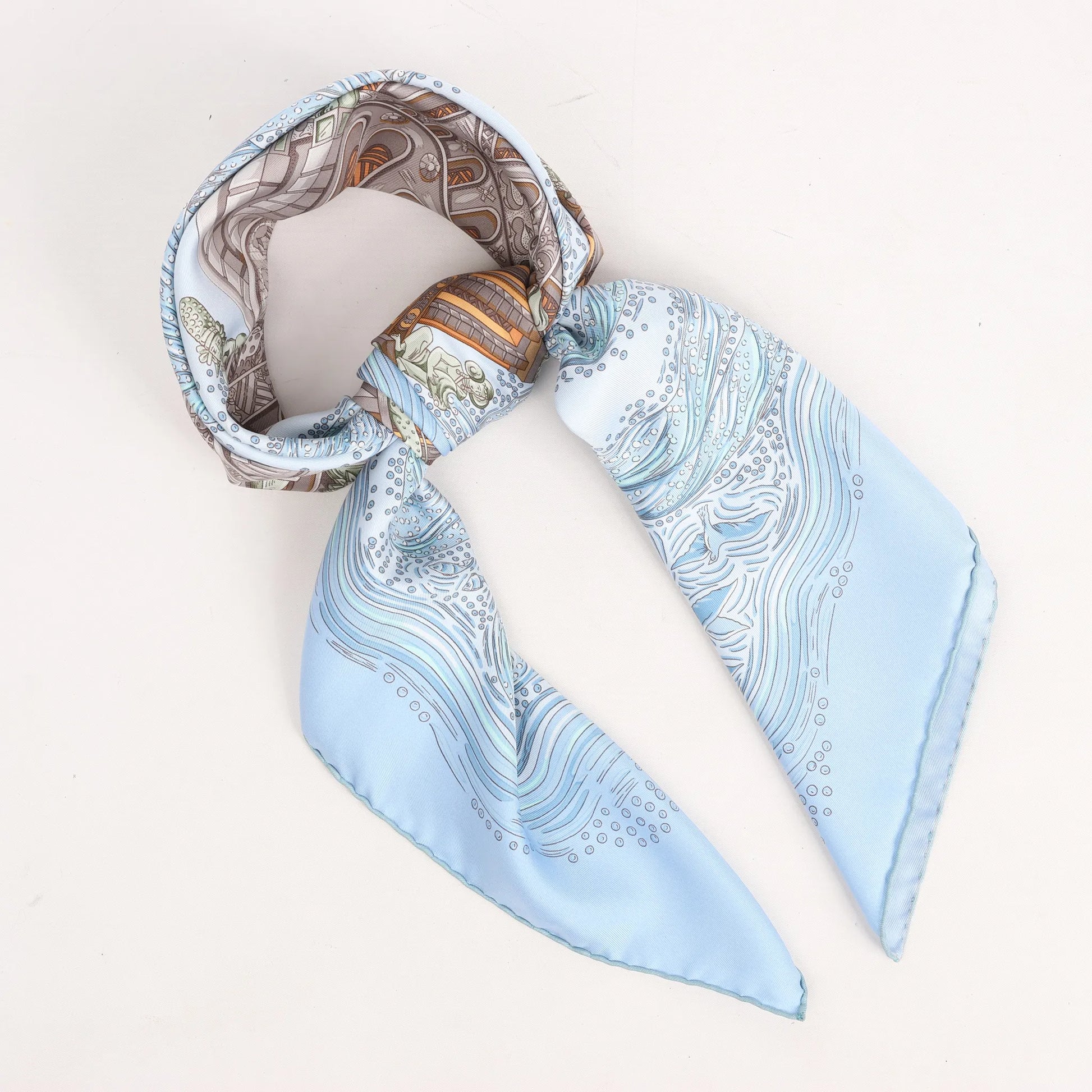 Das blaue Seidentaschentuch Hermès Carré 90 „Les Rivières de Babel“ besticht durch kunstvolle Architektur und fließende Flussmotive auf edler Seide – Kunst trifft auf Luxus.