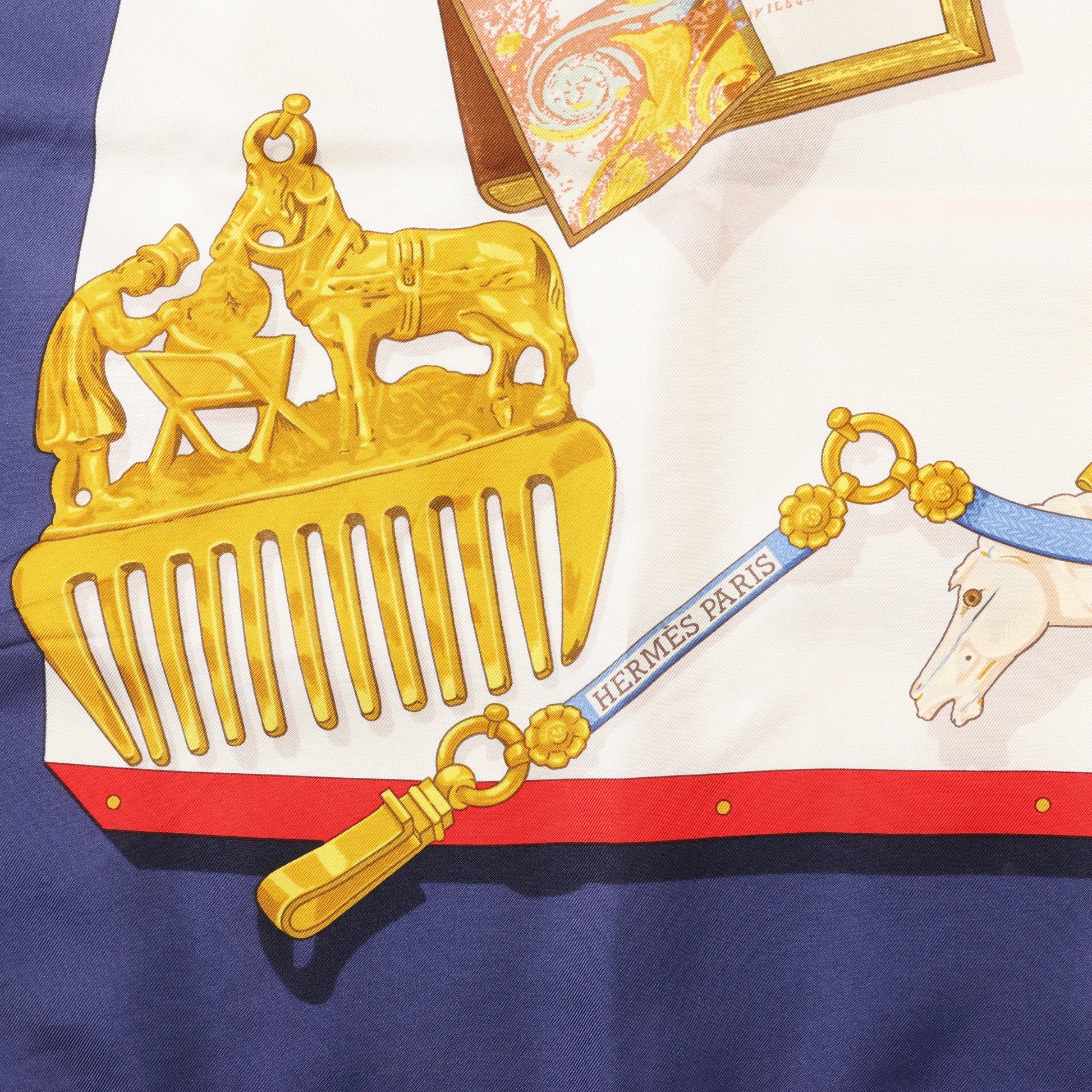 Der Hermès Carré 90 „Mémoire d'Hermès“ in Marineblau ist ein luxuriöser Seidenschal, der das reiche Erbe der Marke zelebriert und mit ikonischen Objekten und historischen Motiven in exquisiten Details illustriert ist.