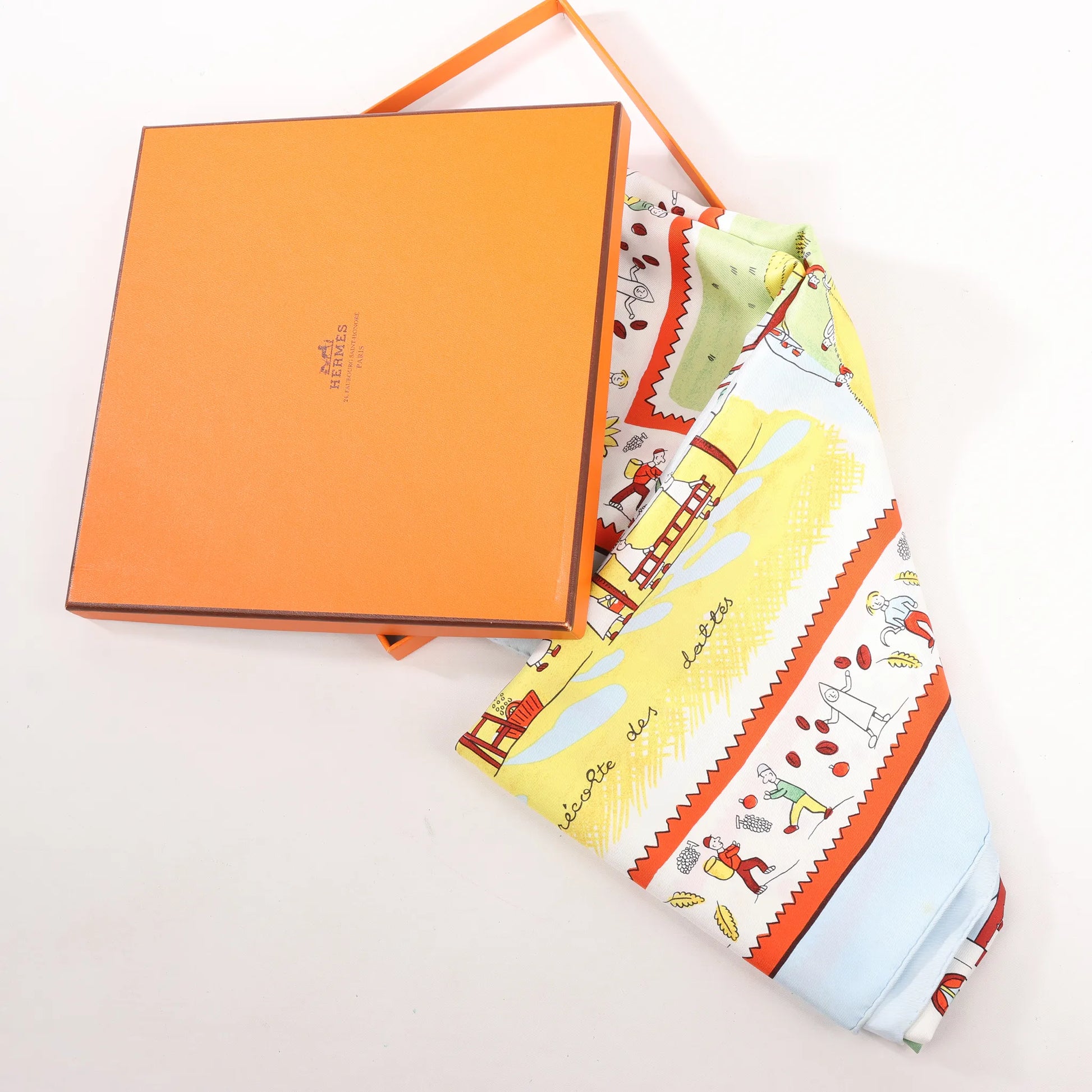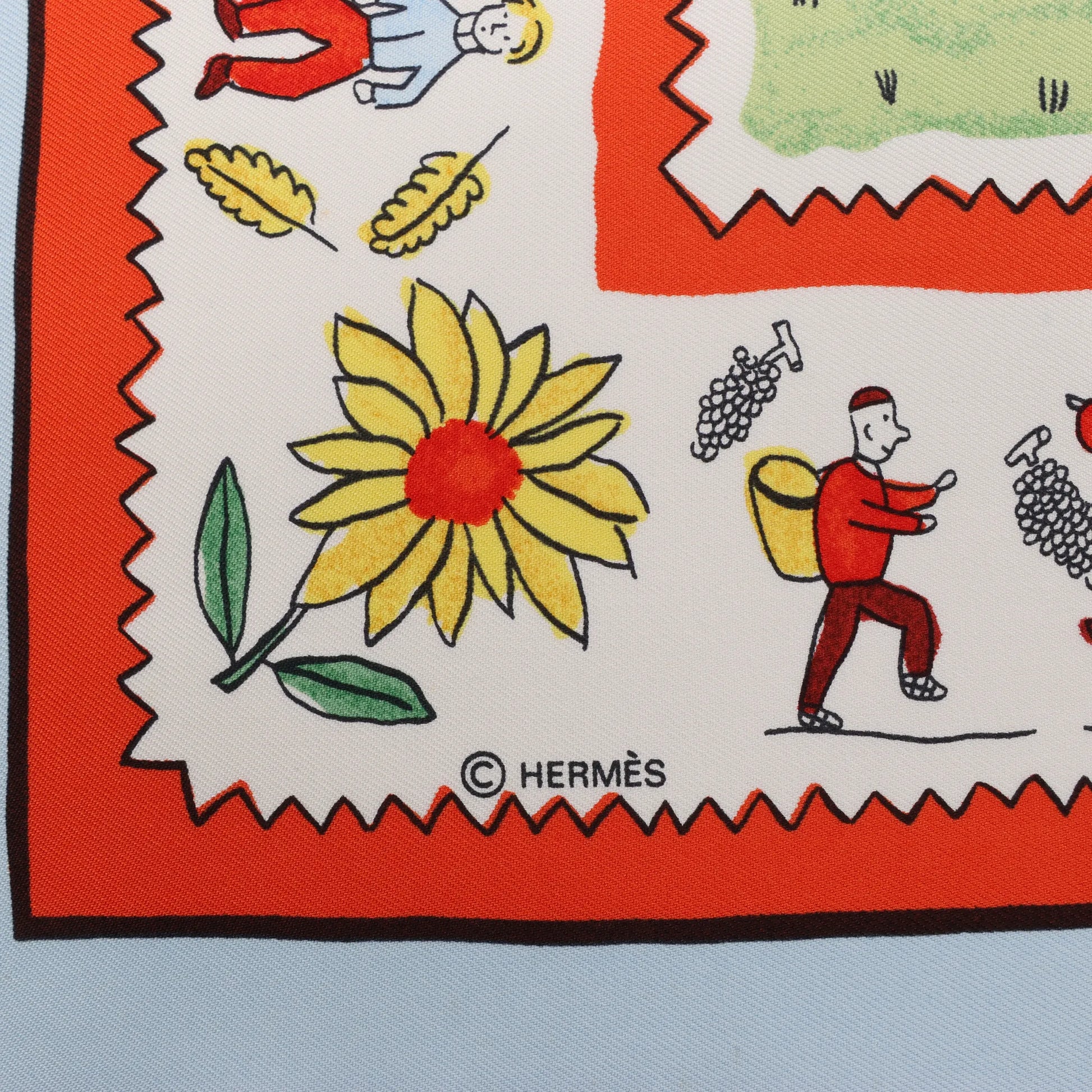 Der hellblaue Seidenschal „Retour à la Terre“ von Hermès Carré 90 fängt den Charme des Landlebens mit verspielten, handgezeichneten Szenen aus Landwirtschaft und Natur ein. Gefertigt aus weichem Seidentwill, ist er eine charmante und farbenfrohe Hommage an die Einfachheit und die Natur.