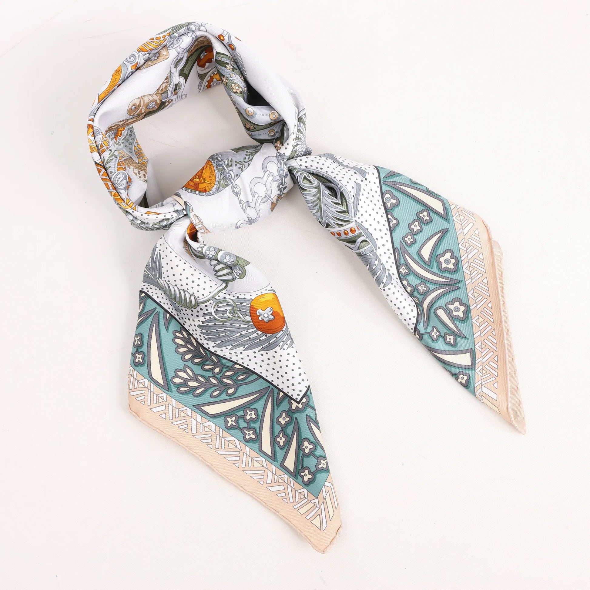 Der Hermès Carré 90 „Zenobie Reine de Palmyre“ in Beige und Grün ist eine Hommage an die Eleganz vergangener Zeiten. Gefertigt aus 100 % Seide, besticht dieser luxuriöse Schal durch kunstvollen Schmuck, inspiriert von Königin Zenobia von Palmyra – eine opulente Verbindung von Geschichte und Haute Couture.