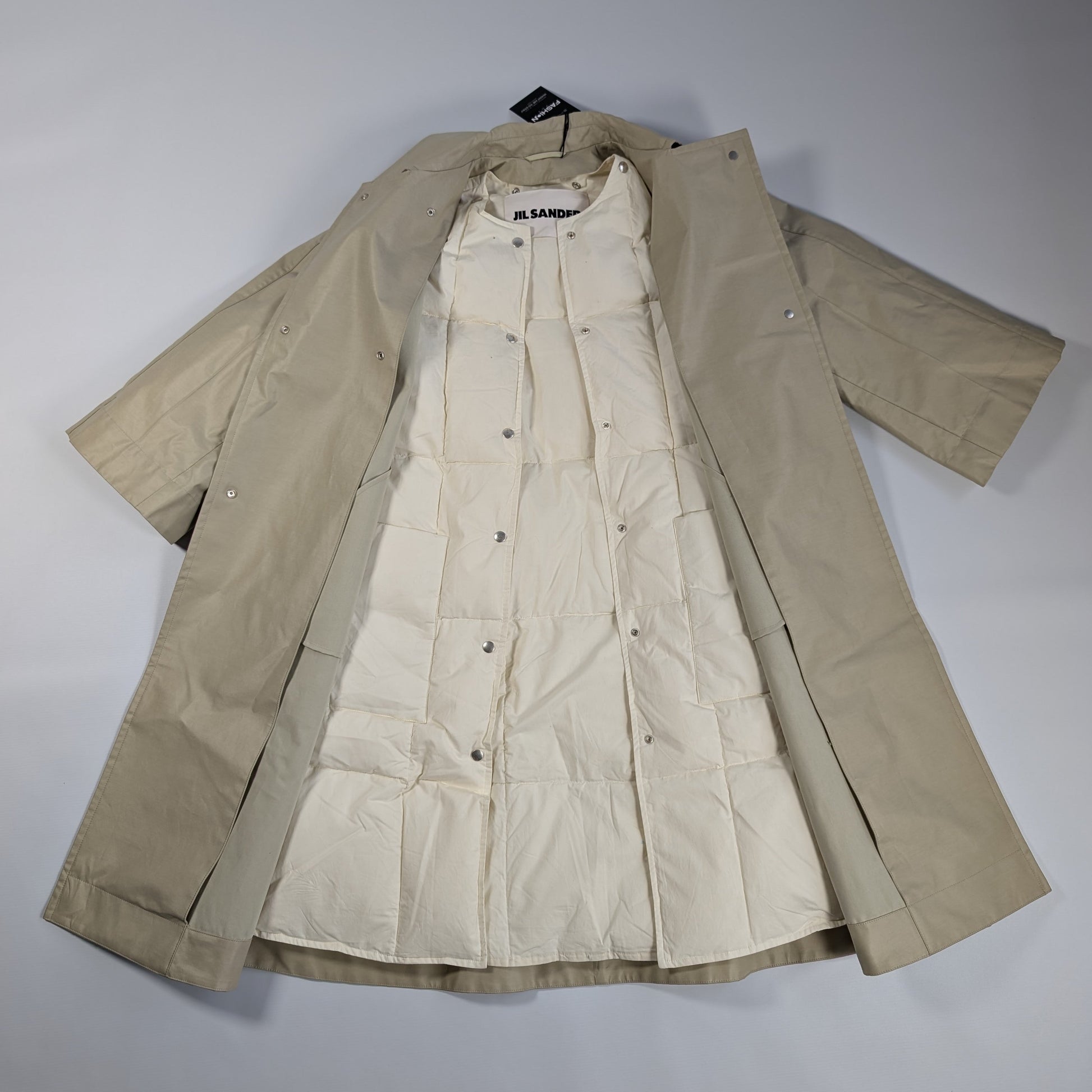 Eleganter beigefarbener Mantel von Jil Sander mit herausnehmbarer Dauneninnenjacke. Die minimalistische Außenschicht besteht aus einer Polyester-Baumwollmischung und eignet sich perfekt für vielseitige Lagenlooks. Ideal für die Übergangszeit oder als stilvolles Accessoire an kälteren Tagen.