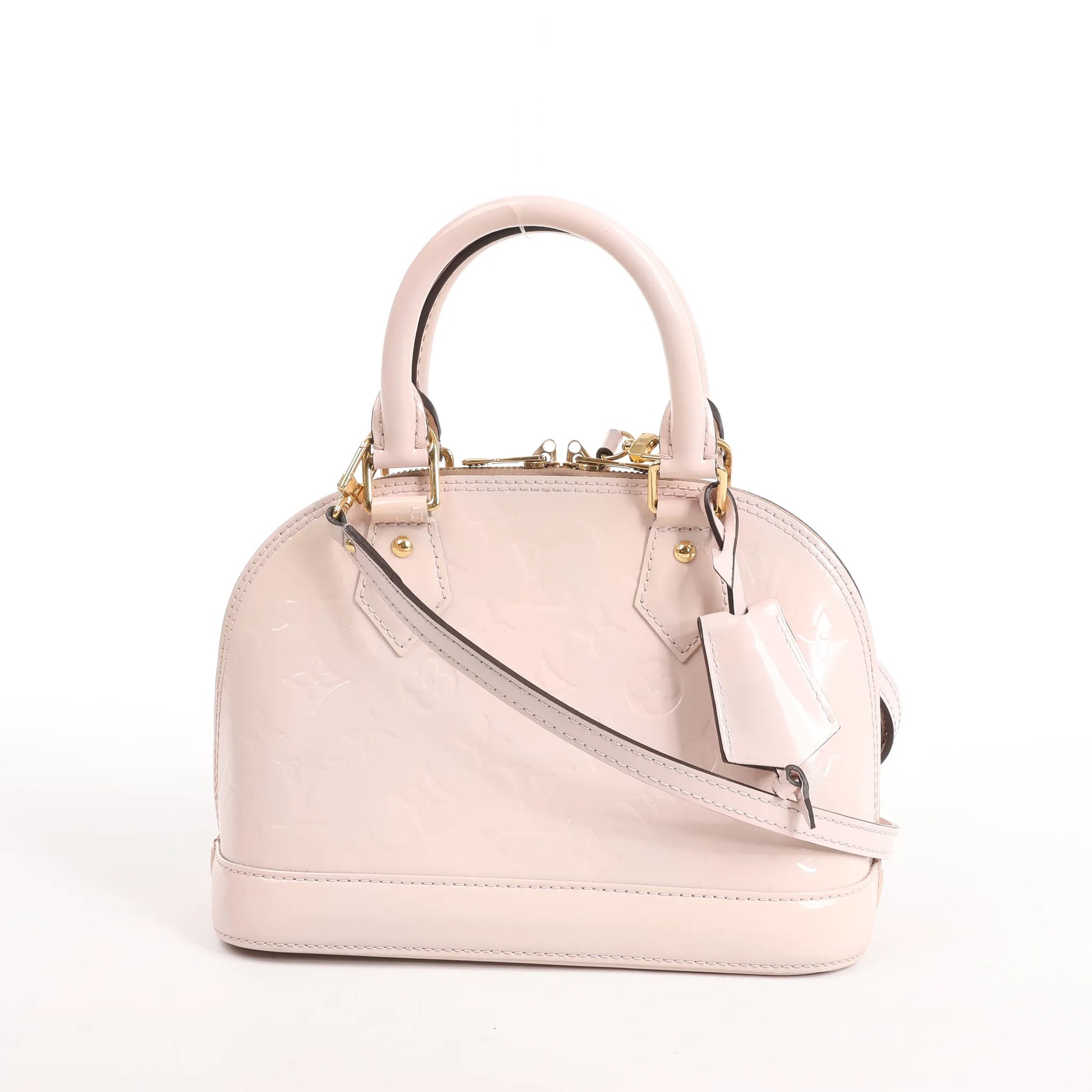 Die elegante und kompakte Louis Vuitton Alma BB M50415 aus Monogram Vernis Lackleder besticht durch einen zarten Rosaton, eine strukturierte Silhouette und zwei Tragemöglichkeiten für zeitlose Eleganz.