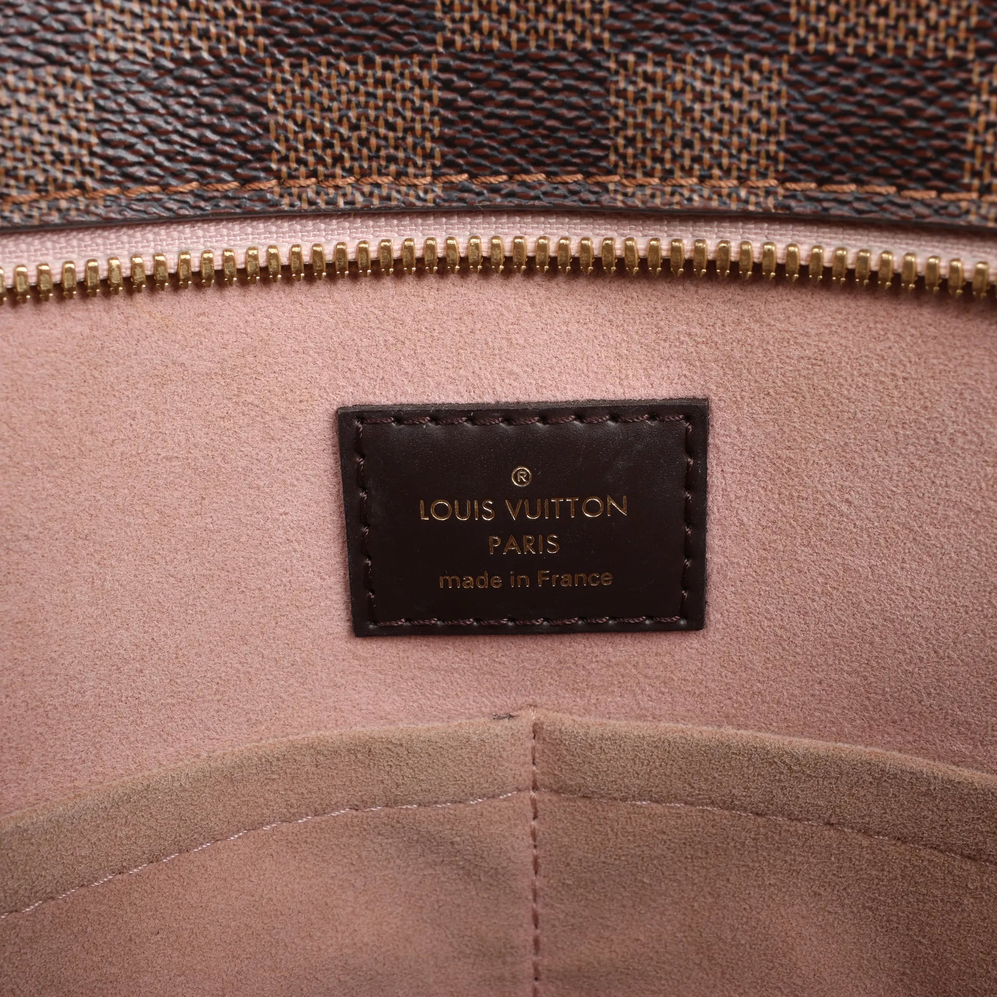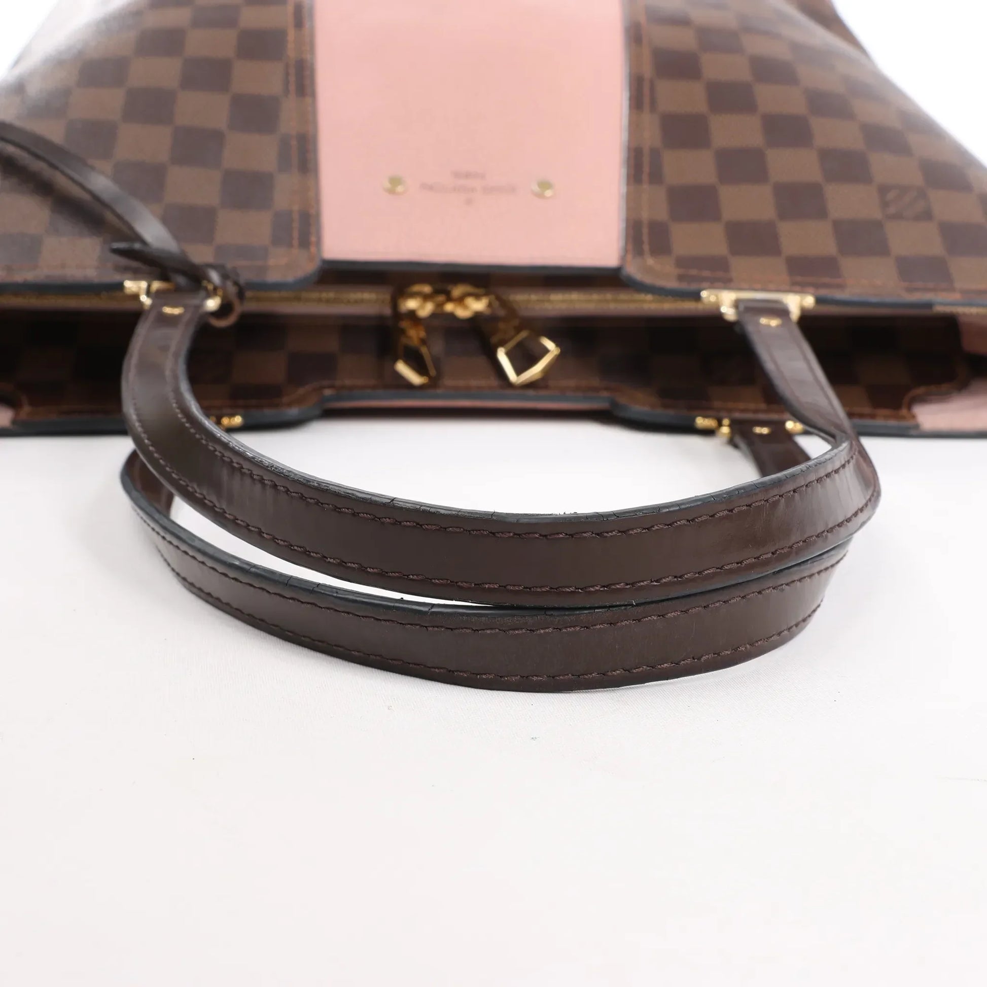 The Louis Vuitton Jersey Shoulder Bag N44041 combines classic Damier Ebene canvas with soft pink leather for a chic, feminine look. This 2-way style offers versatile wear with dual top handles and a removable strap for effortless everyday elegance.