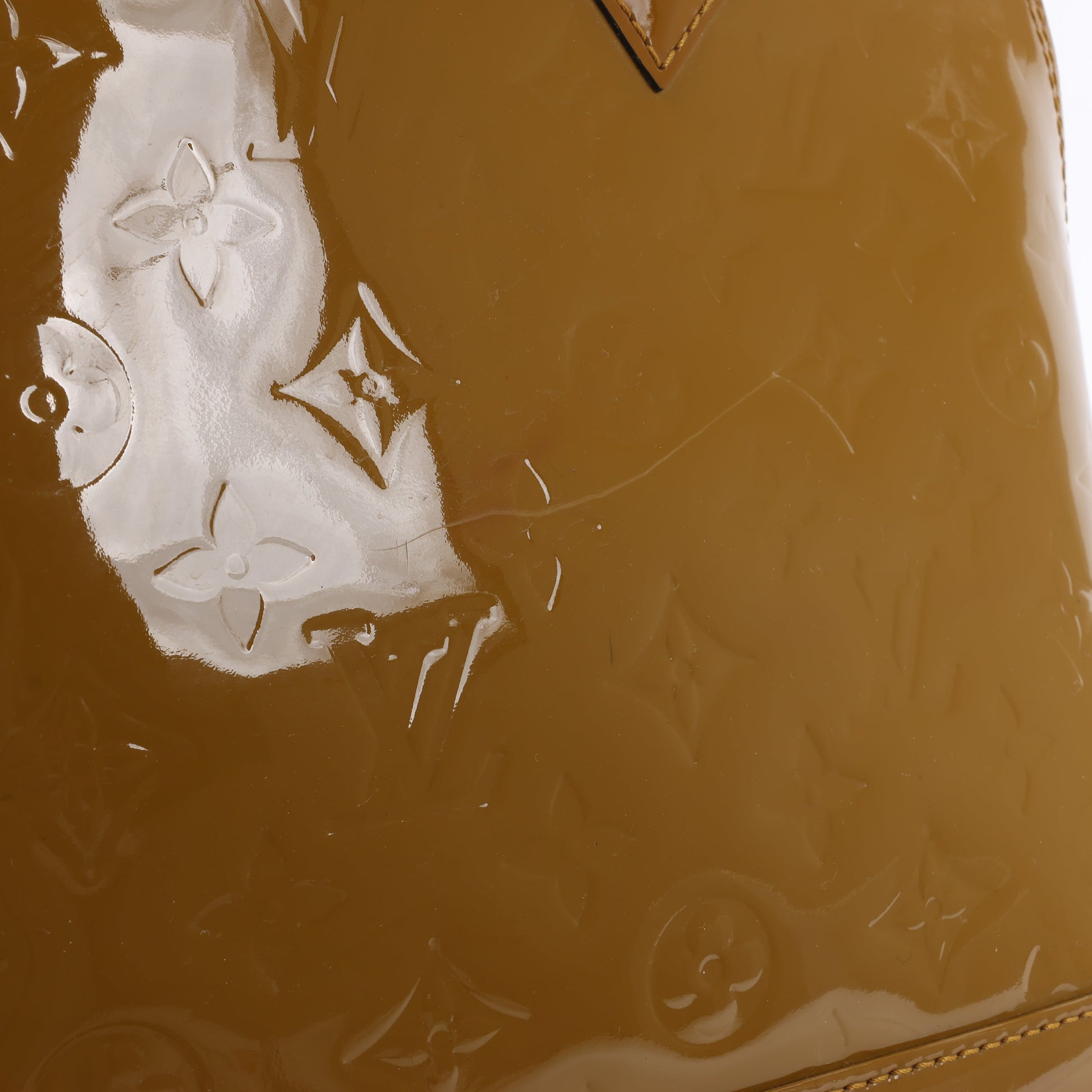 Louis Vuitton Vernis Alma handbag in olive patent leather, featuring the iconic monogram embossing, structured silhouette, and gold-tone hardware. A bold, glossy statement piece that exudes timeless elegance with a modern twist.