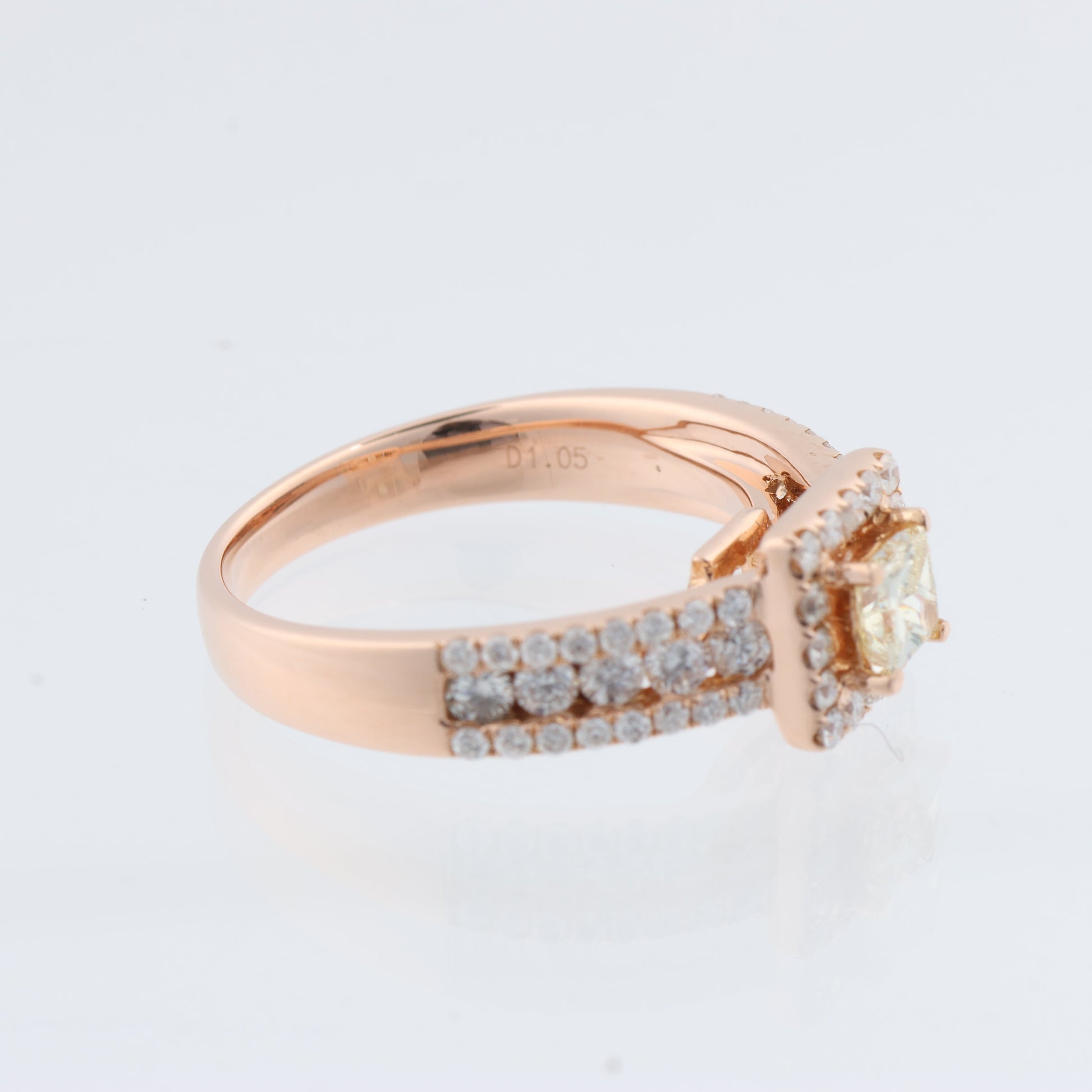 Atemberaubender Ring aus 18-karätigem Roségold, Größe 52 (EU), besetzt mit 59 natürlichen Diamanten von insgesamt ca. 1,15 ct. Er verfügt über einen hellgelben Diamanten im Prinzessschliff (0,65 ct, SI1) und 58 nahezu farblose Diamanten im Brillantschliff (G–H, SI–I1). Gesamtgewicht: 4,97 g. Zertifizierte Eleganz.