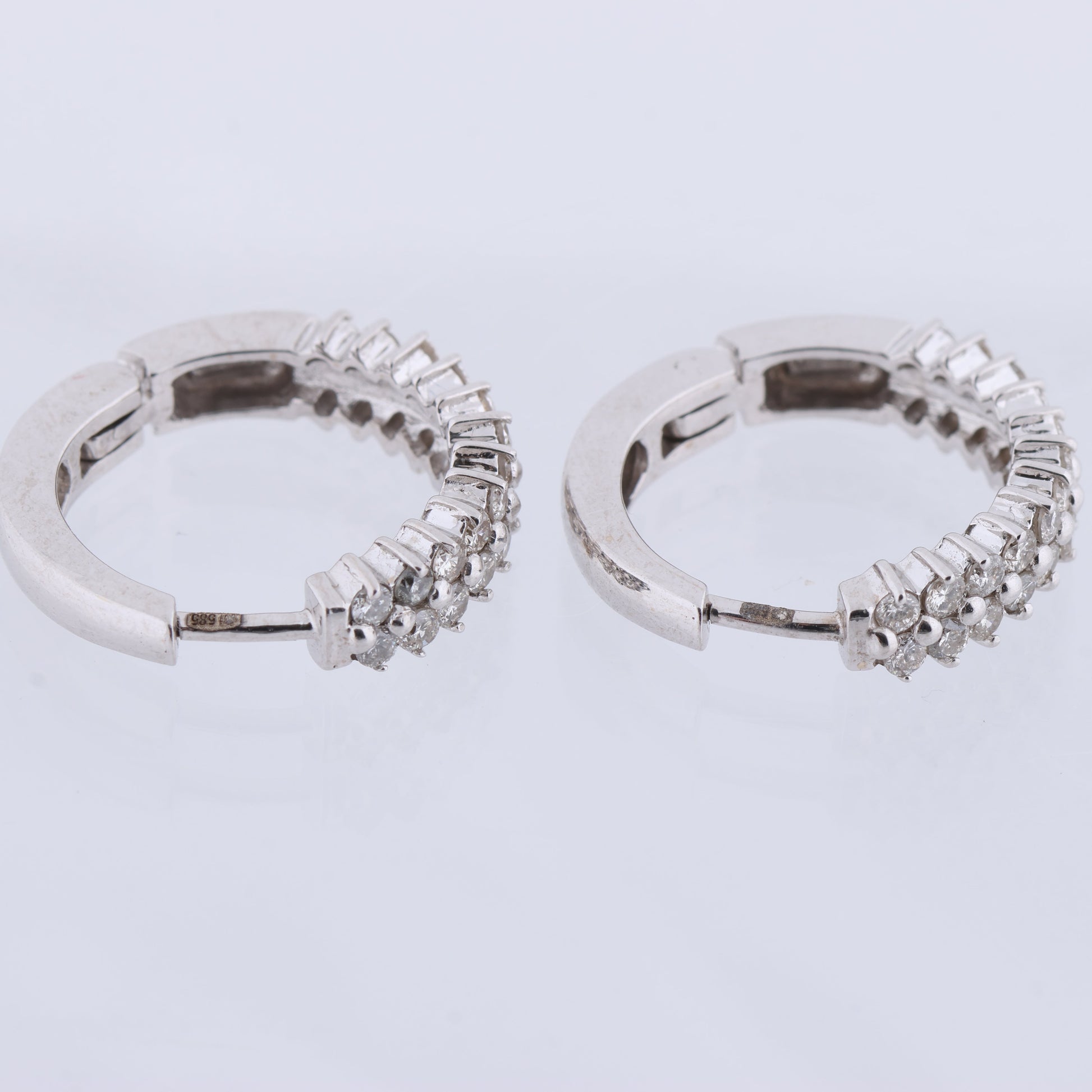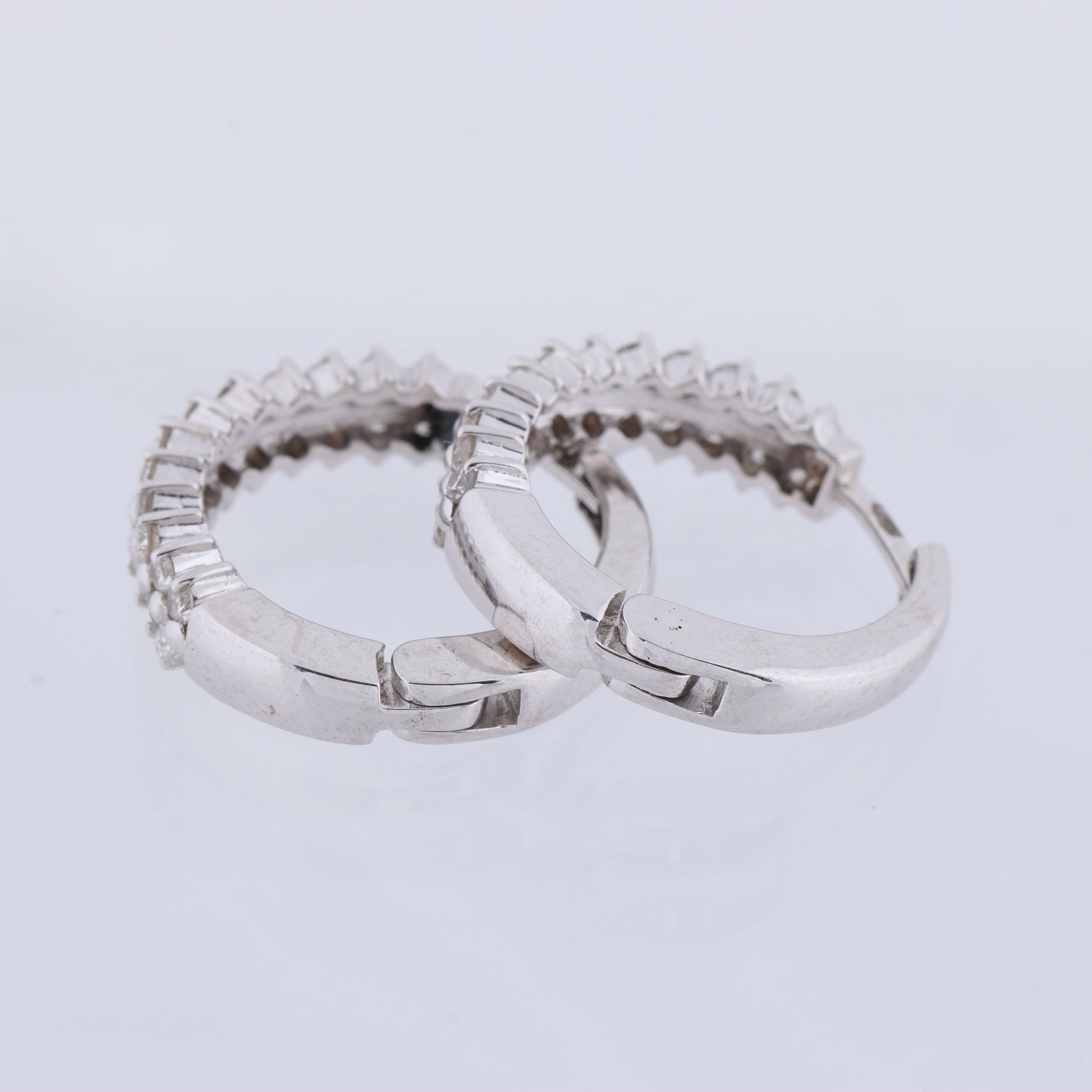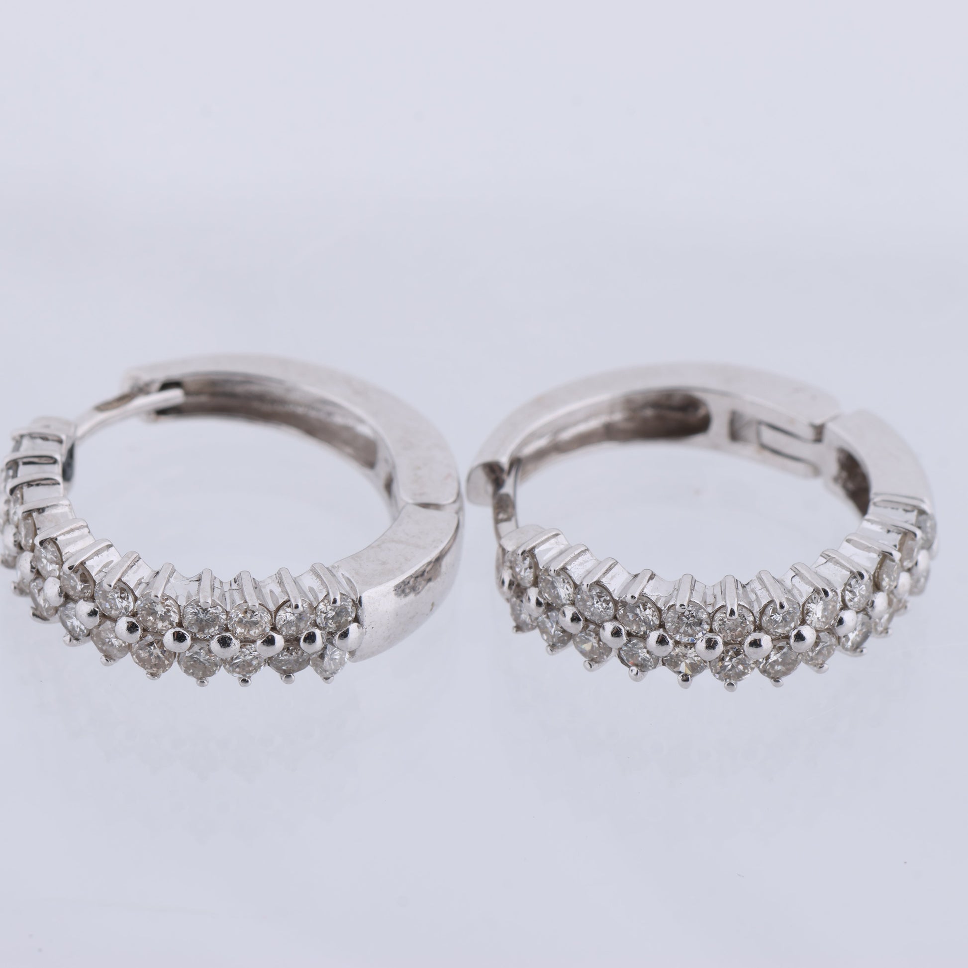 Verleihen Sie Ihrem Stil mit diesen atemberaubenden Ohrringen aus 14-karätigem Weißgold, besetzt mit 48 natürlichen Diamanten mit einem Gesamtgewicht von 1,0 ct, das gewisse Extra. Die brillant geschliffenen Steine in nahezu farblosen Farbtönen (JL) und funkelnder Reinheit (SI-I1) verleihen diesen zeitlosen Creolen Eleganz und Raffinesse.