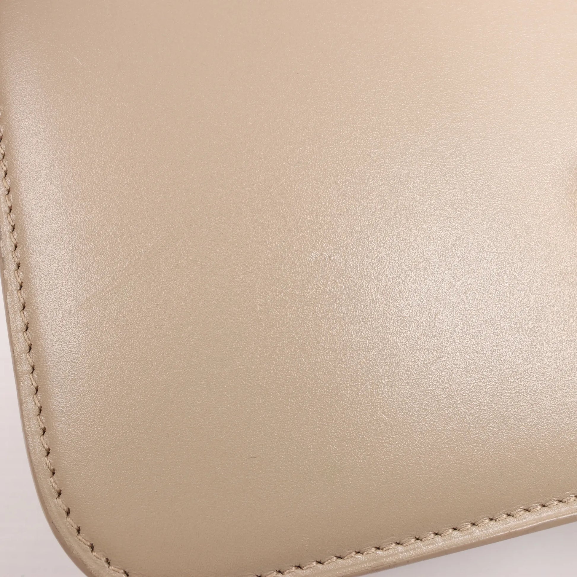 The Saint Laurent Paris Carré Shoulder Bag 633214 in beige leather exudes refined elegance. Crafted from smooth calfskin with a structured silhouette, it features a gold-tone clasp and adjustable strap—perfect for sophisticated, everyday styling.