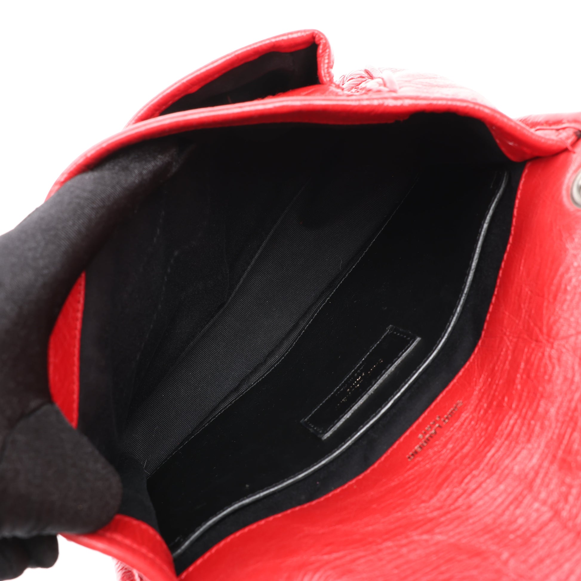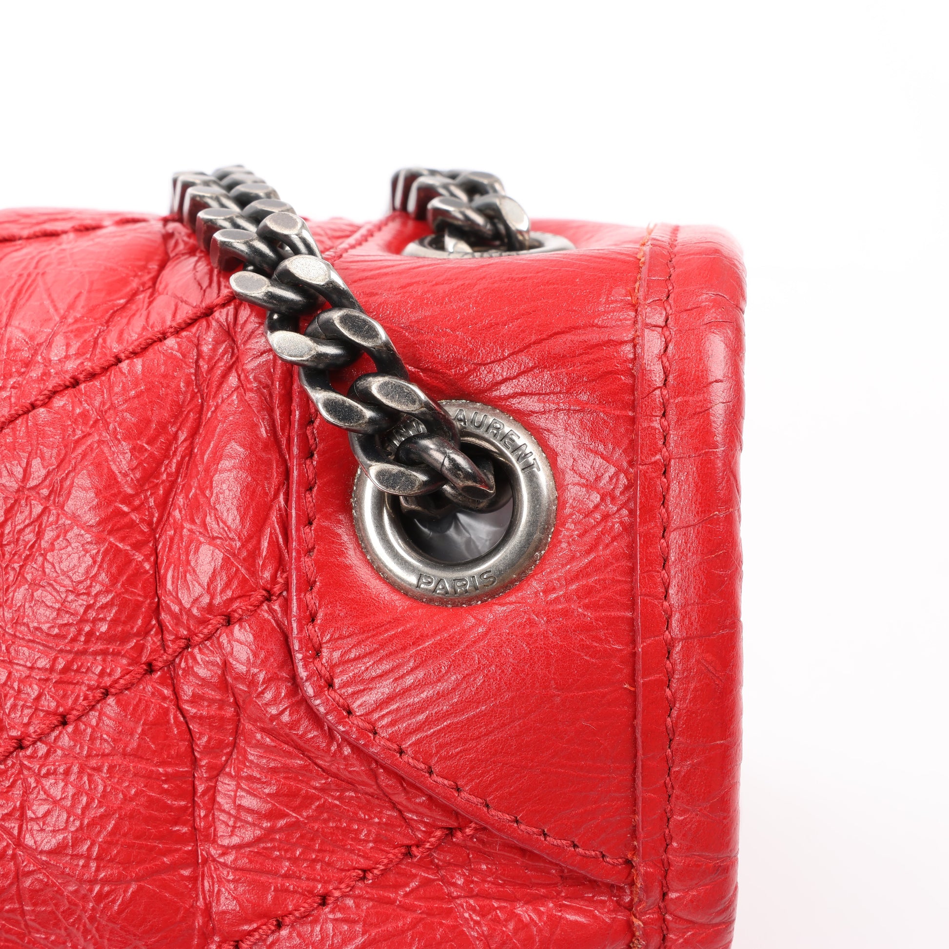 The Saint Laurent Paris Niki Baby Leather Chain Shoulder Bag in Red (533037) features crinkled leather with tonal YSL logo hardware. Its versatile chain strap allows shoulder or crossbody wear, while the front flap opens to a compact, chic interior.