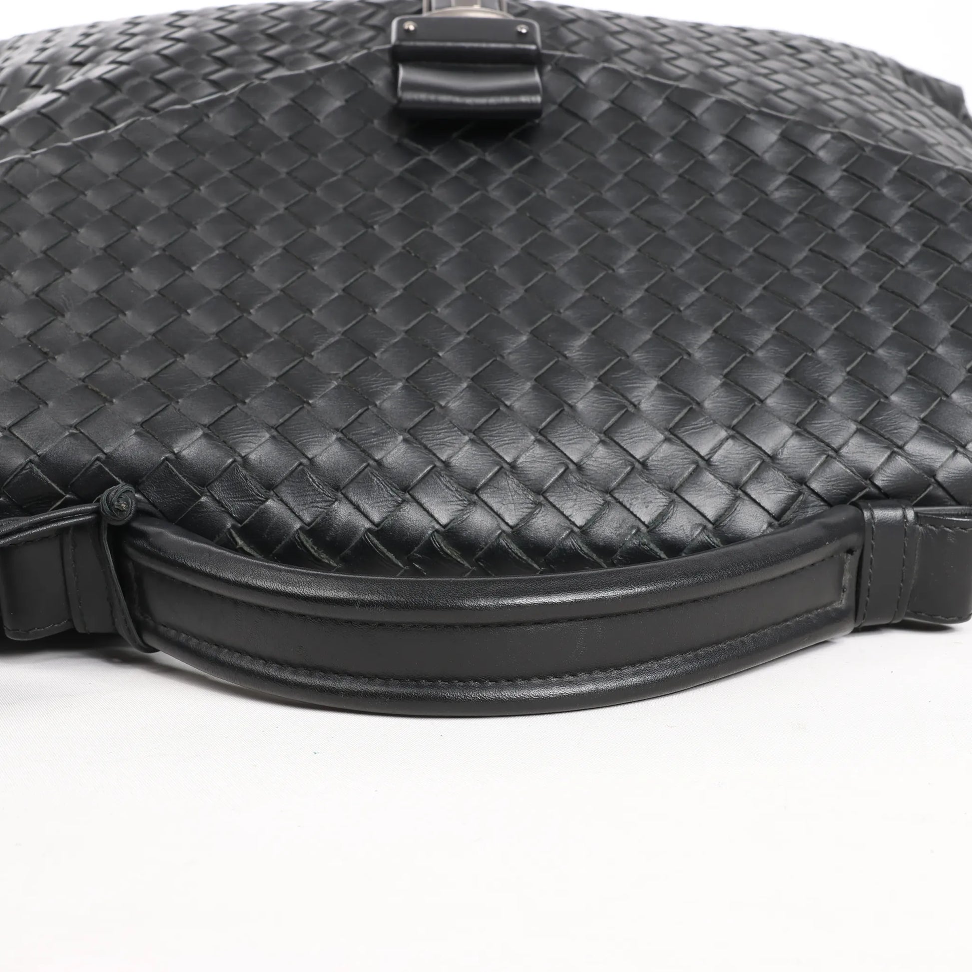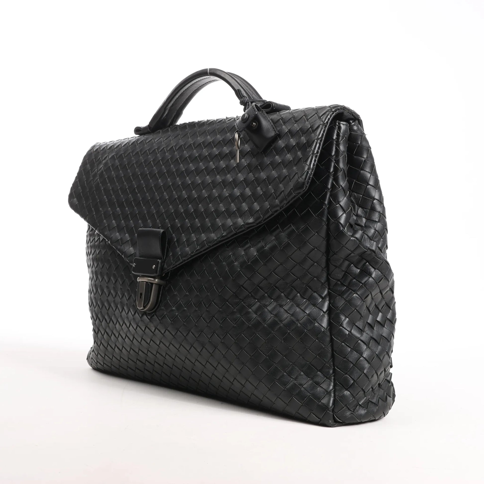 Le sac à main Bottega Veneta Intrecciato en cuir noir illustre le savoir-faire artisanal emblématique de la marque en matière de tissage de cuir luxueux, offrant une sophistication élégante et un style intemporel aux professionnels modernes.