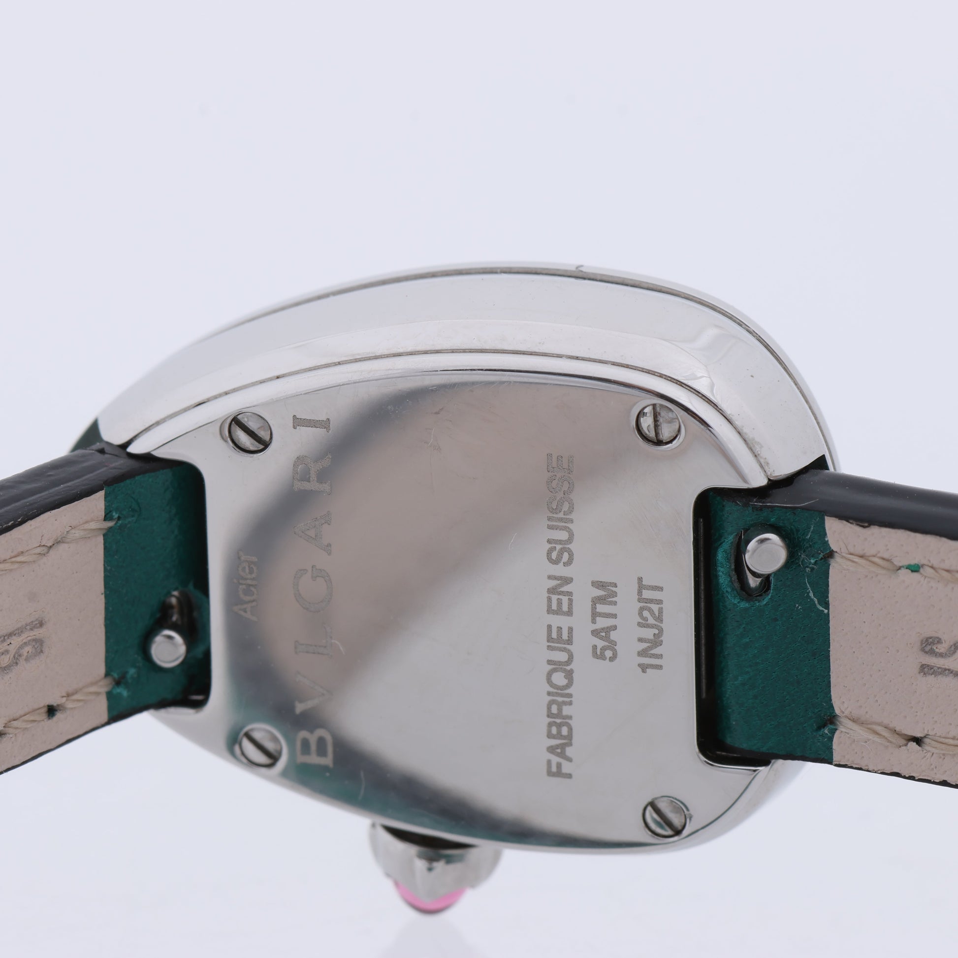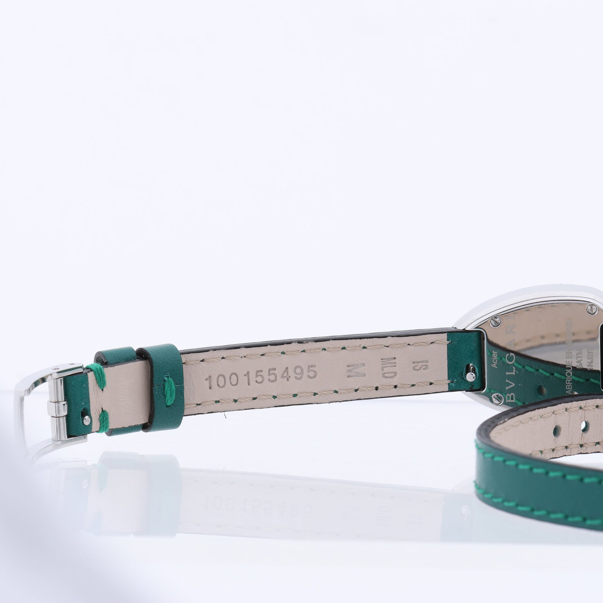 La montre Bulgari Serpenti SPS27 1NJ2IT est dotée d'un boîtier en acier inoxydable, d'un cadran noir, d'un mouvement à quartz et d'un bracelet en cuir vert double tour. Avec sa forme emblématique en tête de serpent, cette pièce élégante allie modernité et design intemporel.