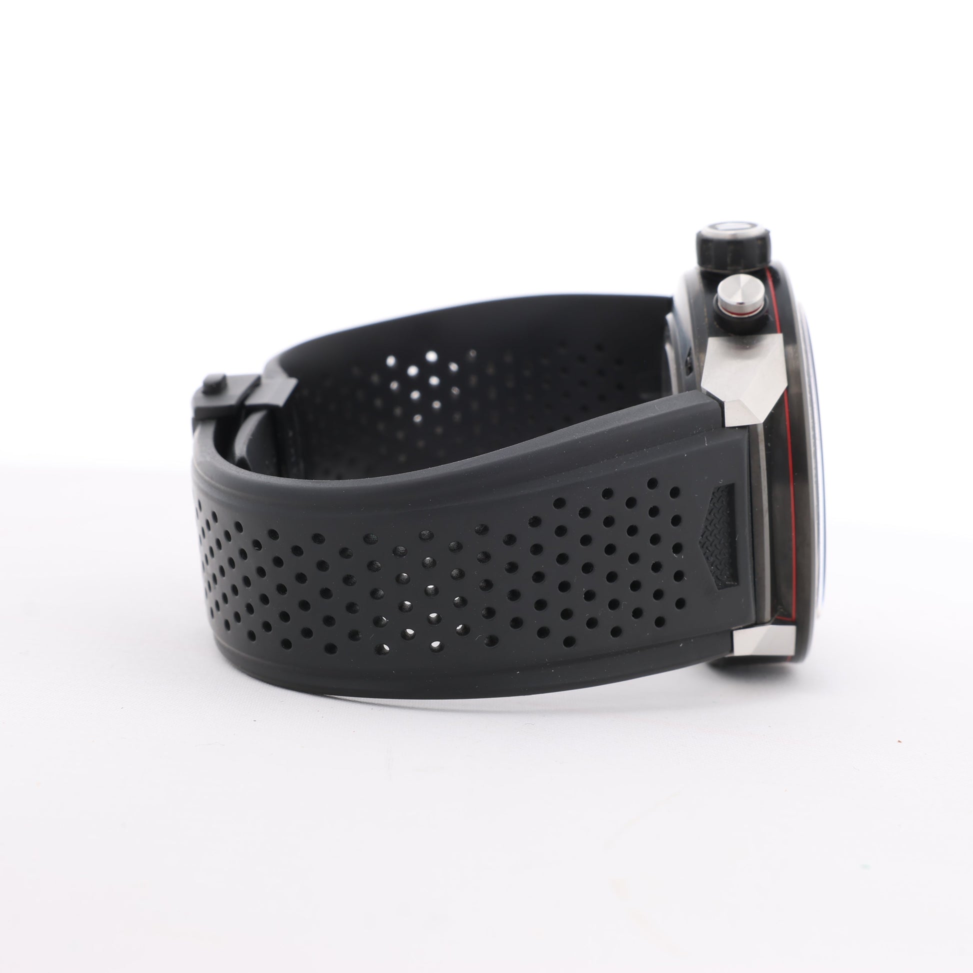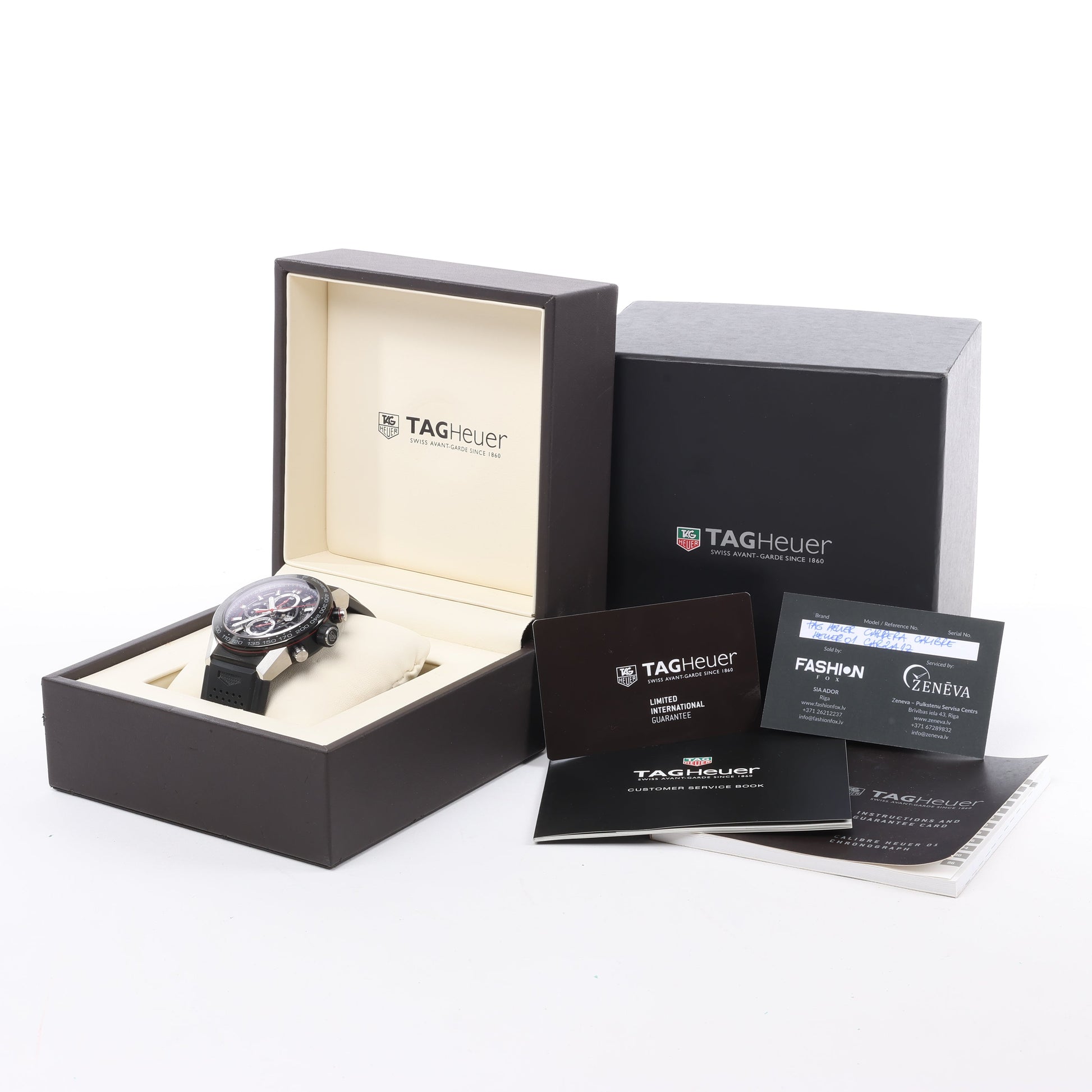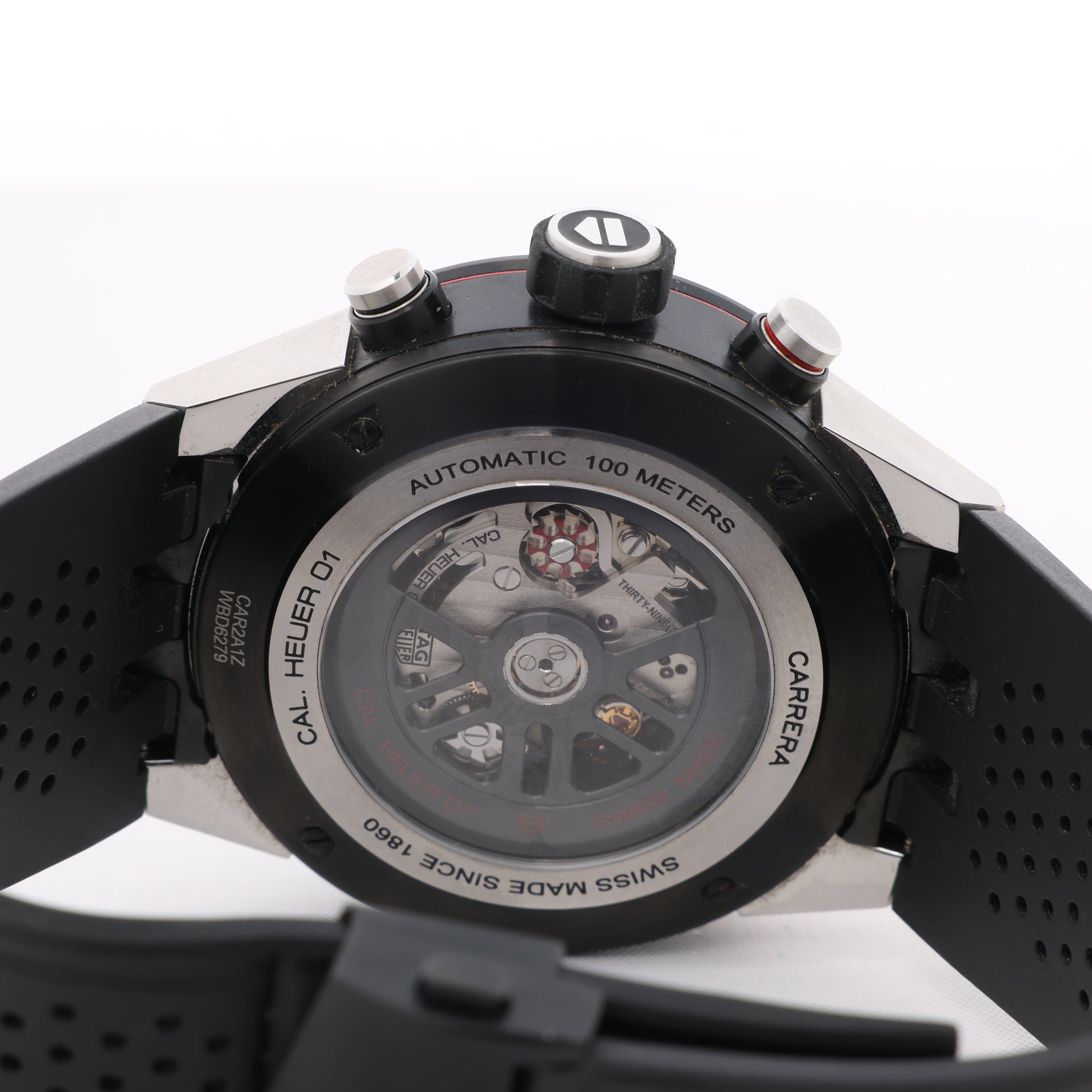 TAG Heuer Carrera Calibre Heuer 01 CAR2A1Z.FT6044. Cadran squelette saisissant, boîtier en acier inoxydable, lunette tachymétrique noire et bracelet en caoutchouc : une précision haute performance alliée à un esprit de course audacieux.