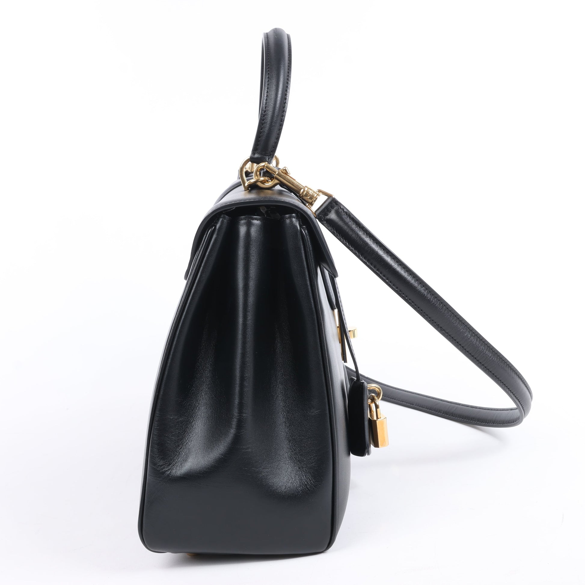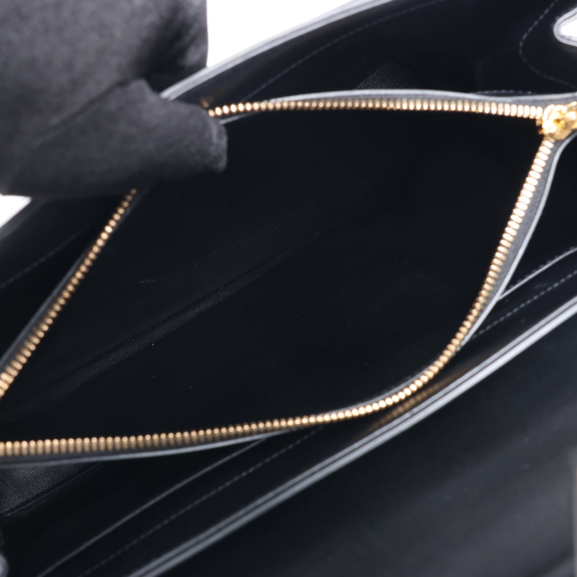 Celine Sac 16 Medium Handbag in smooth black leather with gold-tone hardware, top handle, and detachable strap. A timeless 2-way design exuding Parisian elegance and structured sophistication.