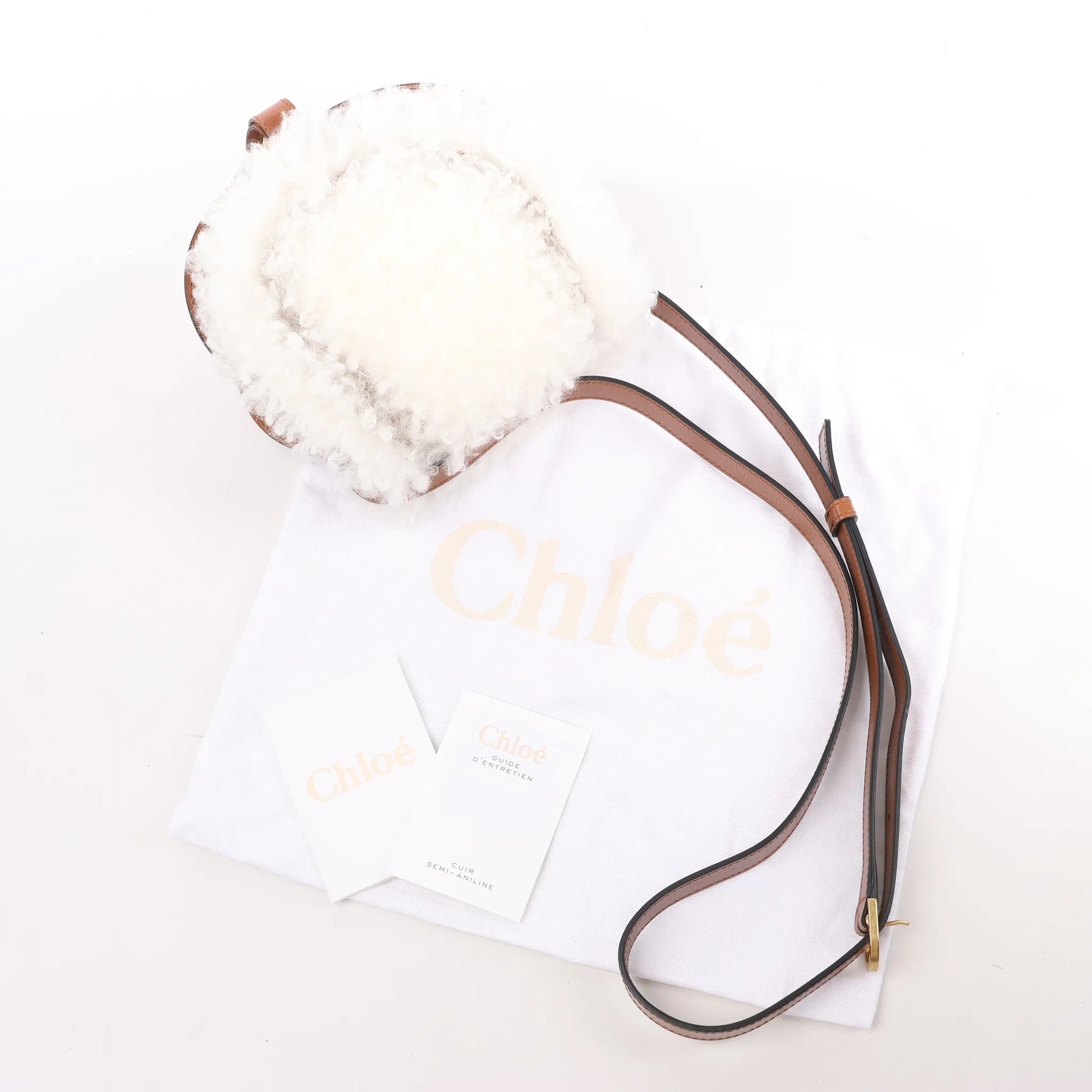Le mini sac bandoulière Marcie de Chloé, en cuir marron et peau lainée boa, offre une texture douillette et un charme équestre emblématique. Compact et élégant, ce modèle arbore une silhouette incurvée et une bandoulière réglable pour un style chic et mains libres.
