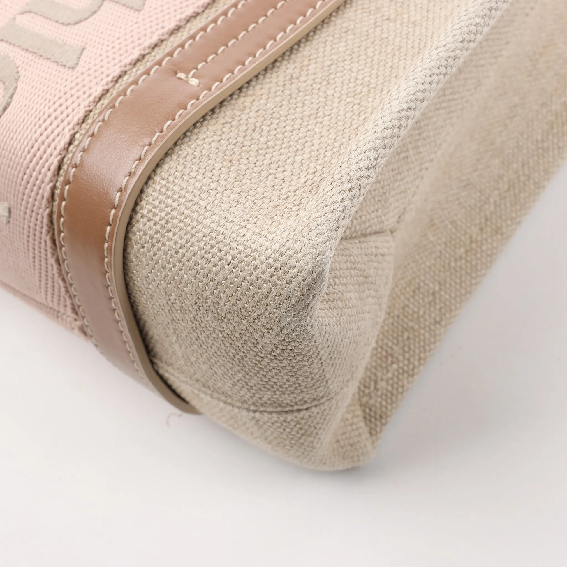 Le petit sac à main Chloé Woody, en toile beige et finitions cuir, est un accessoire chic du quotidien. Doté de poignées à logo et d'une bandoulière amovible, il offre un style polyvalent et un charme parisien naturel.