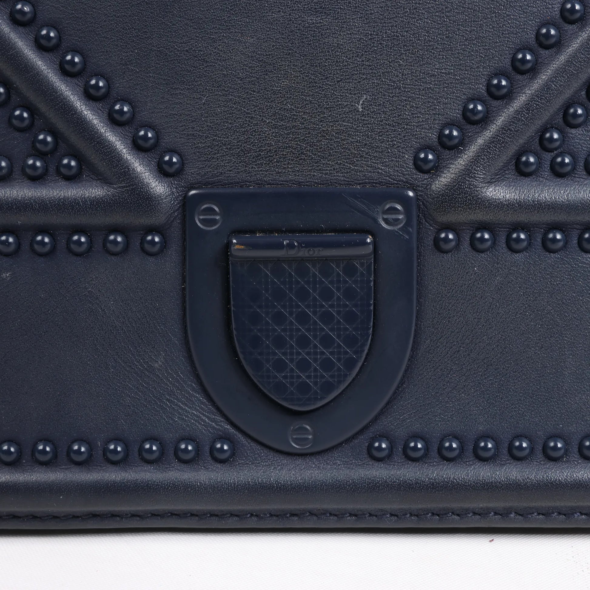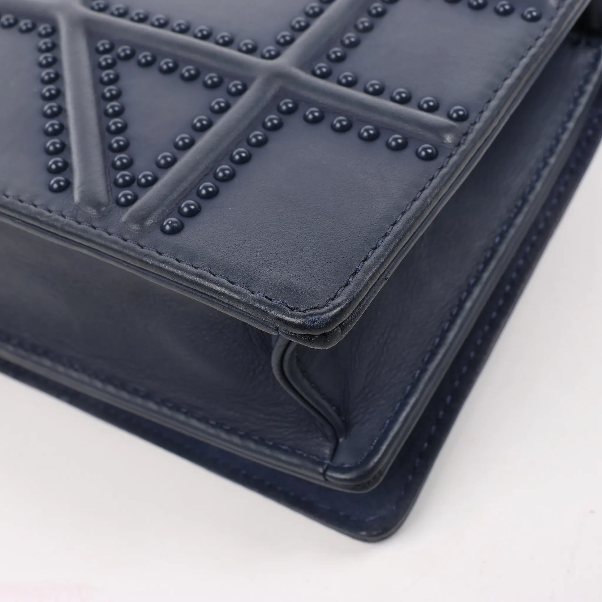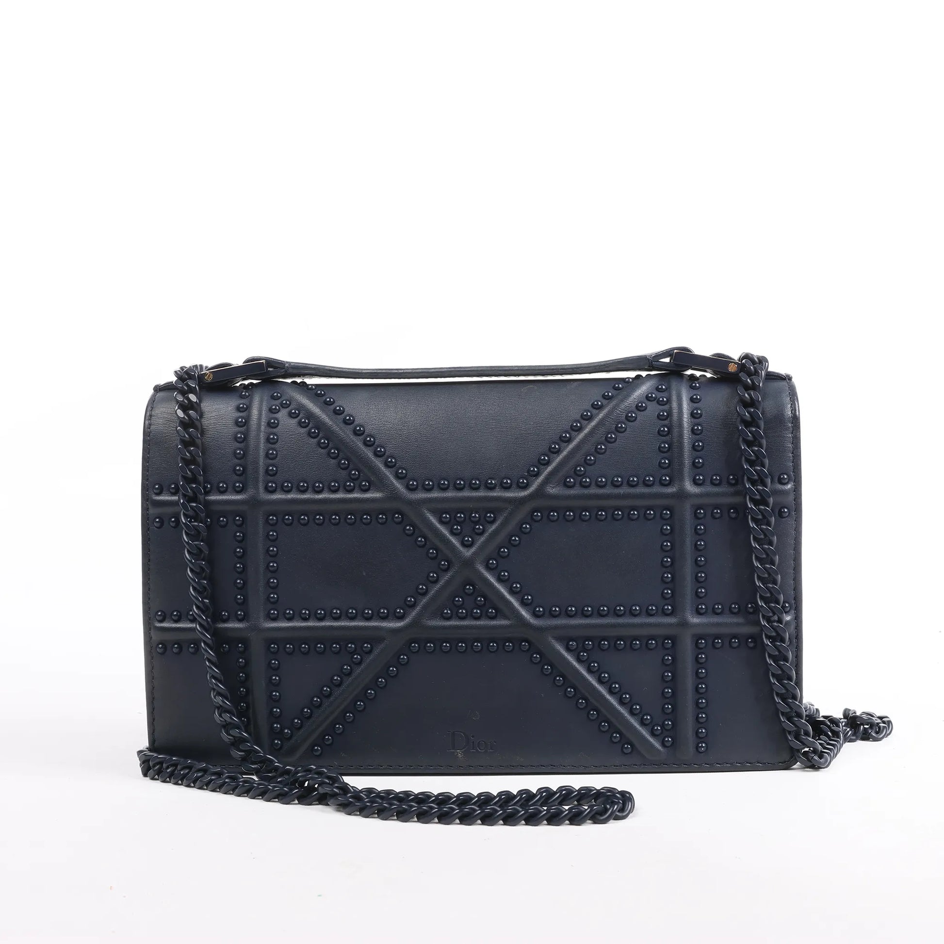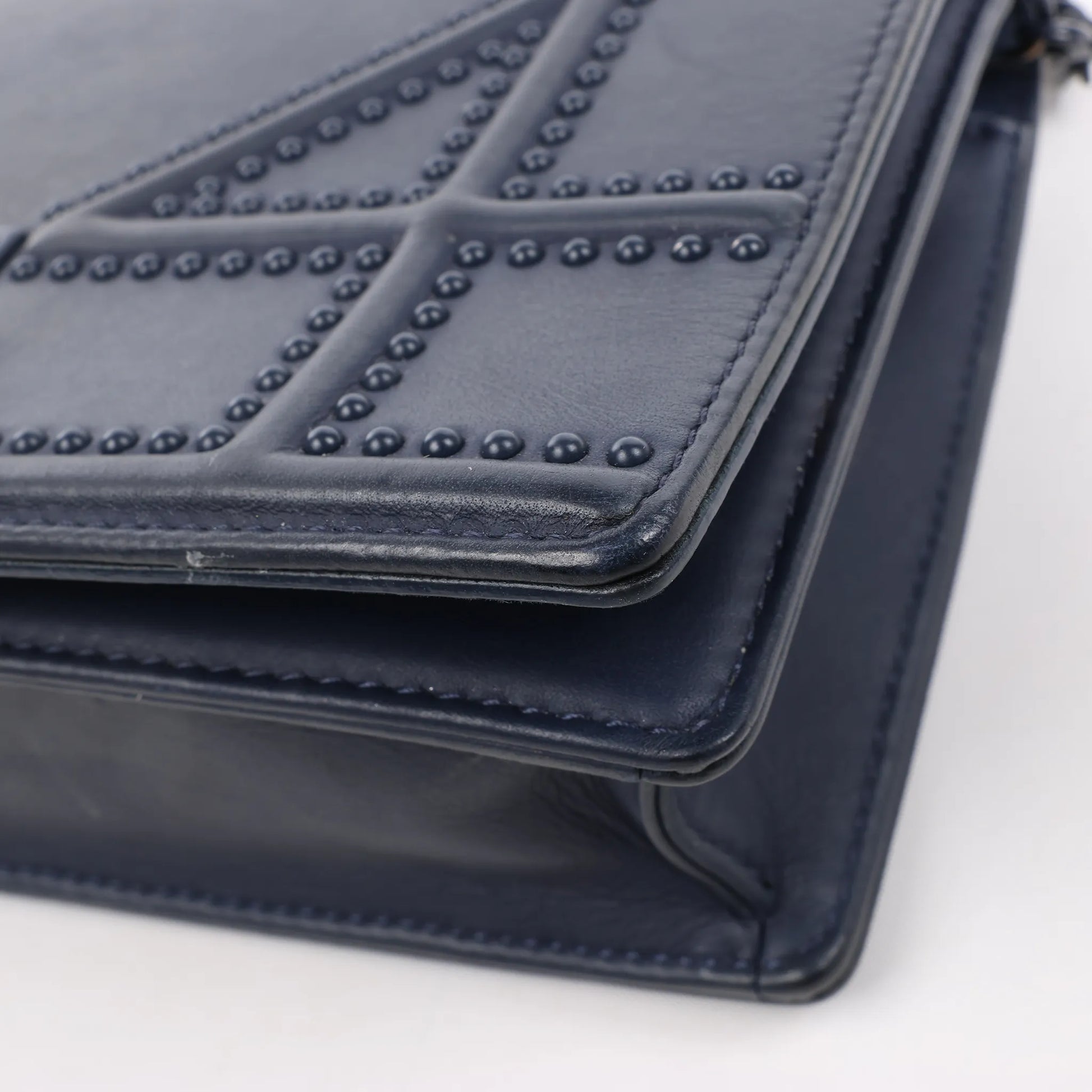 Le sac bandoulière Christian Dior Diorama en cuir bleu marine allie audacieusement structure et style. Orné du motif Cannage clouté signature et d'une bandoulière chaîne épaisse, c'est une pièce luxueuse et remarquable, alliant élégance et style modernes.