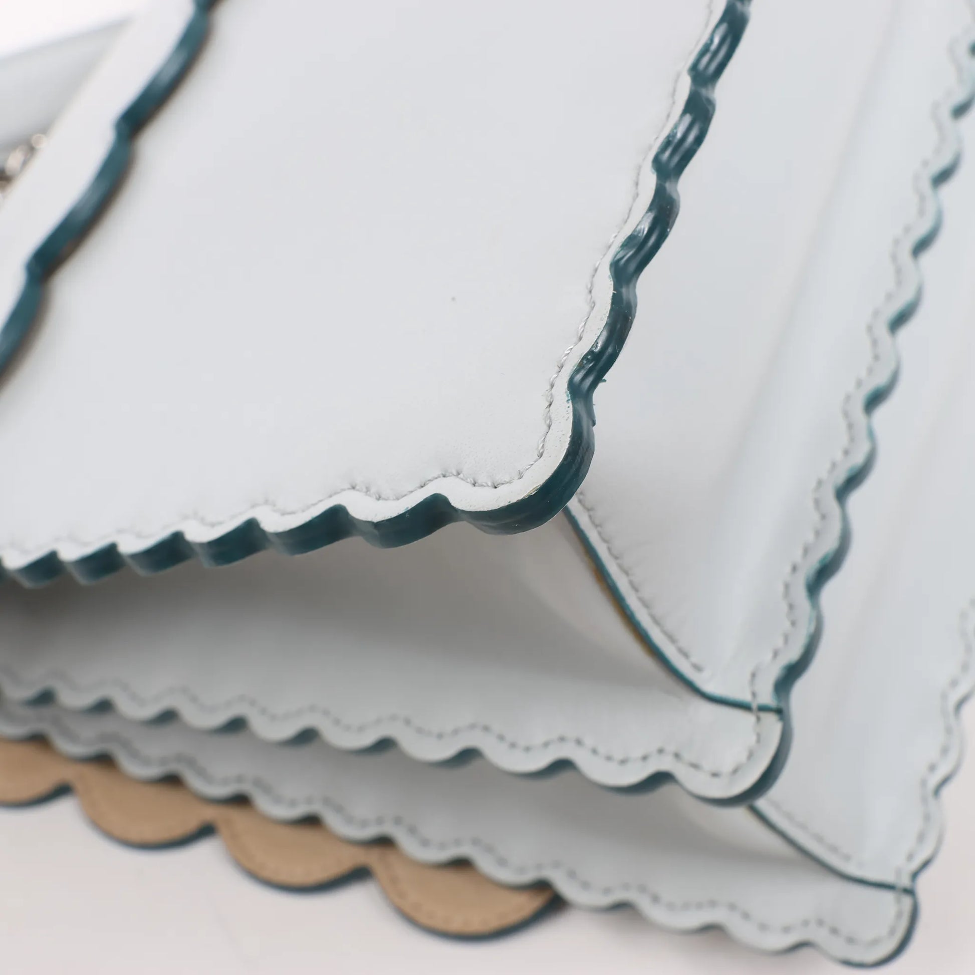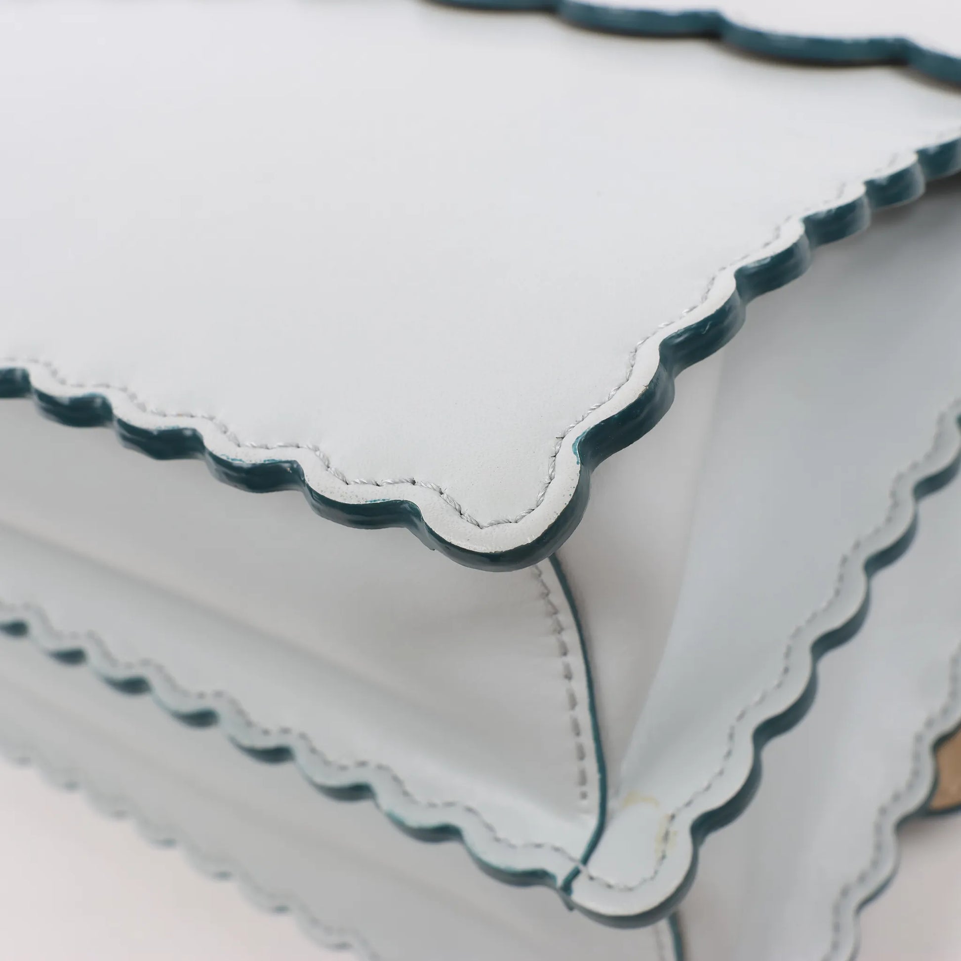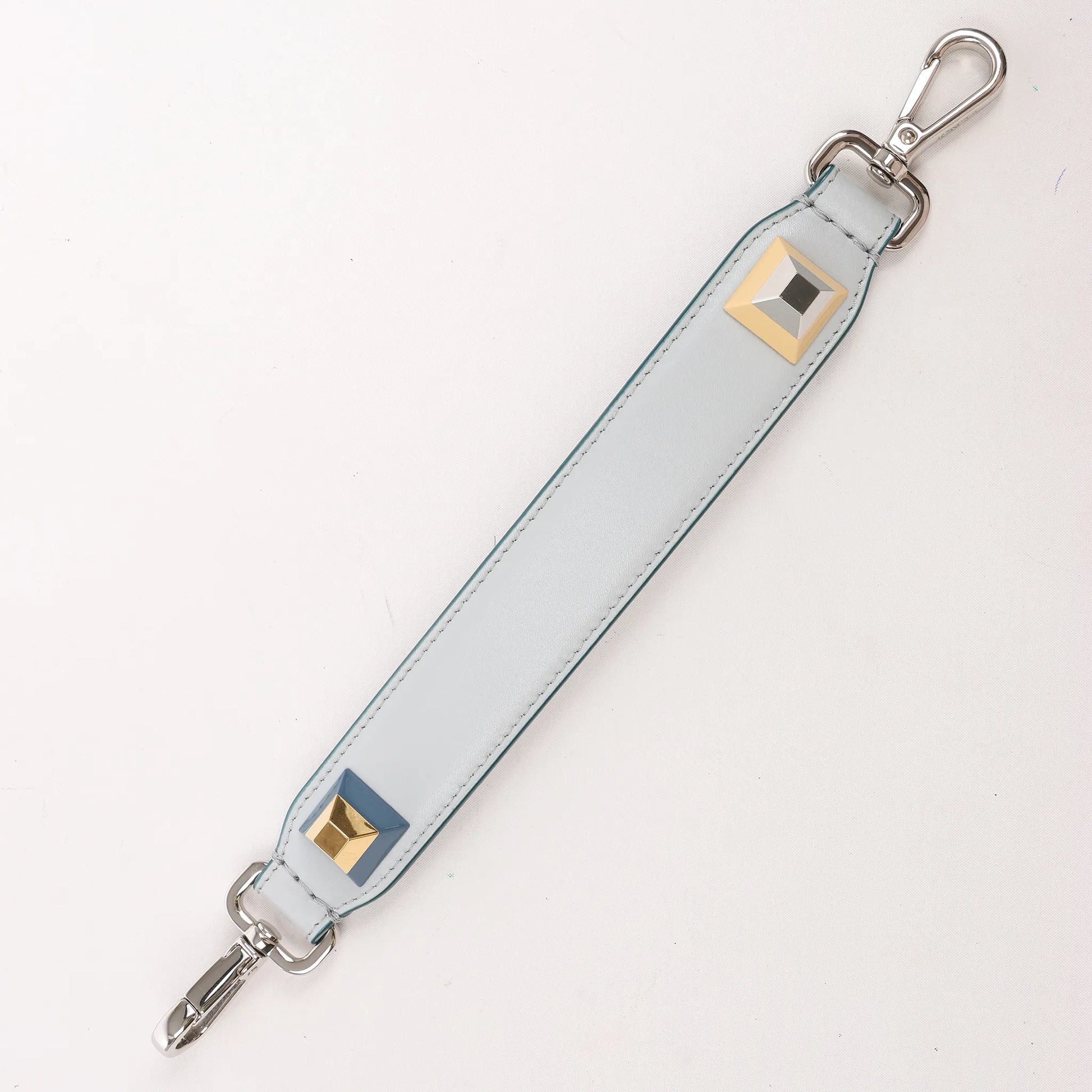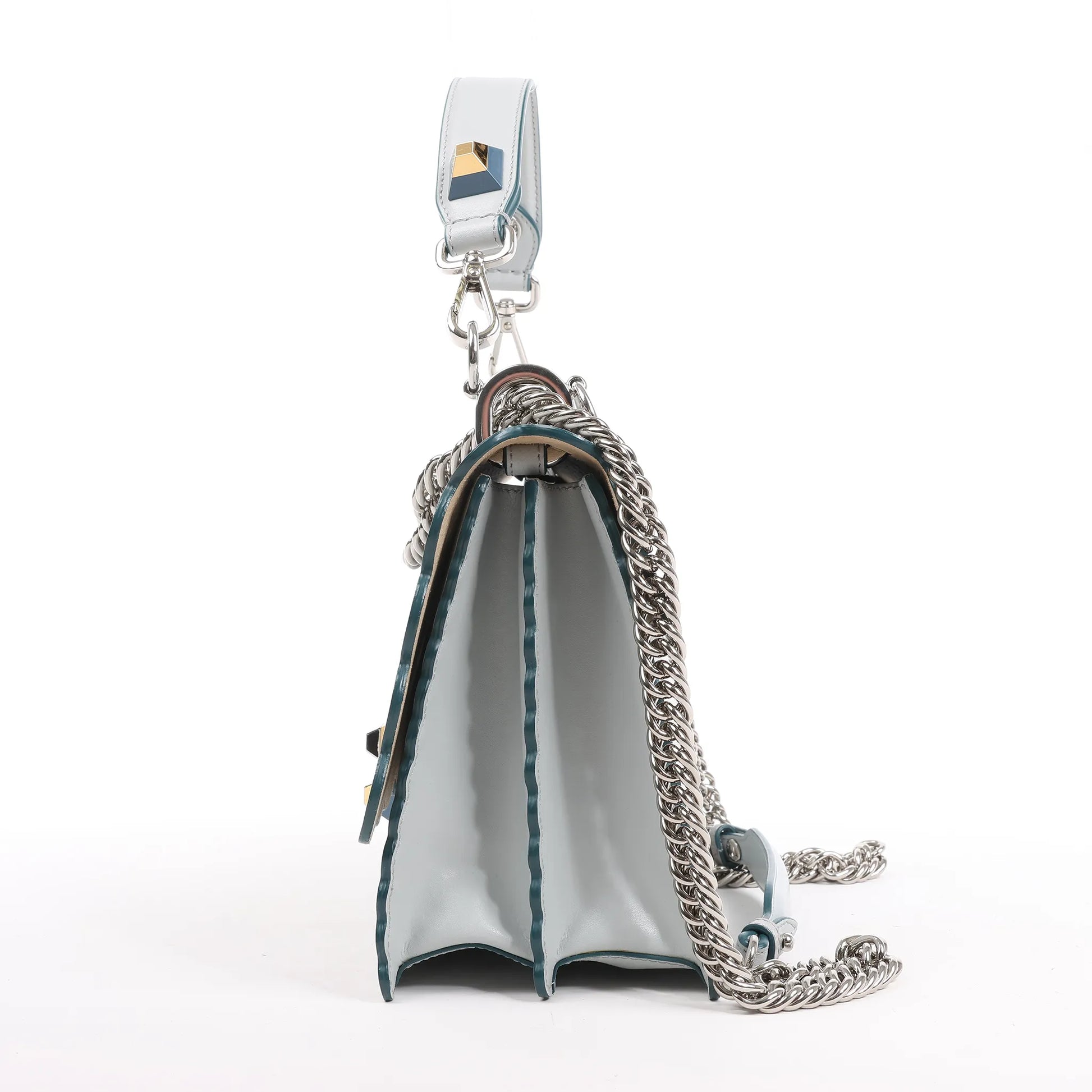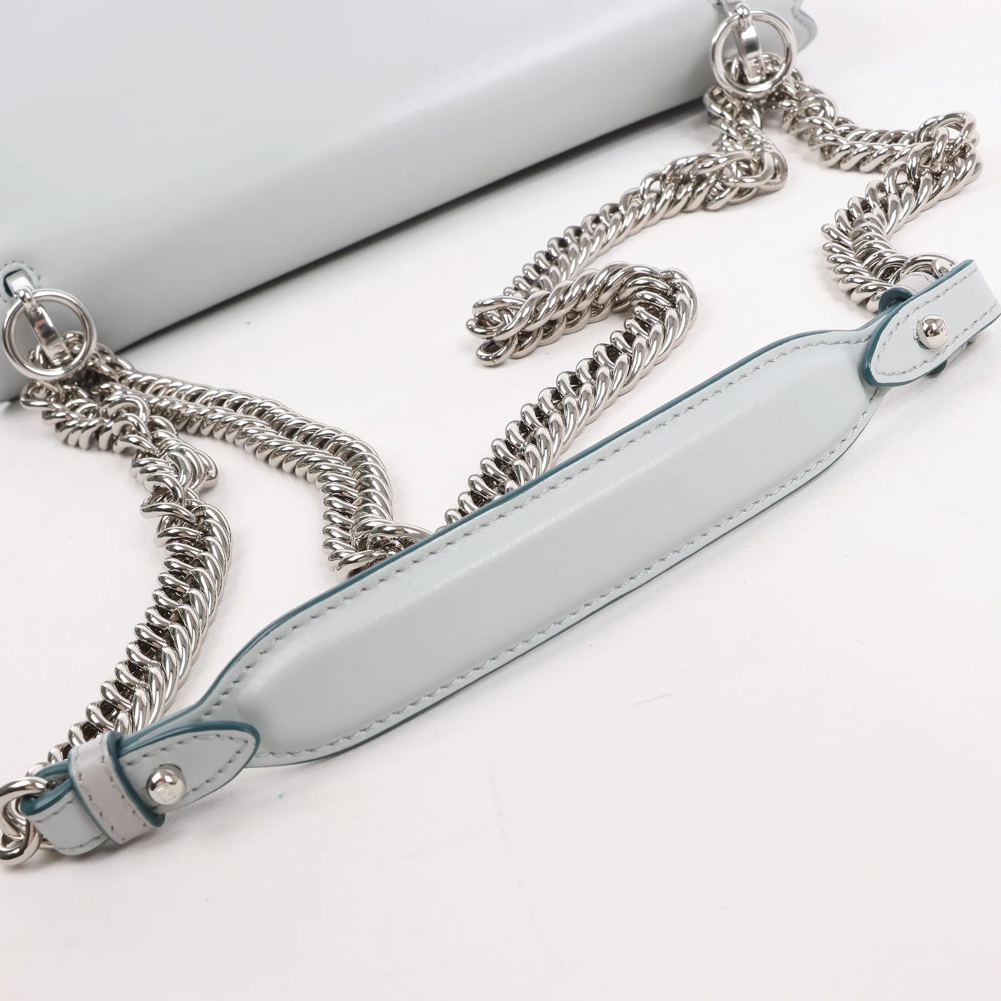 Le sac à main FENDI Kan I 2Way 8BT283 en cuir bleu souple arbore d'élégants bords festonnés et des clous pyramidaux emblématiques. Conçu pour un porté polyvalent avec une poignée supérieure et une bandoulière chaîne, il allie charme féminin et luxe italien audacieux.