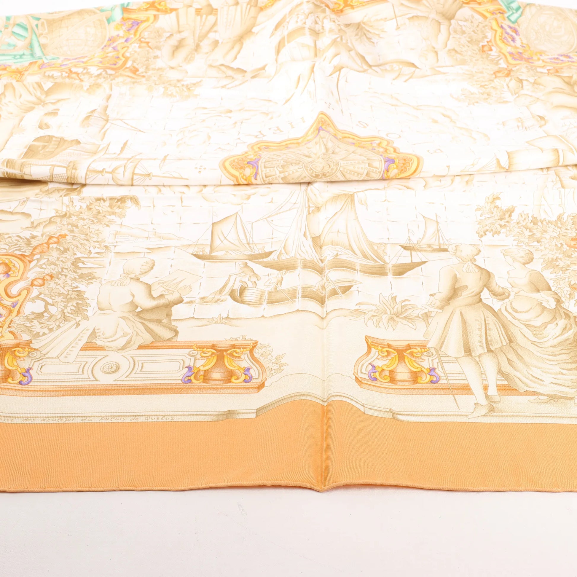 Le carré de soie Hermès « Azulejos » orange est un hommage raffiné à l’art ancestral des azulejos portugais. Orné de motifs nautiques et cartographiques complexes dans des tons neutres chauds et des touches vert d’eau, ce carré de soie en sergé dégage une élégance cosmopolite.