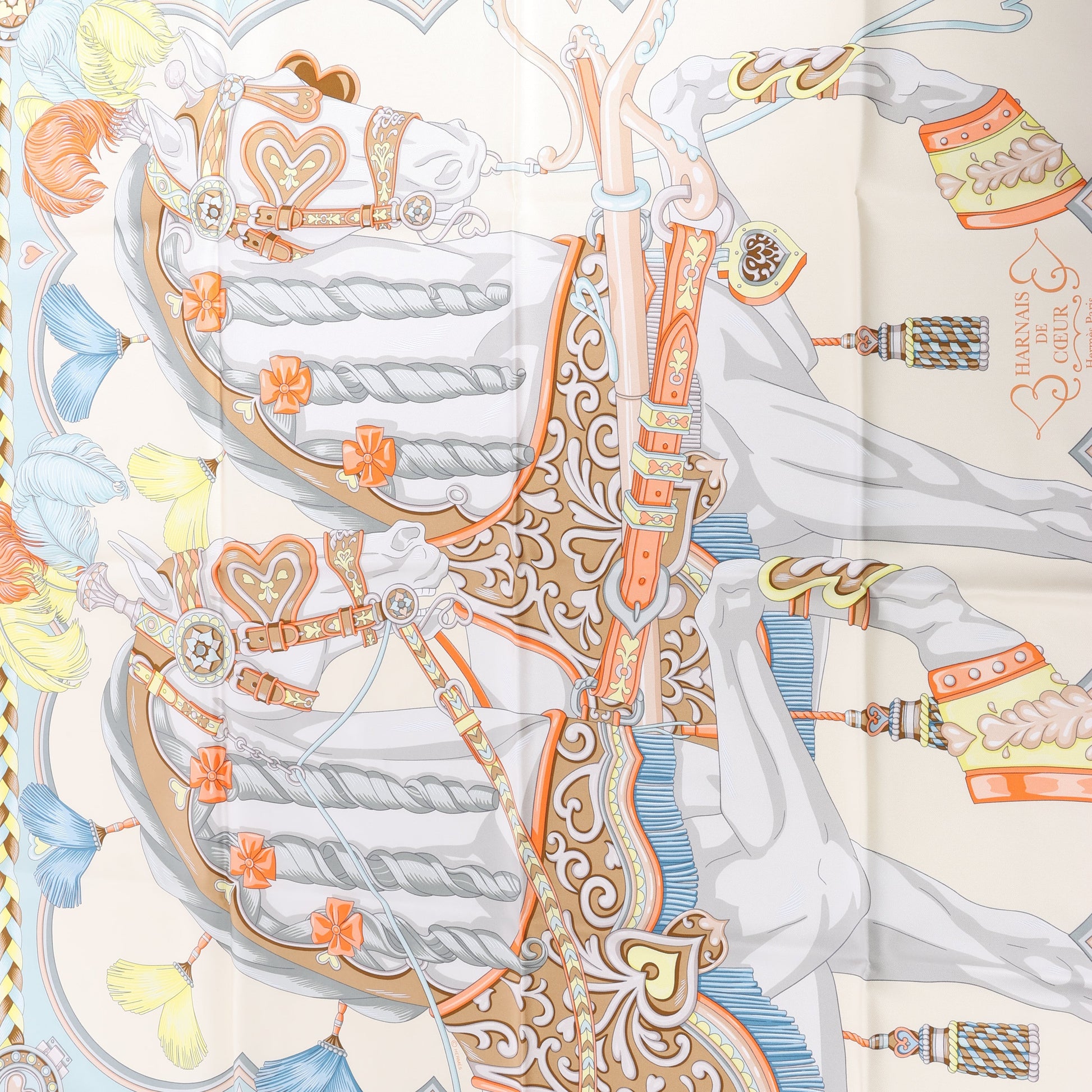 Le carré de soie « Harnais de Cœur » d'Hermès est un hommage magistral à l'élégance équestre, mettant en scène une représentation complexe de harnais de chevaux richement décorés.