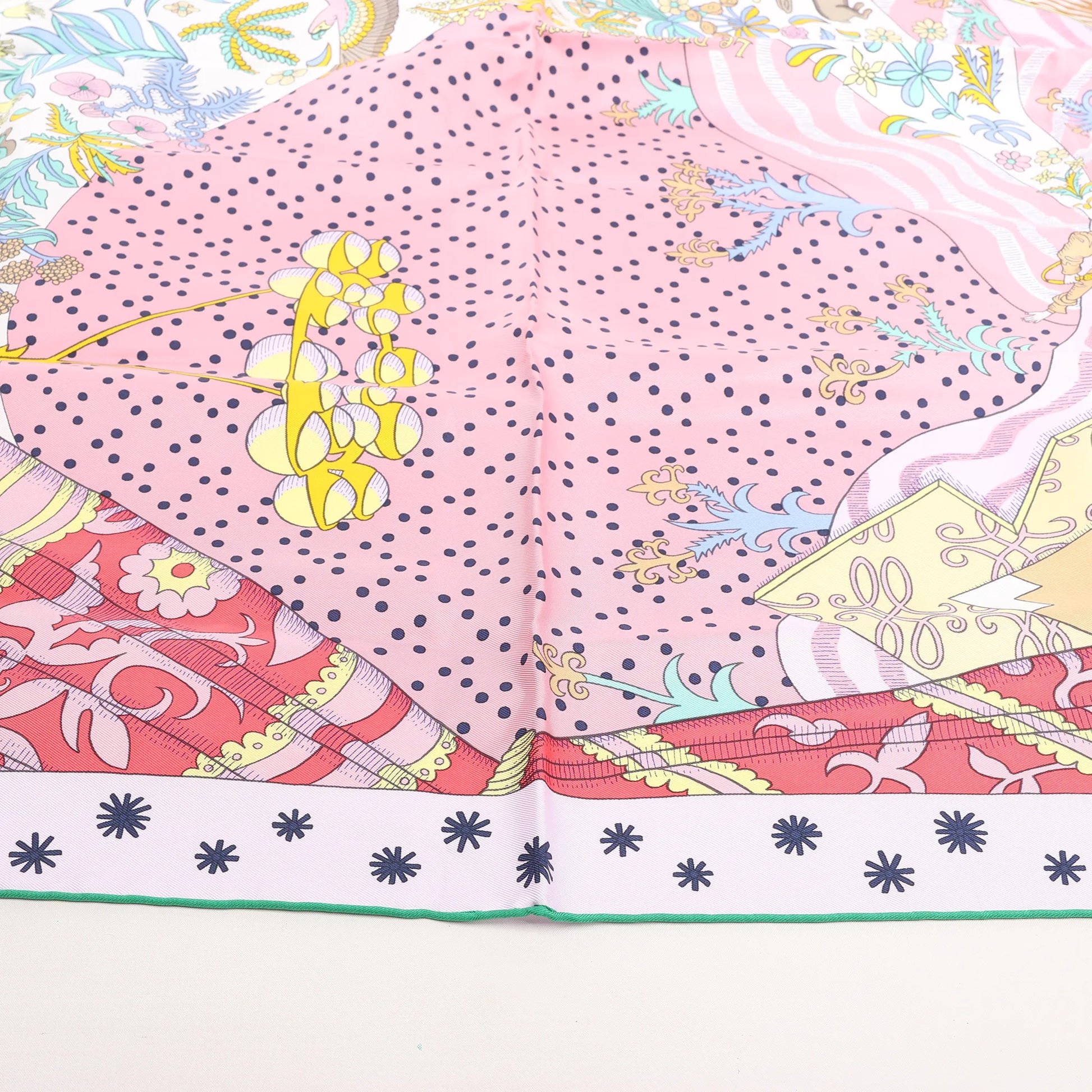 Discover the Hermès Carré 90 "Le Premier Chant" in Pink, a luxurious silk scarf showcasing a whimsical, storybook-inspired design with vibrant colors and intricate detail - an artistic piece that adds elegance and character to any ensemble.