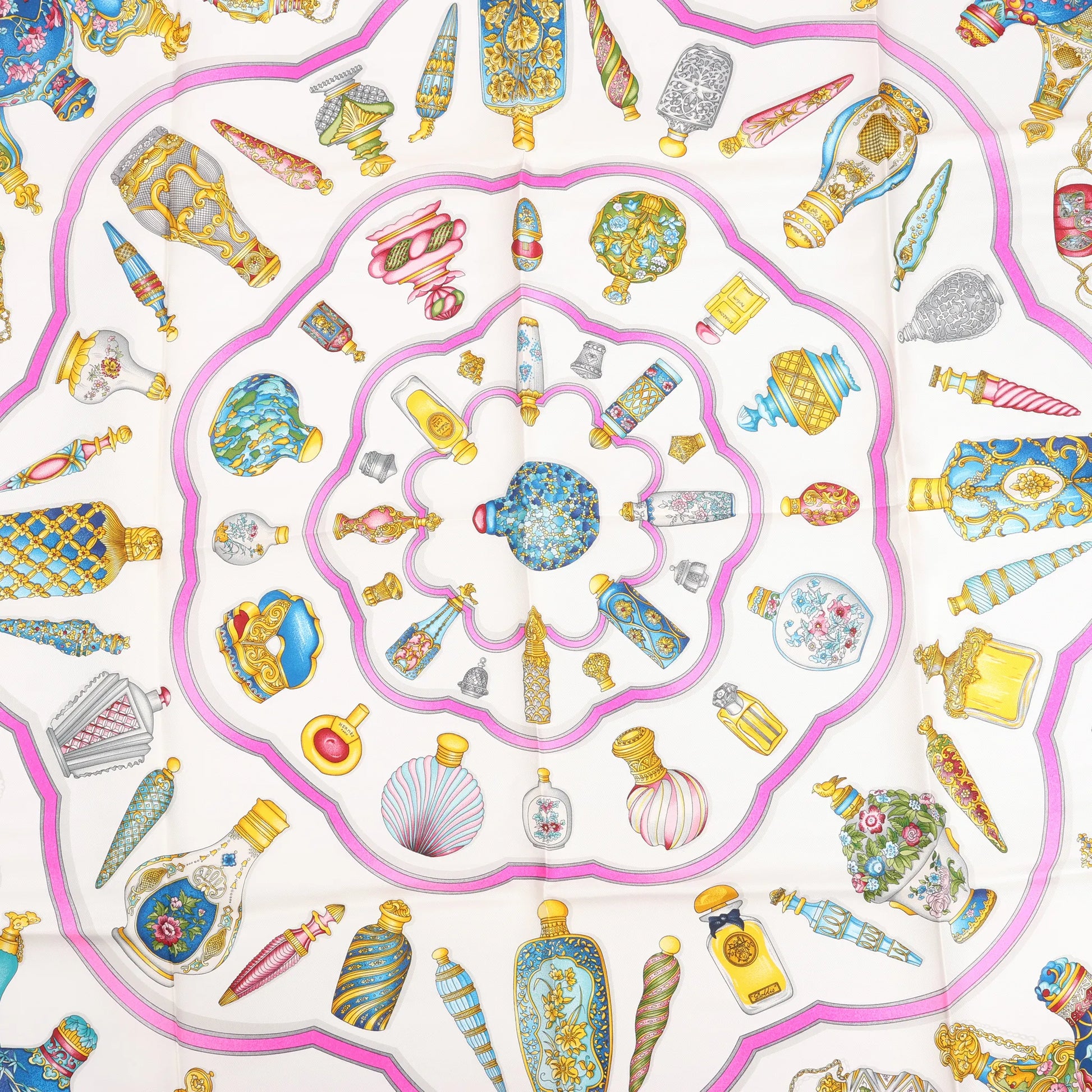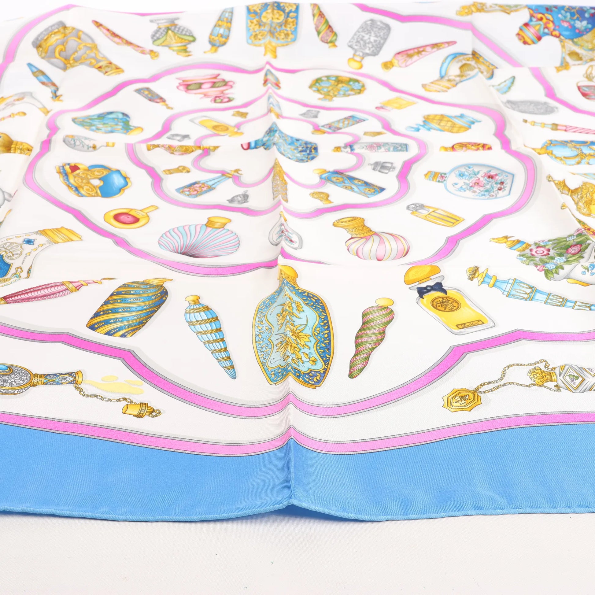 Le carré Hermès 90 « Qu'importe Le Flacon » bleu célèbre l'art du parfum. Confectionné en soie, cet élégant carré présente une exquise collection de flacons de parfum vintage disposés en cercle – féminin, de collection et d'un chic indéniable.