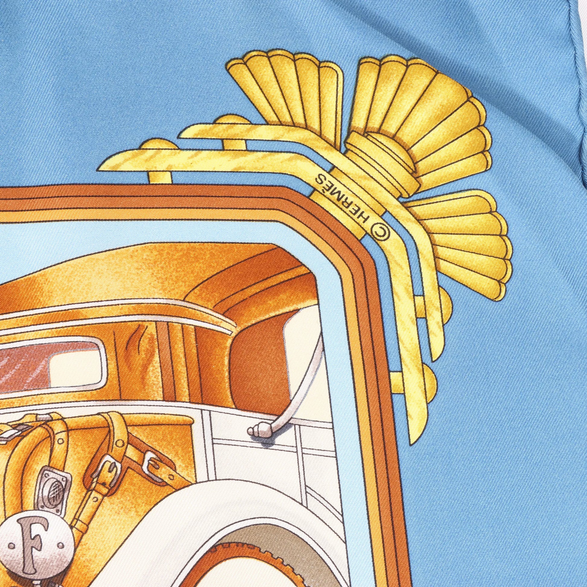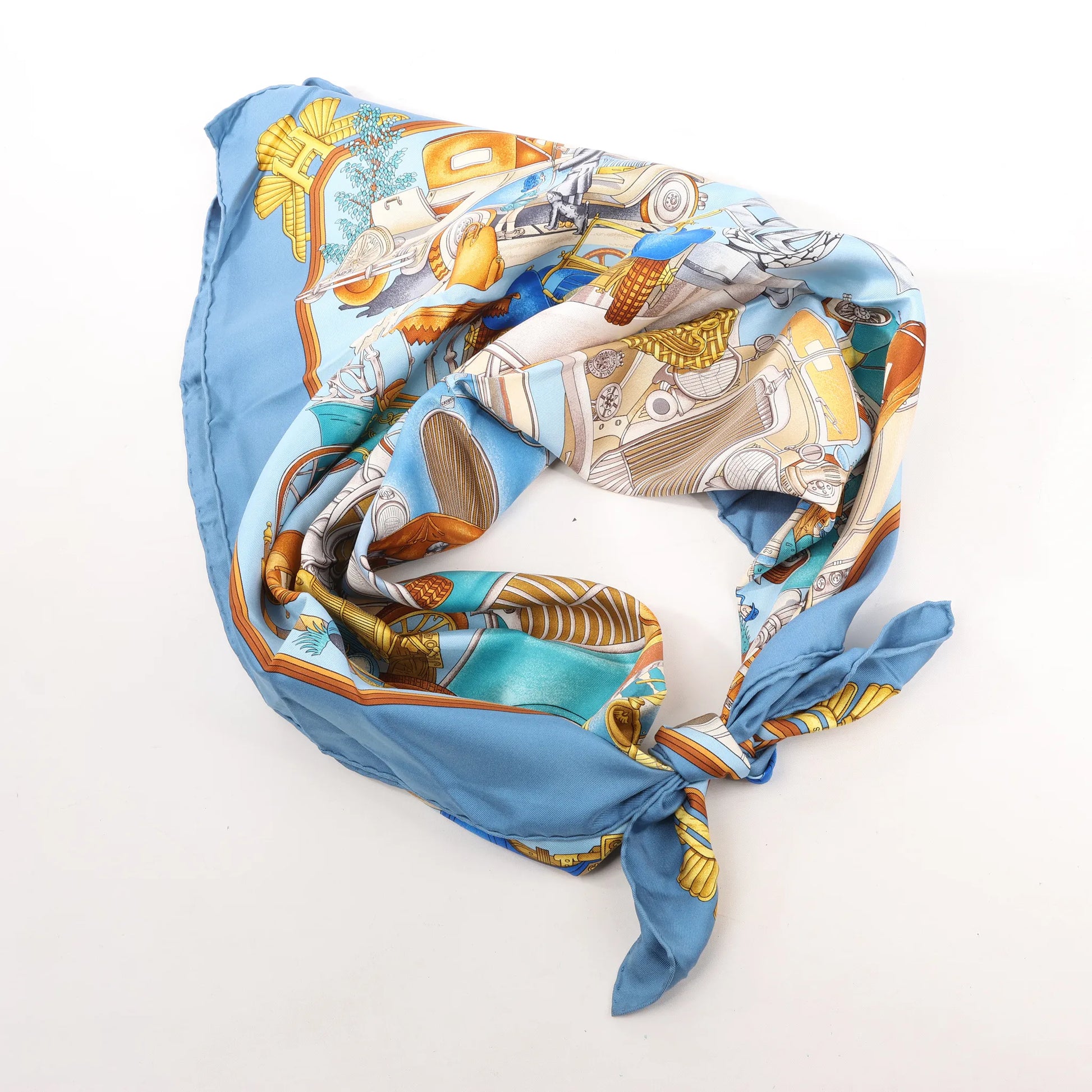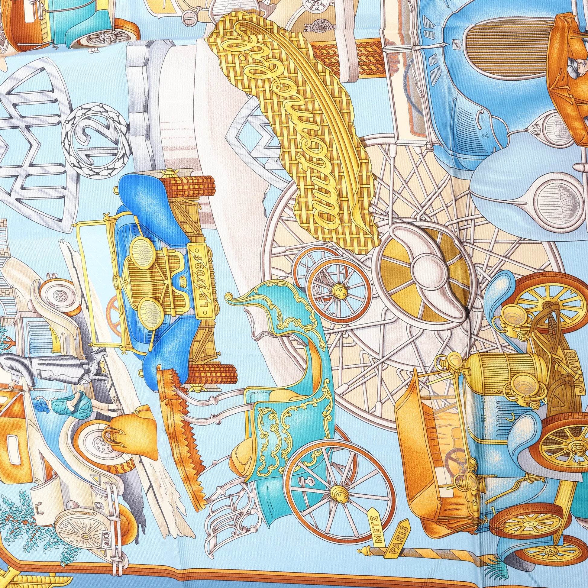 Le carré de soie Hermès 90 « Saint Christophe et l’Enfant » bleu est un vibrant hommage aux automobiles anciennes et au saint patron des voyageurs. Confectionné en luxueux twill de soie, il présente des illustrations de voitures finement ciselées, rehaussées de touches dorées et empreintes de nostalgie.