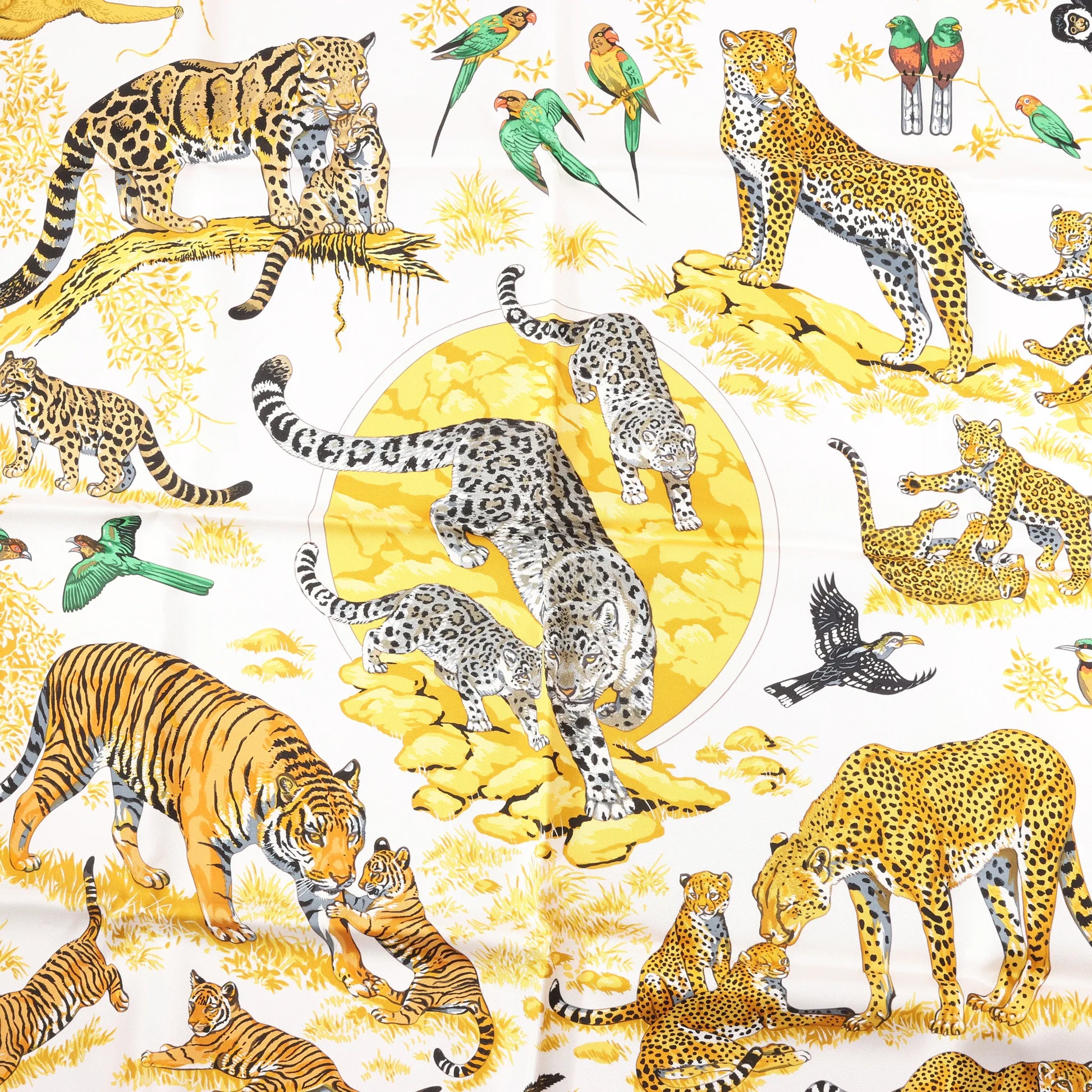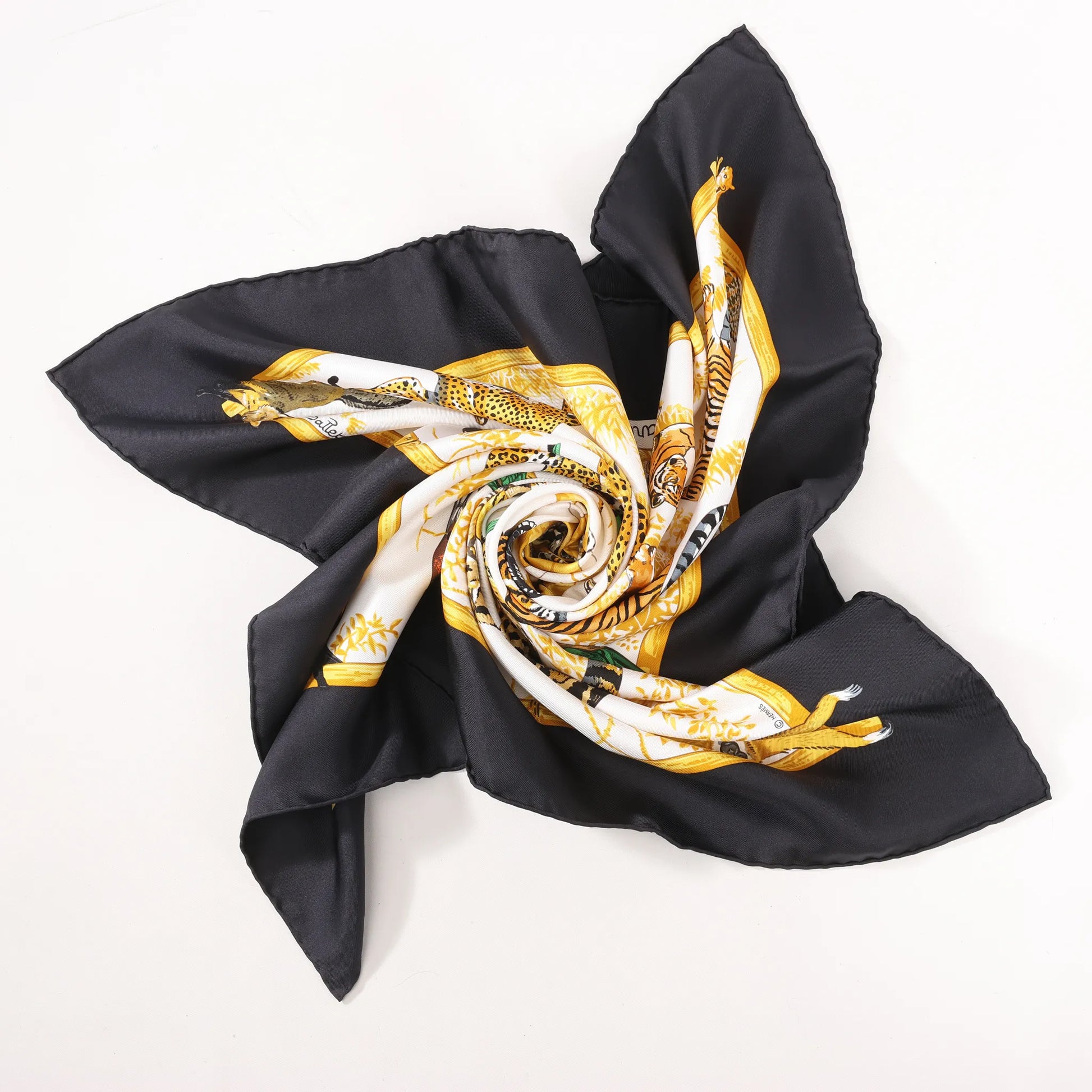 Le carré Hermès 90 « Tendresse Féline » noir et jaune capture l’élégance sauvage des grands félins sur une toile de soie somptueuse, mêlant luxe et art inspiré par la nature.