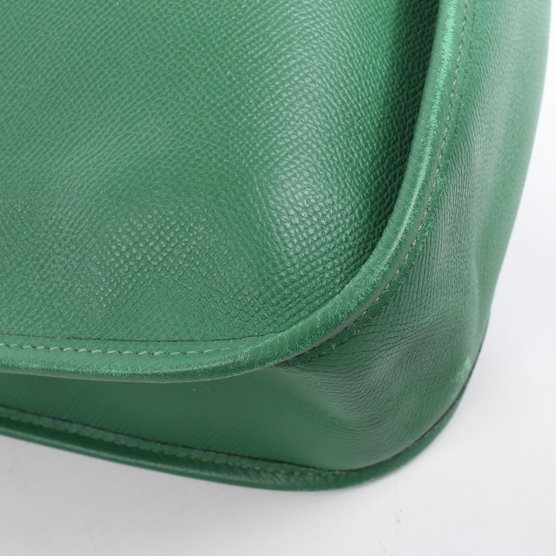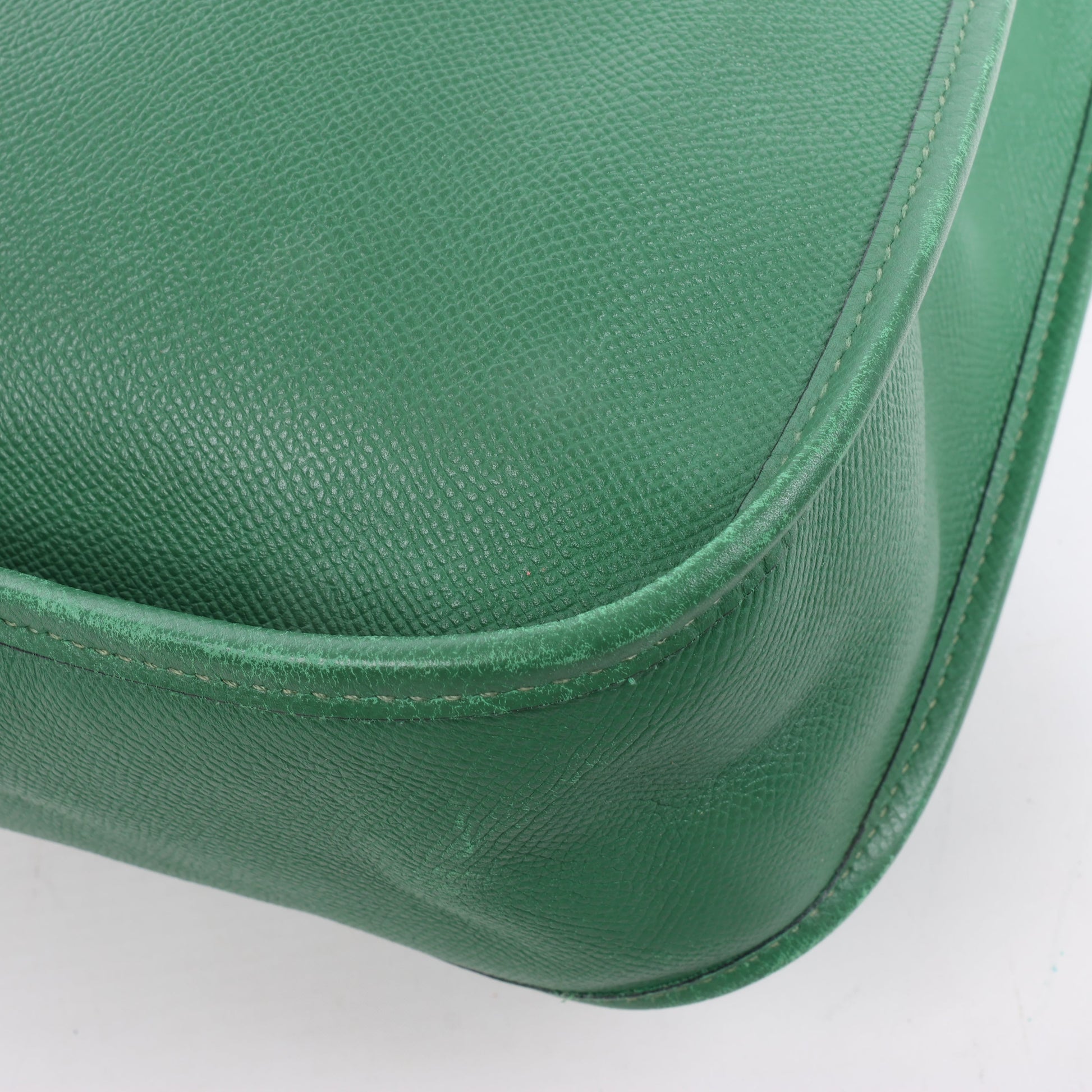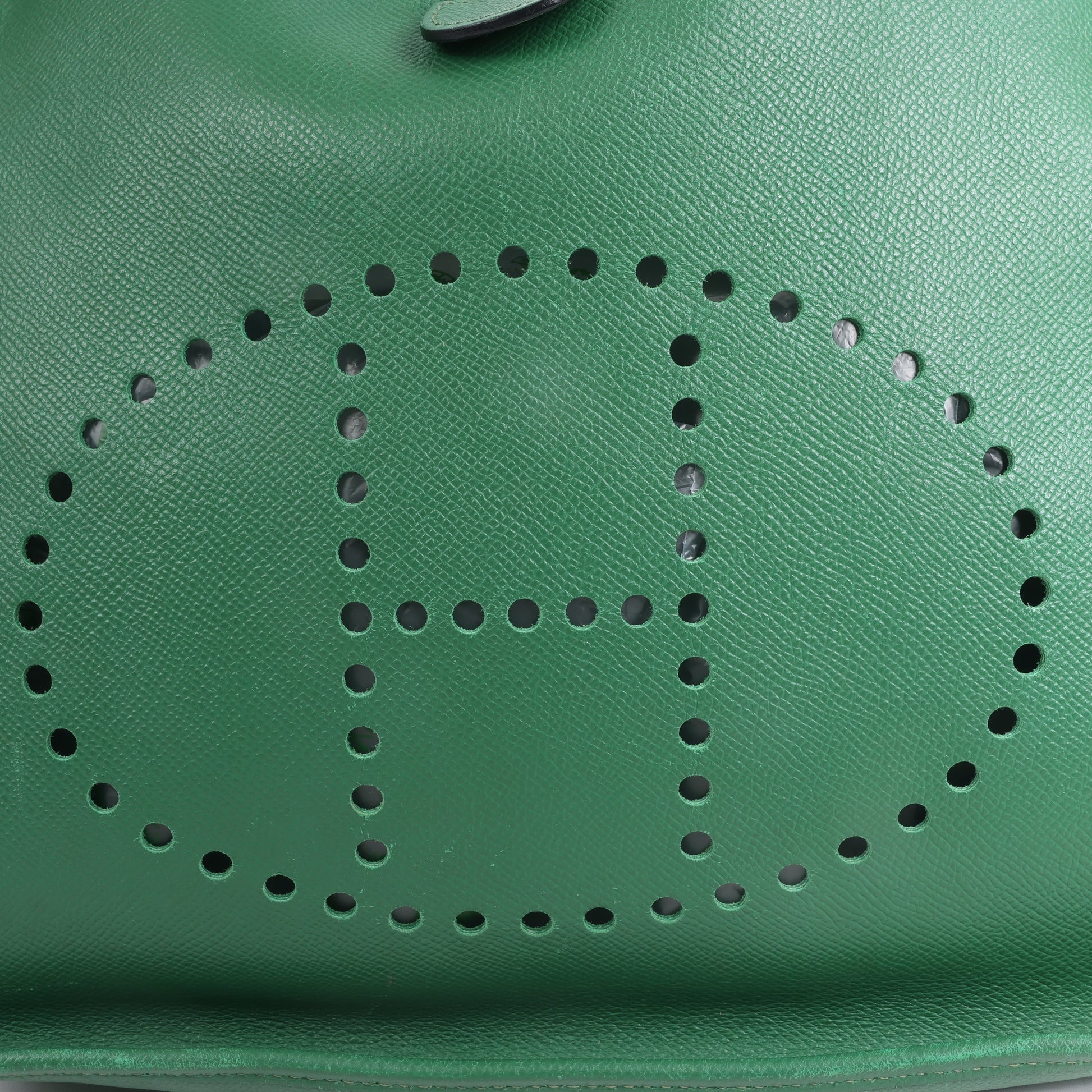 Hermès Evelyne I 33 GM in vibrant green cushbell leather, B: 1998. Features signature perforated “H”, adjustable strap, and silver-tone hardware—casual luxury with iconic flair.