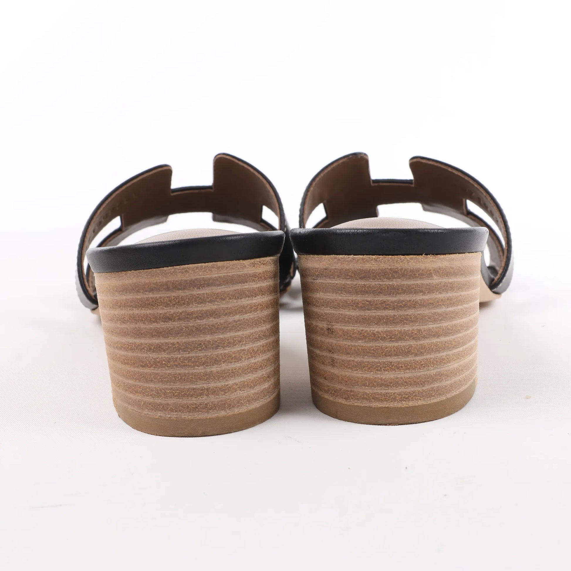 Sublimez votre élégance au quotidien avec les sandales HERMES OASIS en pointure 37,5. Confectionnées en cuir noir premium, ornées de découpes « H » emblématiques et d'un talon bottier confortable, ces mules chics allient style intemporel et confort naturel.